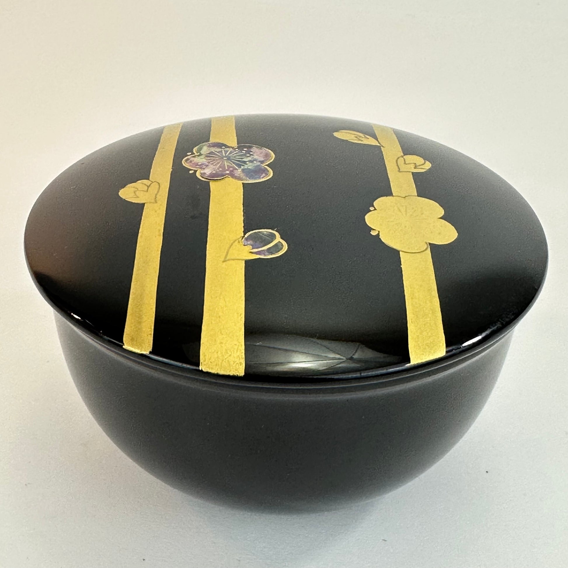 The exterior is decorated with restrained gold maki-e depicting plum blossoms (ume). One blossom incorporates a small raden (mother-of-pearl) inlay, introducing a subtle iridescent accent within the otherwise gold decoration. The design is spaced and deliberate, allowing the black lacquer ground to remain dominant.