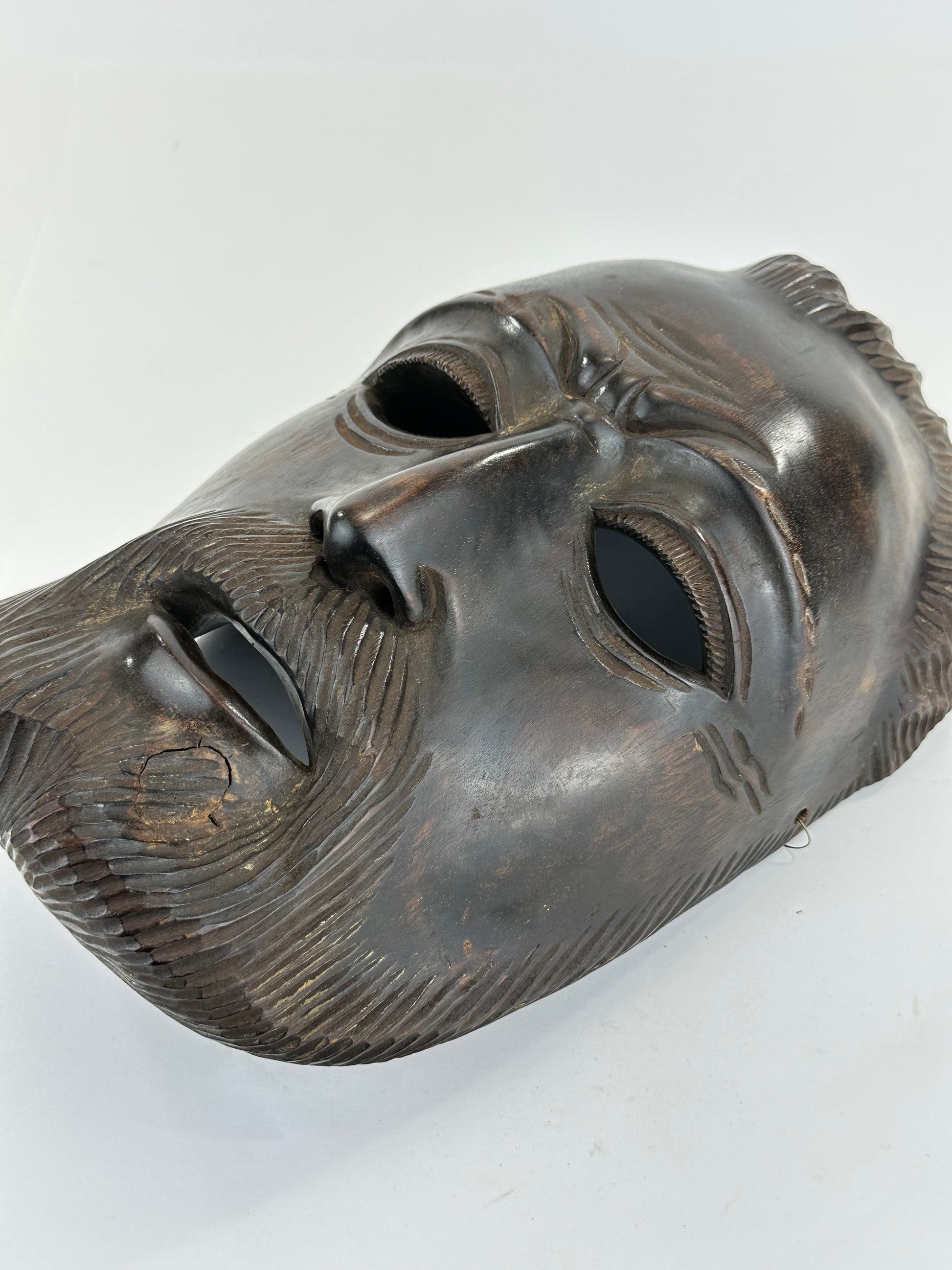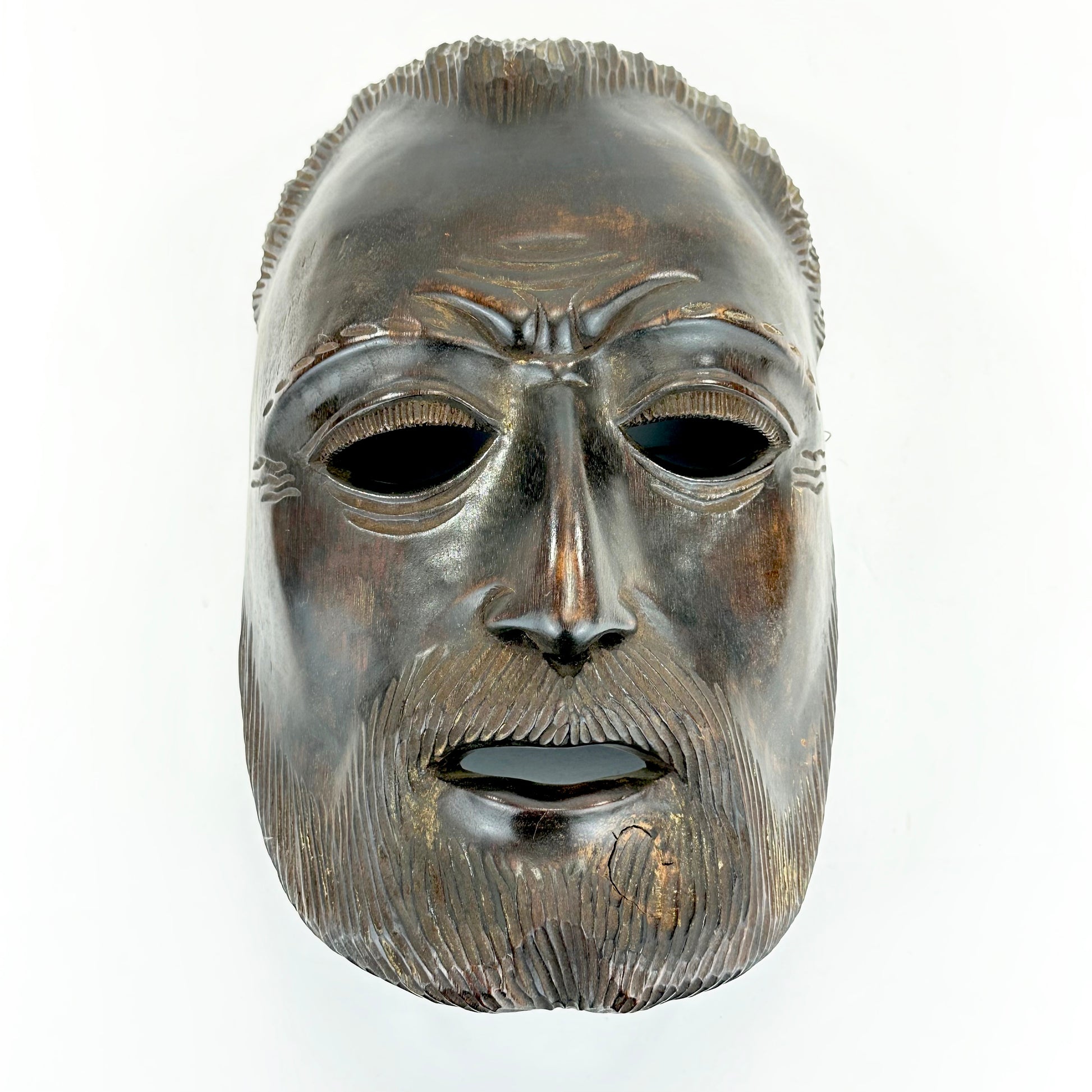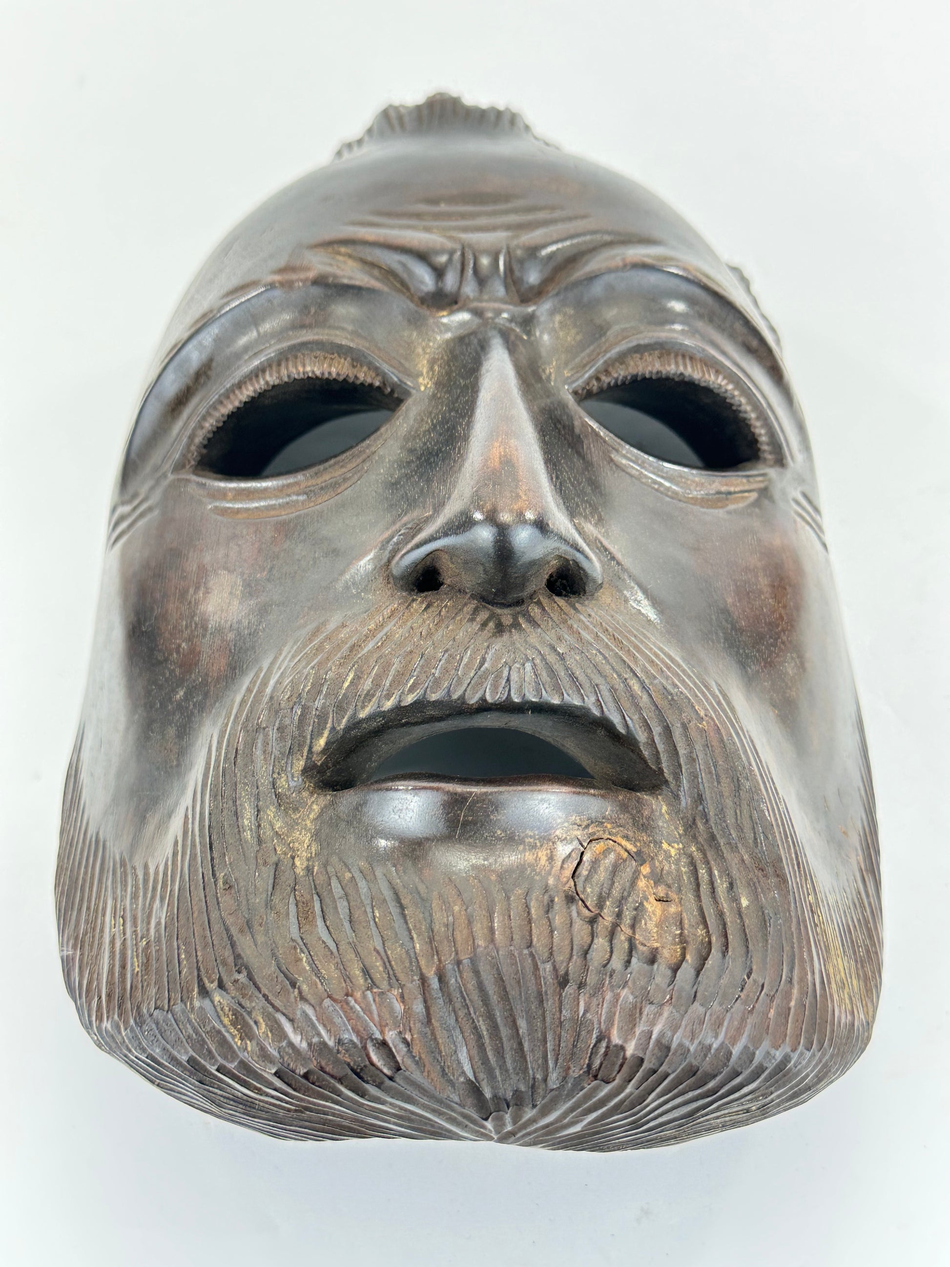 Japanese mask-carving has been an esteemed craft since the Heian period (794–1185), most famously associated with the refined masks used in Noh and Kyōgen theatre, as well as the fierce protective spirits depicted in festival traditions such as Namahage in Akita. Though this example was carved in the 1950s for decorative display rather than stage performance, it reflects the same artistic vocabulary: exaggerated expressions, carefully formed contours, and deep chisel work meant to convey intense emotion and spiritual presence. During the post–World War II years, many highly skilled craft workshops in regions such as Takayama (Hida), Nara, Kyoto, and Nagoya produced individually carved masks.