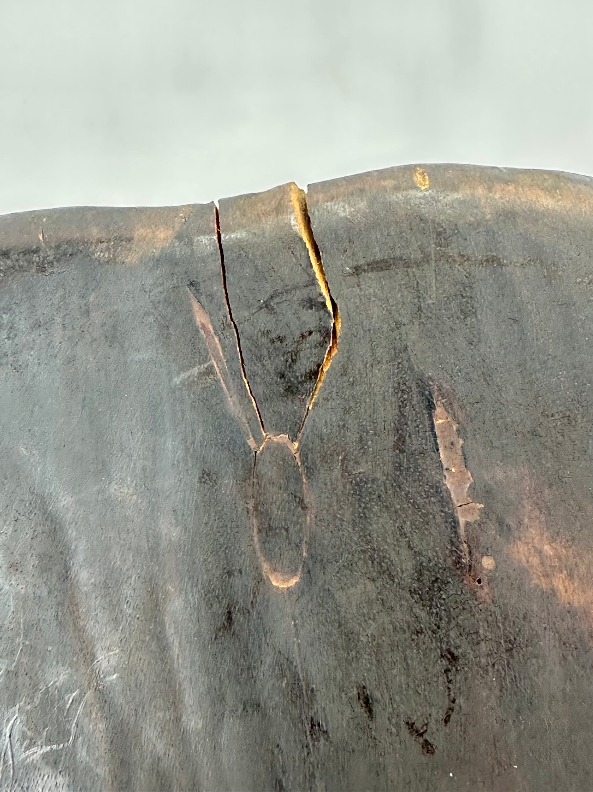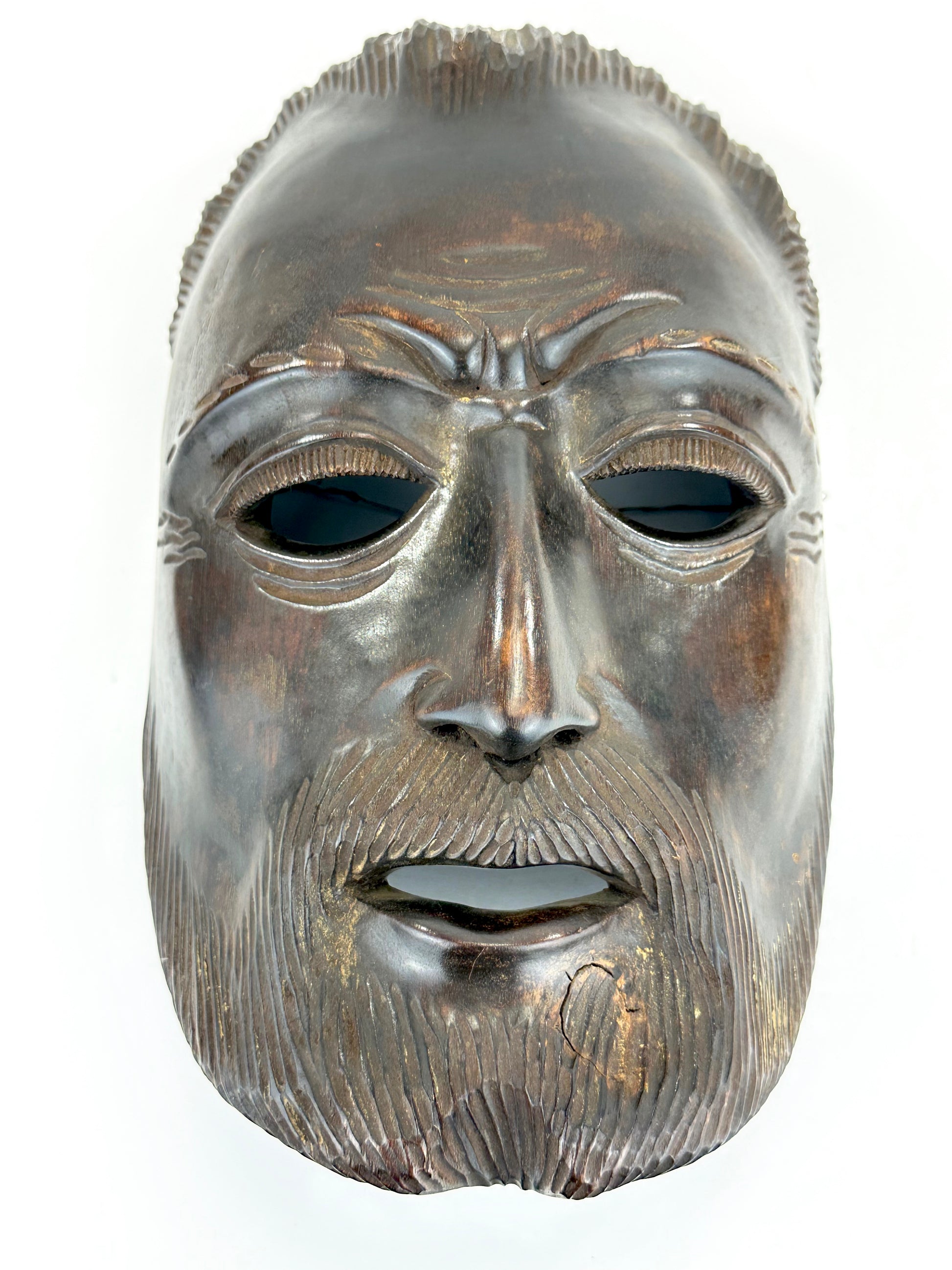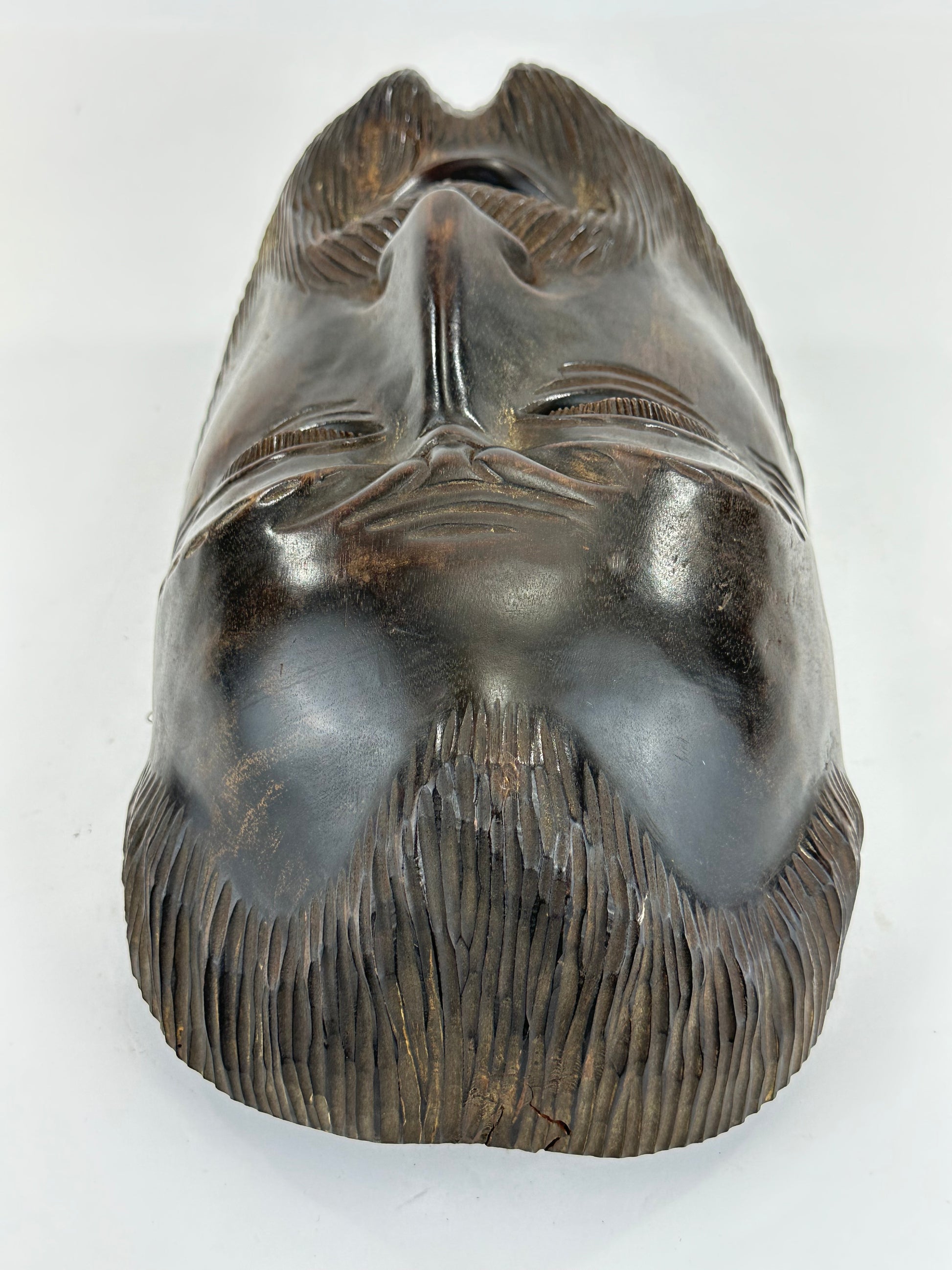 Japanese mask-carving has been an esteemed craft since the Heian period (794–1185), most famously associated with the refined masks used in Noh and Kyōgen theatre, as well as the fierce protective spirits depicted in festival traditions such as Namahage in Akita. Though this example was carved in the 1950s for decorative display rather than stage performance, it reflects the same artistic vocabulary: exaggerated expressions, carefully formed contours, and deep chisel work meant to convey intense emotion and spiritual presence. During the post–World War II years, many highly skilled craft workshops in regions such as Takayama (Hida), Nara, Kyoto, and Nagoya produced individually carved masks.