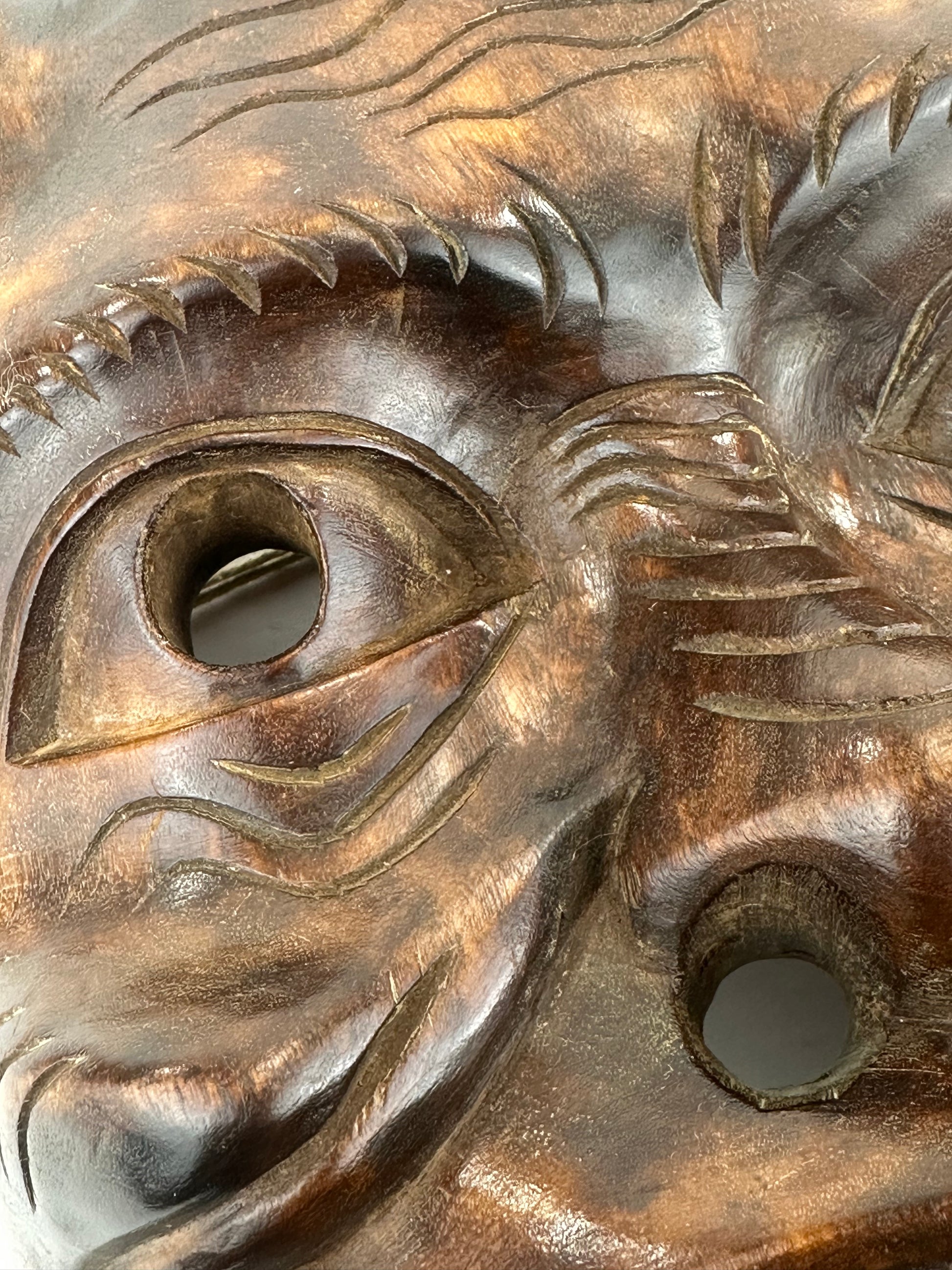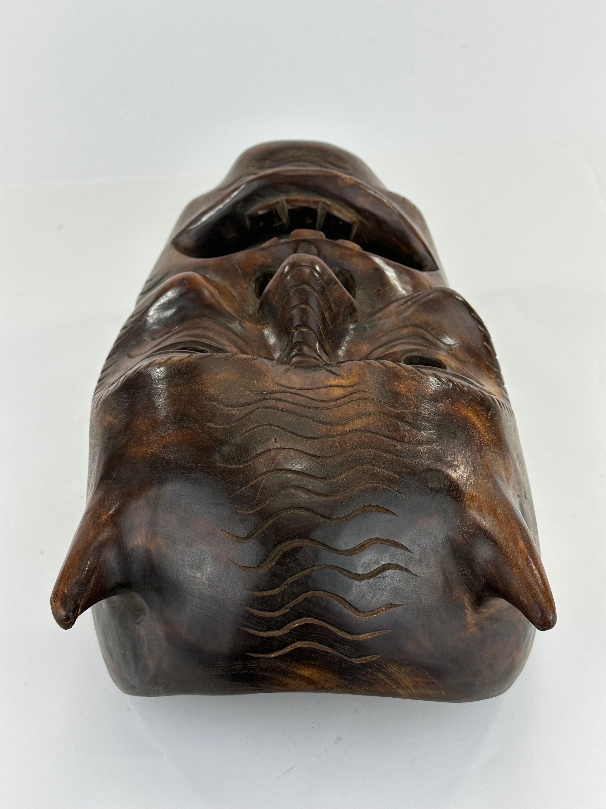 Japanese mask-carving has been an esteemed craft since the Heian period (794–1185), most famously associated with the refined masks used in Noh and Kyōgen theatre, as well as the fierce protective spirits depicted in festival traditions such as Namahage in Akita. Though this example was carved in the 1950s for decorative display rather than stage performance, it reflects the same artistic vocabulary: exaggerated expressions, carefully formed contours, and deep chisel work meant to convey intense emotion and spiritual presence. During the post–World War II years, many highly skilled craft workshops in regions such as Takayama (Hida), Nara, Kyoto, and Nagoya produced individually carved masks.