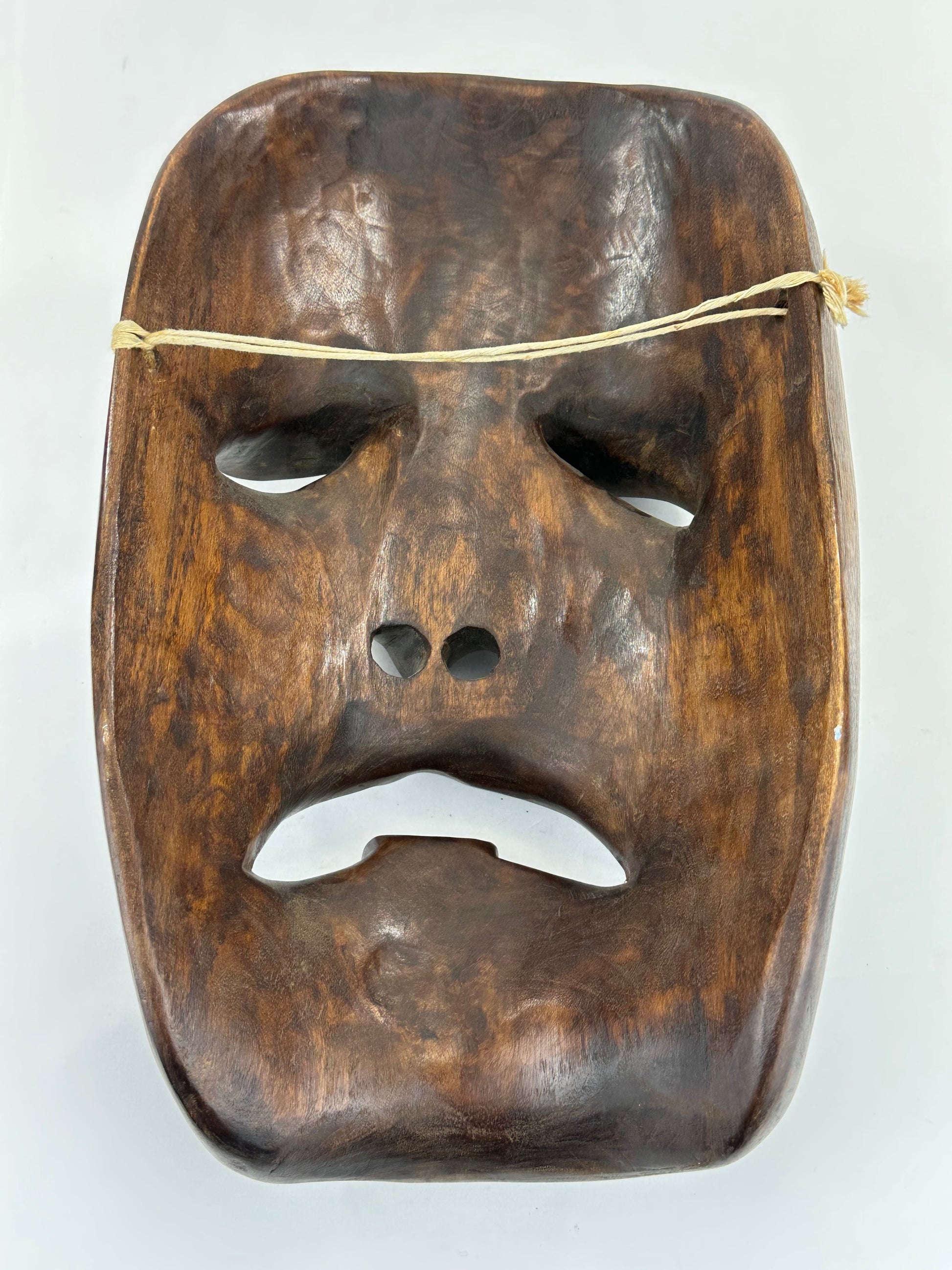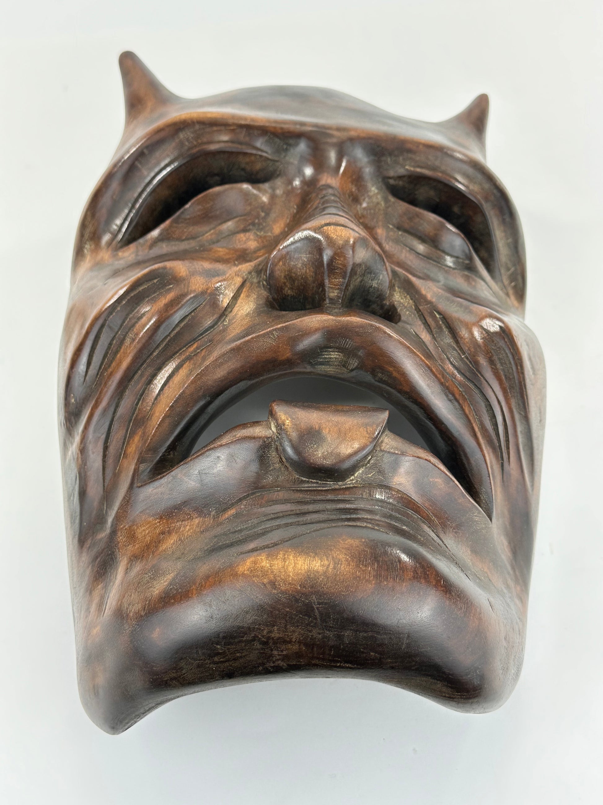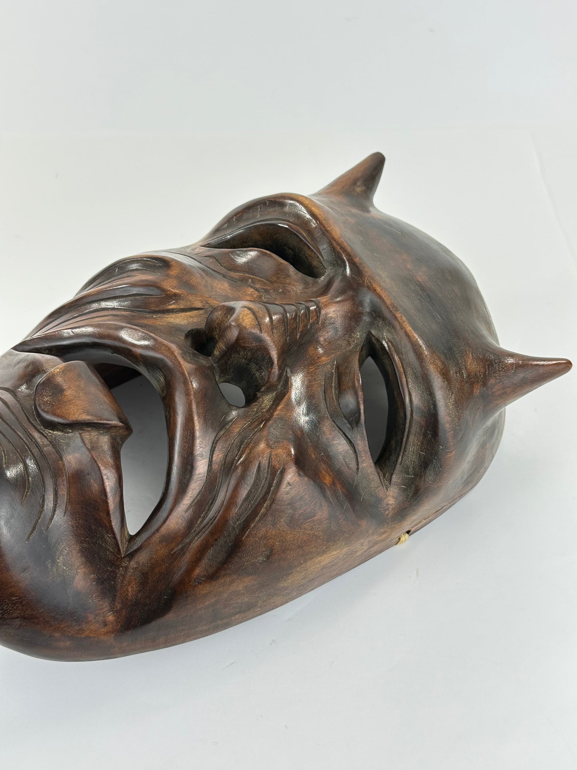 Japanese mask-carving has been an esteemed craft since the Heian period (794–1185), most famously associated with the refined masks used in Noh and Kyōgen theatre, as well as the fierce protective spirits depicted in festival traditions such as Namahage in Akita. Though this example was carved in the 1950s for decorative display rather than stage performance, it reflects the same artistic vocabulary: exaggerated expressions, carefully formed contours, and deep chisel work meant to convey intense emotion and spiritual presence. During the post–World War II years, many highly skilled craft workshops in regions such as Takayama (Hida), Nara, Kyoto, and Nagoya produced individually carved masks.