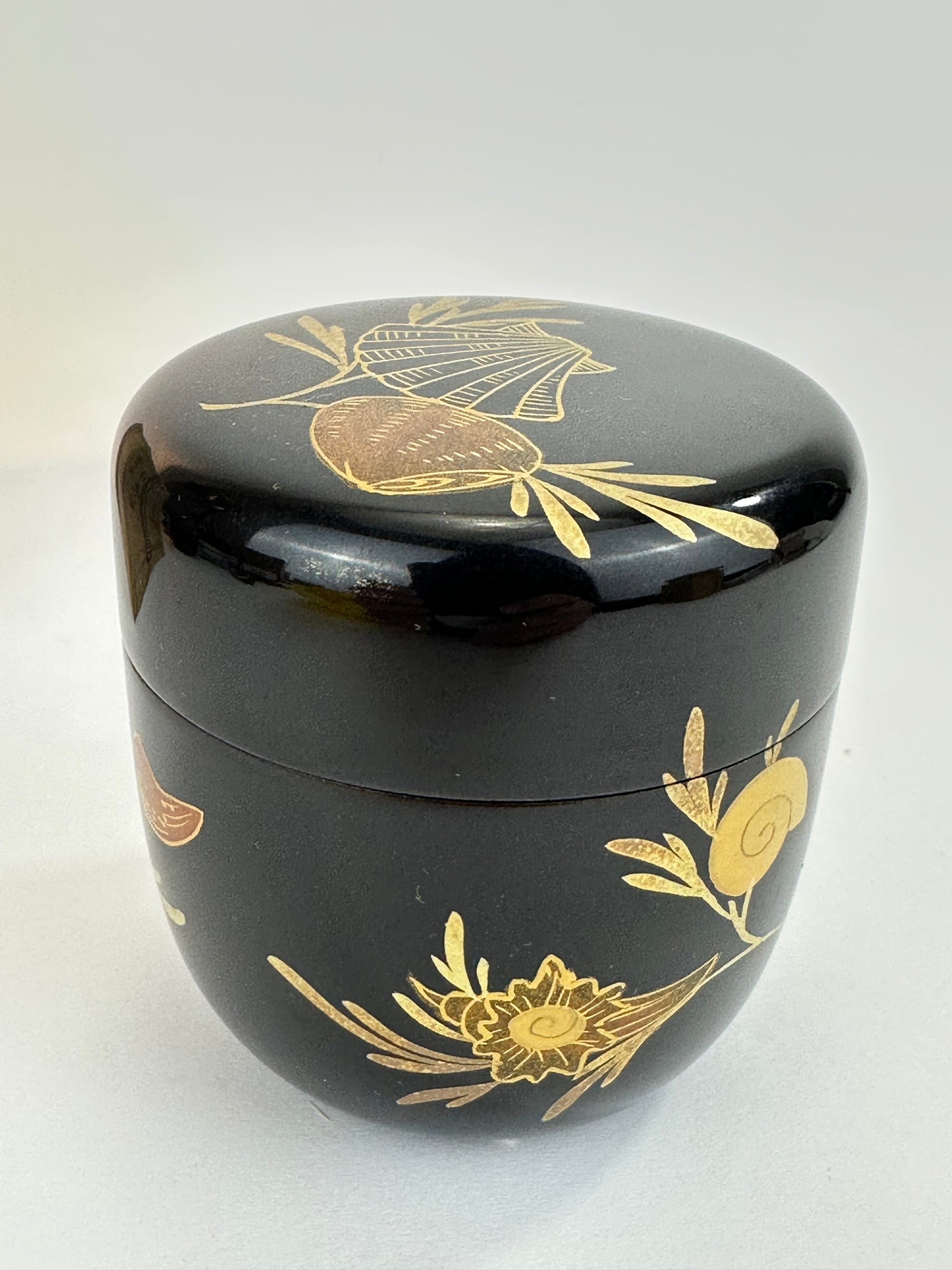 This Japanese tea ceremony chu-natsume is finished in deep black lacquer and decorated in gold maki-e with an allover seashell motif. Fan-shaped and rounded shell forms are rendered in fine line work and soft gold tones, interspersed with gently curving stems that unify the design across the lid and body.