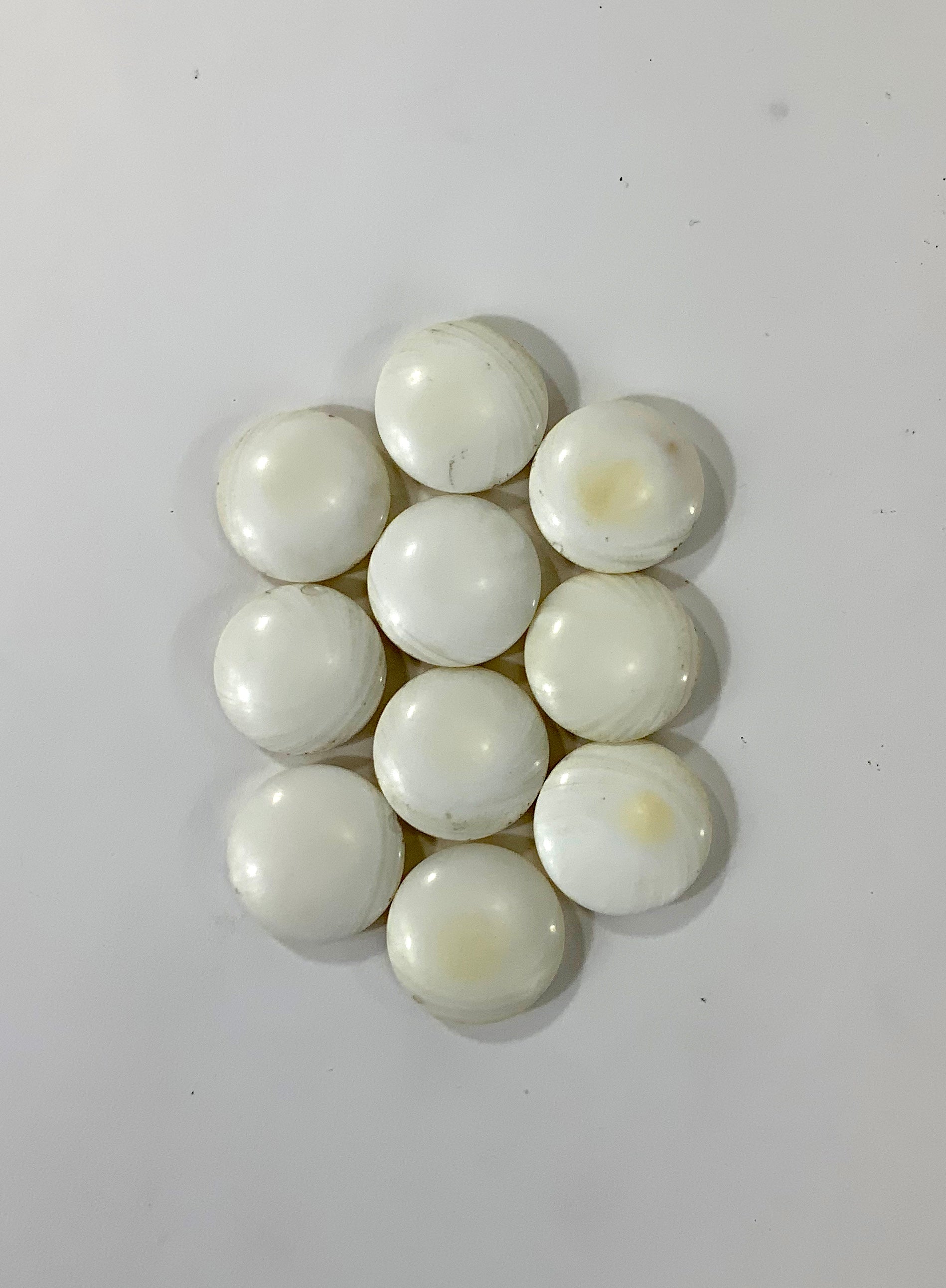Total of 10 pieces: White Shell 9mm. These vintage or possibly antique c. 1920 to 1950 go stones or goke were pulled from partial sets. Our hope is that if you are a Go player but have lost a few stones here and there you can find a close match to bring your count back up to a full set (181 black and 180 white). We typically sell full sets with the hand turned wooden bowls. White stones can be made of shell, and the black are made of slate.