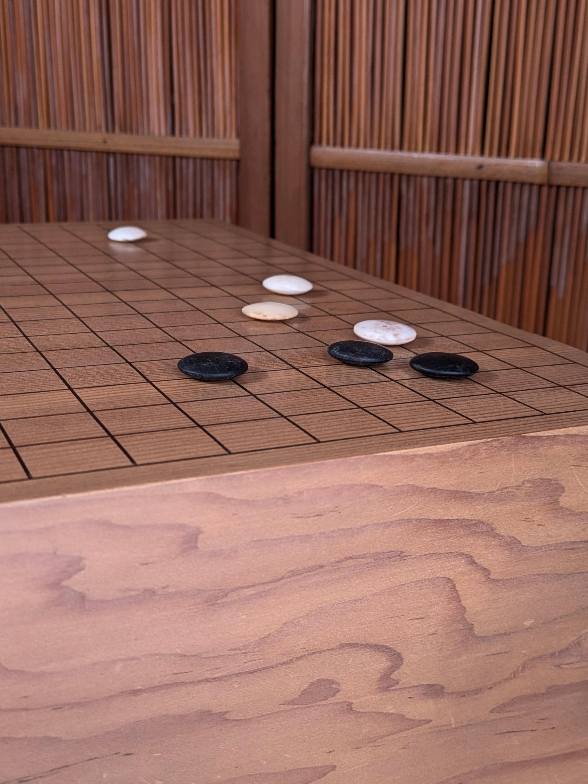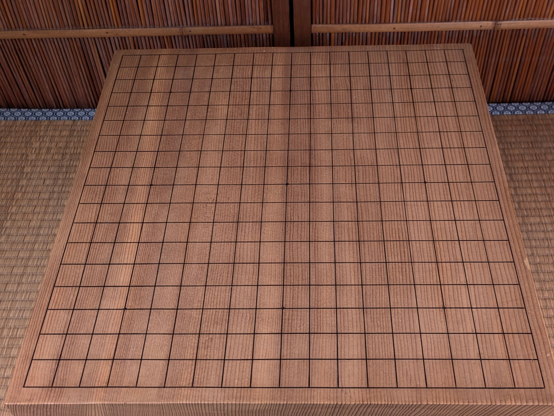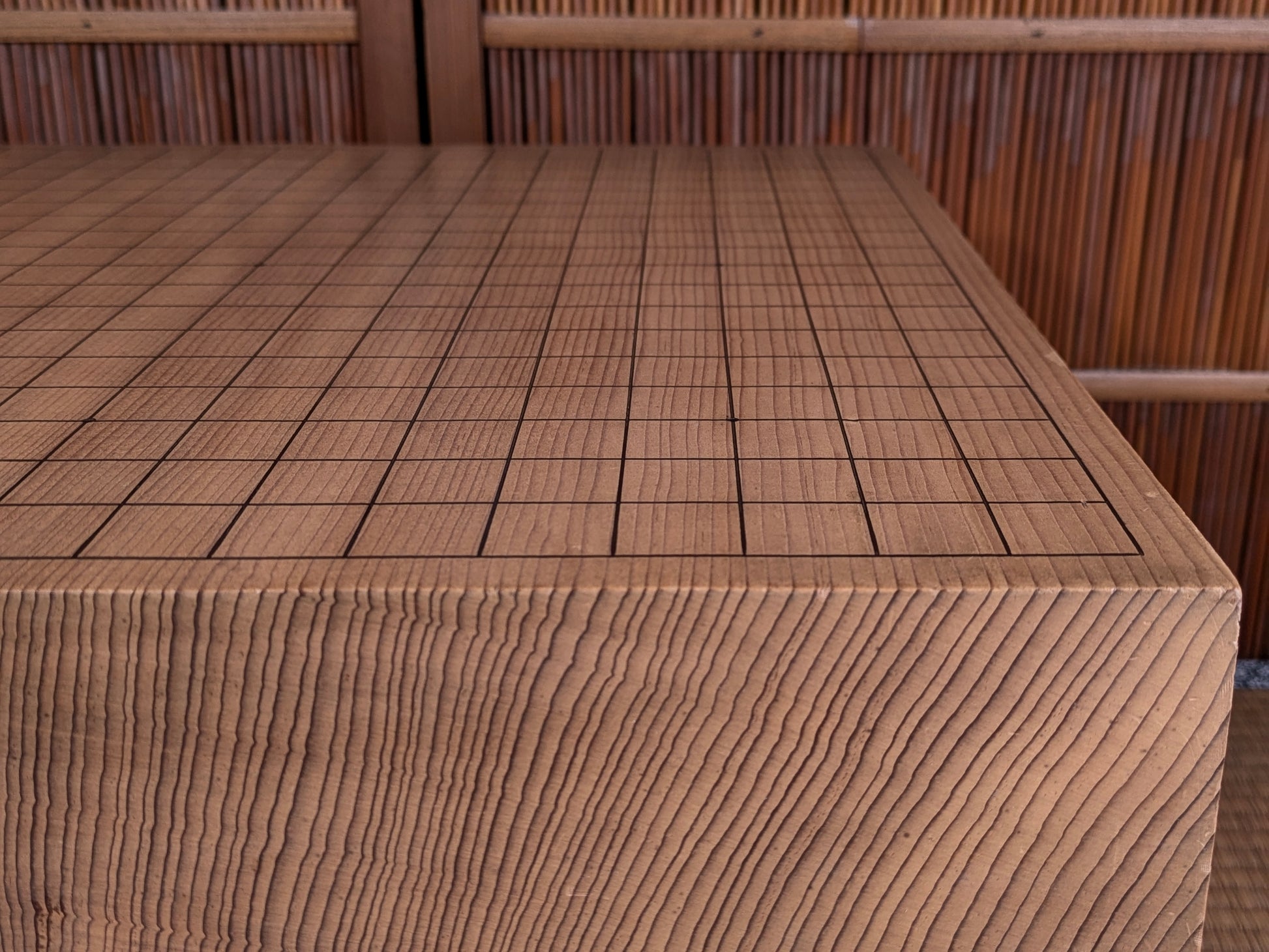 Playing Go on a real Japanese floor board is a different experience from using a thin tabletop board. The thick wooden block produces a deeper, clearer click when stones are placed, a sound that the Nihon Ki-in has long described as part of the “proper atmosphere” of serious play. This resonance comes from both the thickness of the block and the type of wood used. Traditional makers favor kaya, a smooth, golden wood whose density and aging characteristics create a uniquely satisfying tone, but players also commonly encounter katsura, which is heavier and darker, and shin-kaya, a lighter spruce used in modern, affordable boards.