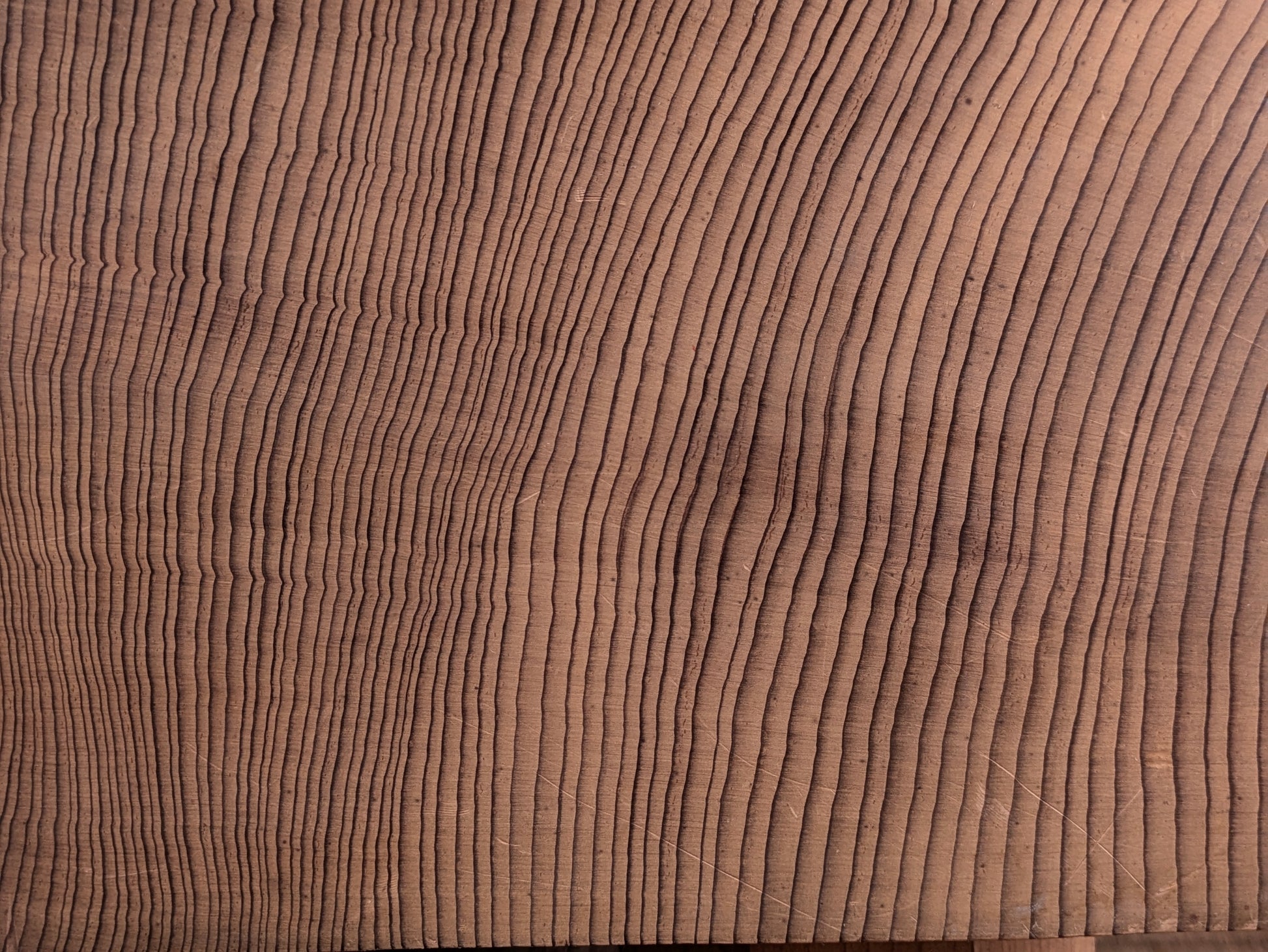 A substantial single-piece katsura goban showing exceptionally tight and even annual rings across the side faces and beautiful flowing figure on the opposite grain face. Katsura is prized in traditional Japanese go boards for durability, clear tone response, and the warm amber color it develops over decades of use. The board produces a clean sharp pachi sound when stones are placed, with excellent resonance.