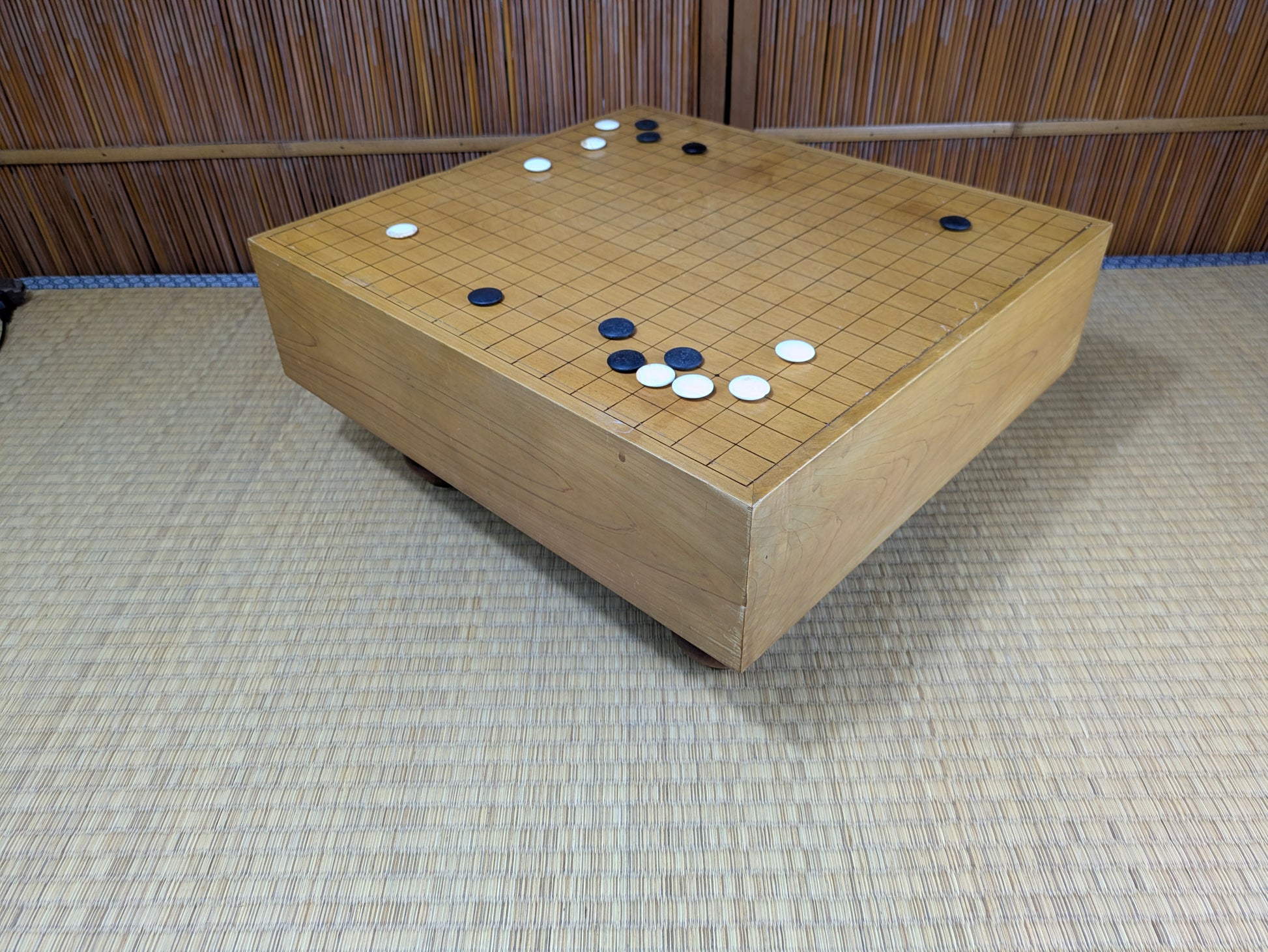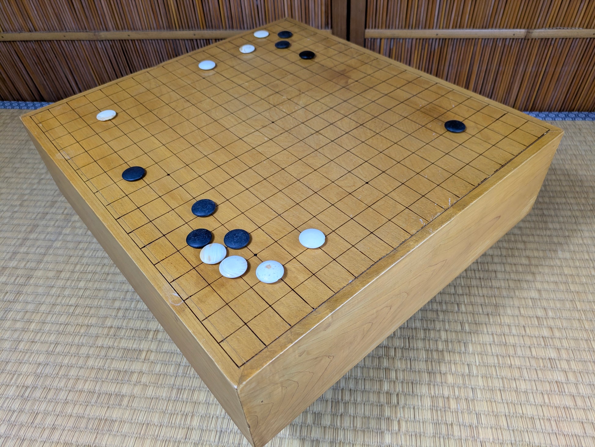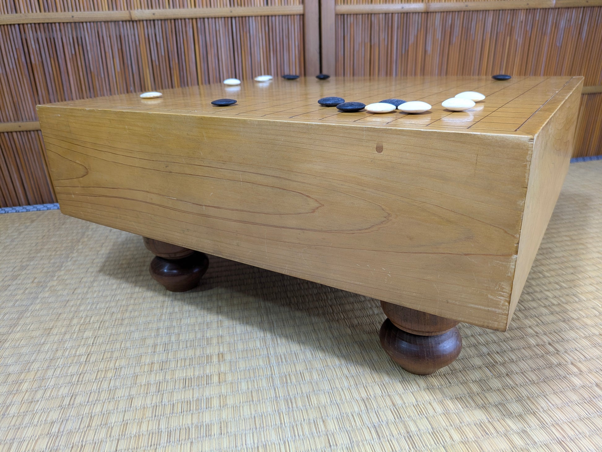 Playing Go on a real Japanese floor board is a different experience from using a thin tabletop board. The thick wooden block produces a deeper, clearer click when stones are placed, a sound that the Nihon Ki-in has long described as part of the “proper atmosphere” of serious play. This resonance comes from both the thickness of the block and the type of wood used. Traditional makers favor kaya, a smooth, golden wood whose density and aging characteristics create a uniquely satisfying tone, but players also commonly encounter katsura, which is heavier and darker, and shin-kaya, a lighter spruce used in modern, affordable boards.