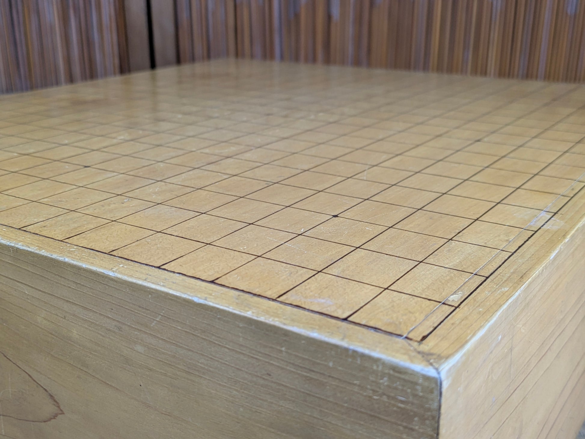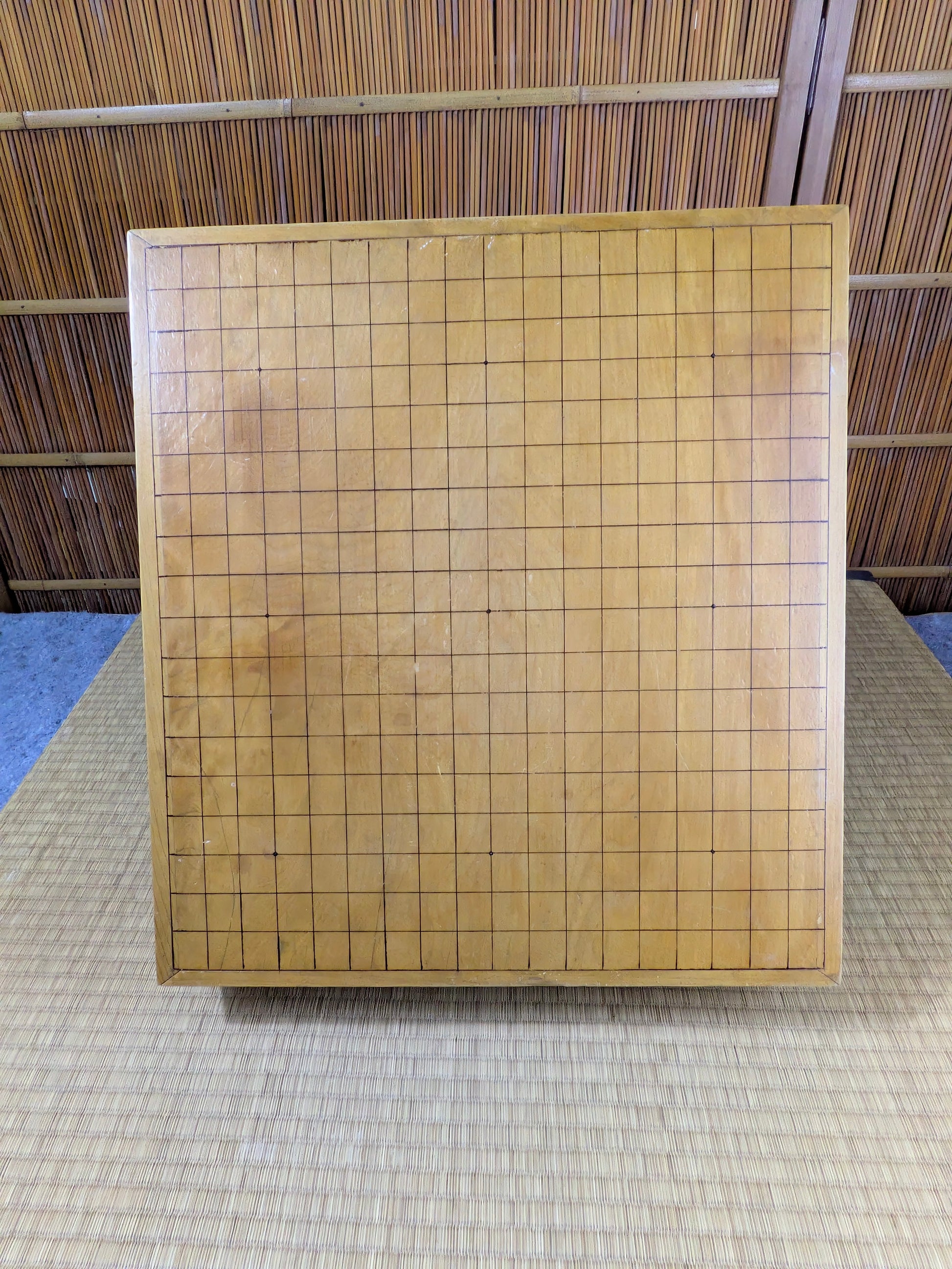 This is a classic Japanese floor goban crafted in the traditional hari-ban style, with an outer layer of genuine kaya (榧) applied over a solid domestic core. Boards of this type were produced in Japan during the late Showa to early Heisei period, when solid old-growth kaya became rare and expensive. The result is a board that retains the golden color, fragrance, and fine grain of kaya while offering long-term durability at a more accessible price.