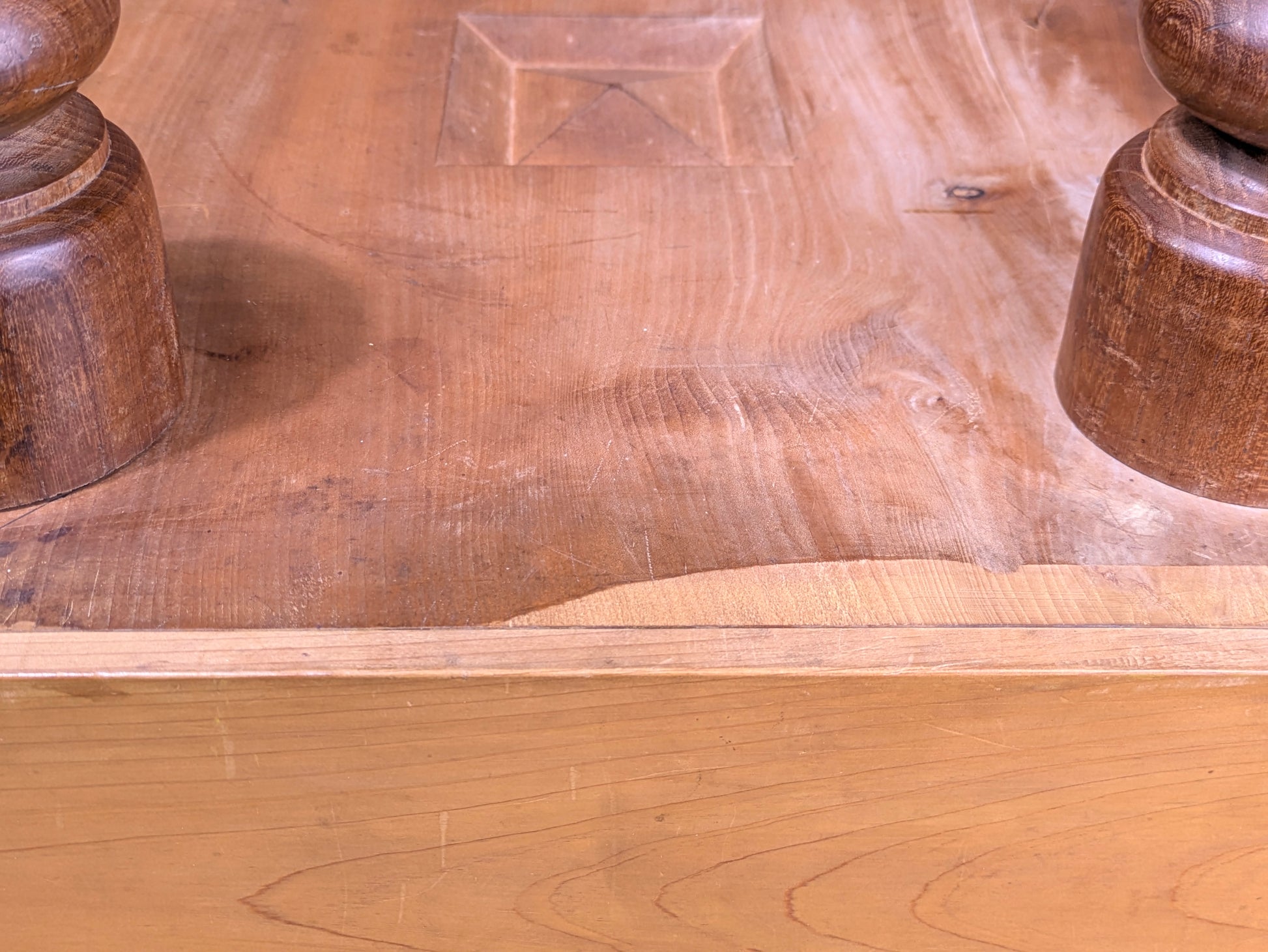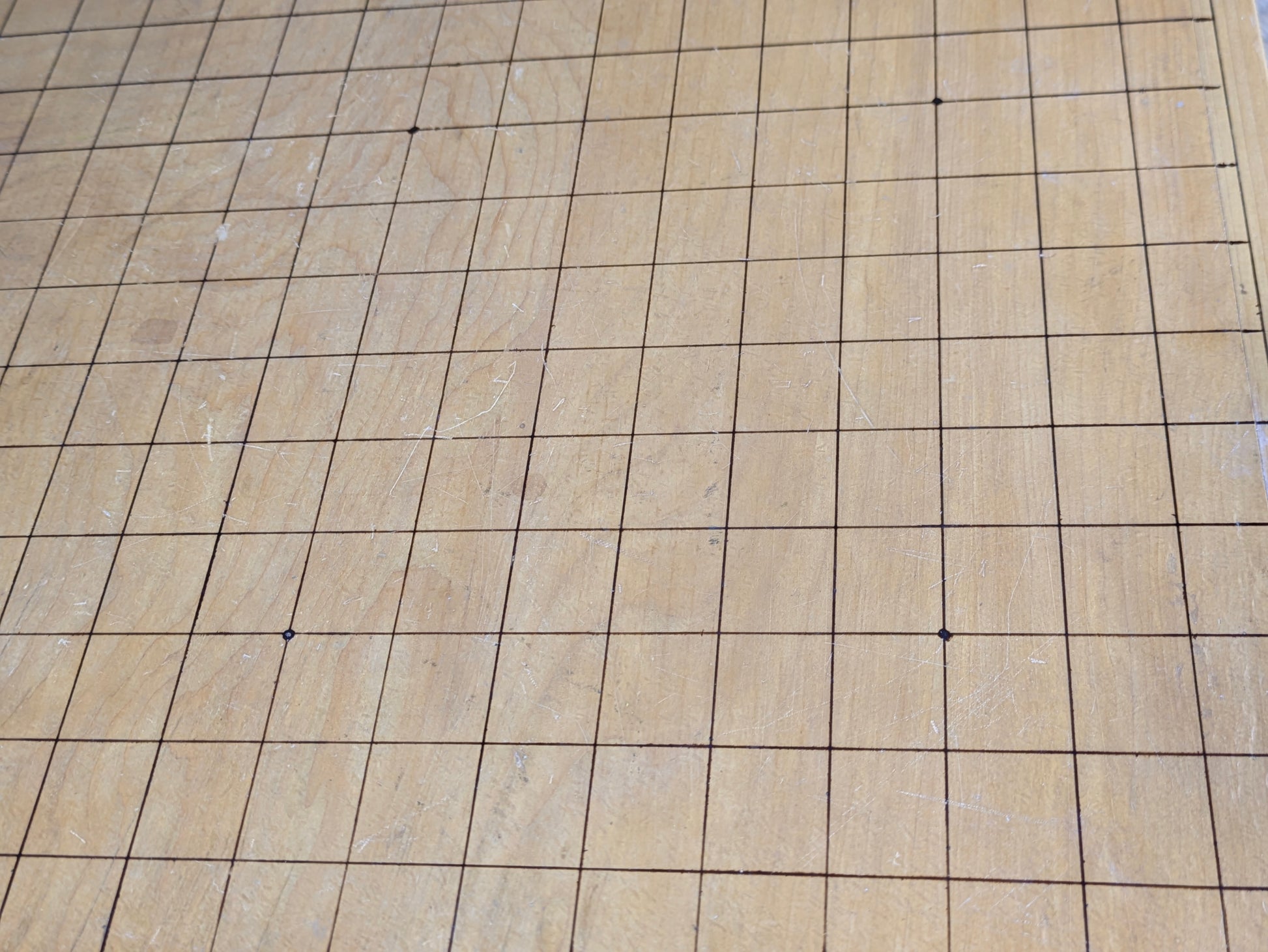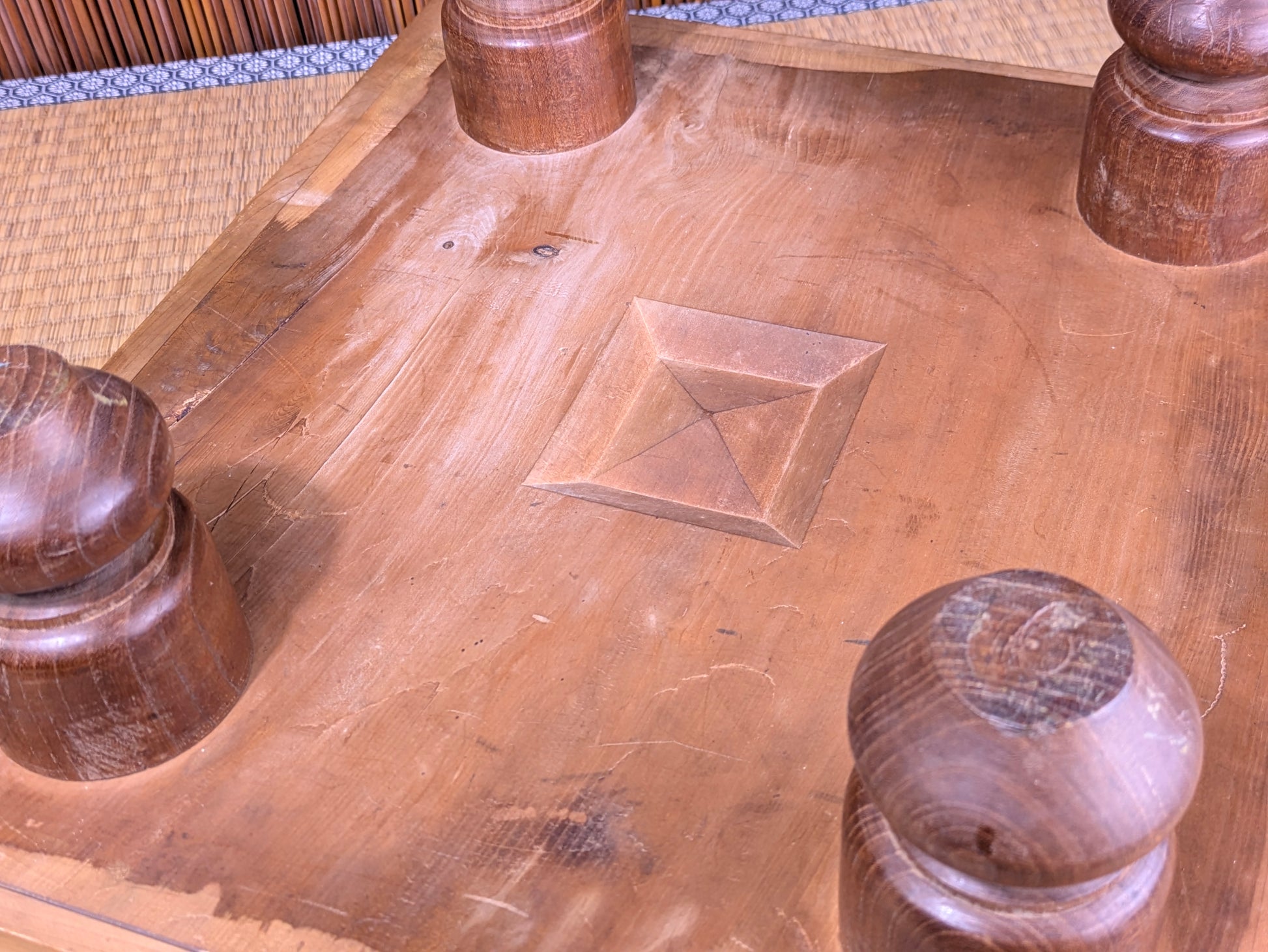 The board shows honest wear from decades of use, including surface scratches, edge rubbing, and light fading near the corners, but the grid remains clear and the structure is solid with no cracks. The traditional turned legs are original and securely attached.