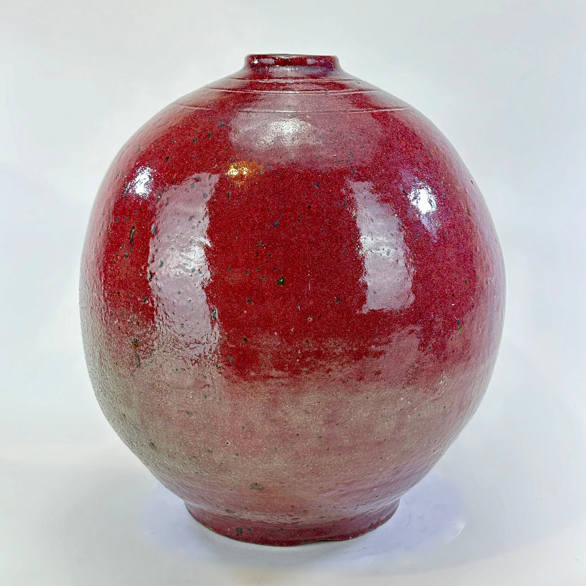 Add a touch of elegance to your space with this 11” spherical Japanese ceramic vase in mesmerizing red-purple. Its small 2” mouth allows for precise floral arrangements, making it a perfect centerpiece for any room.