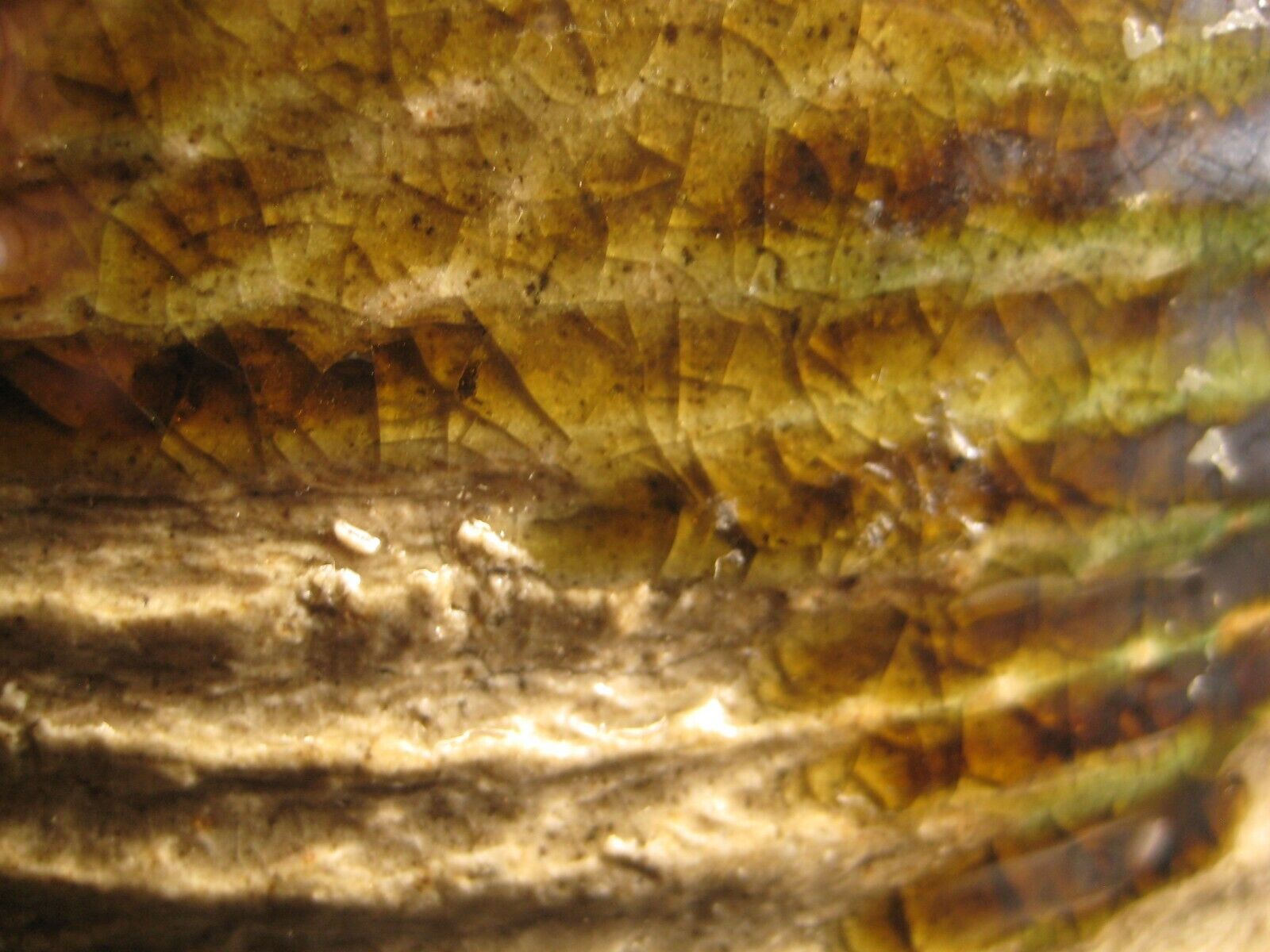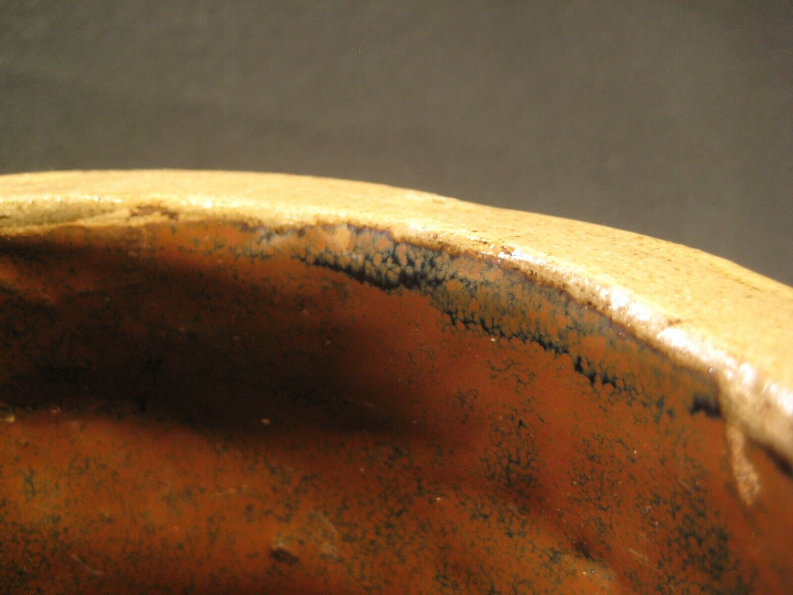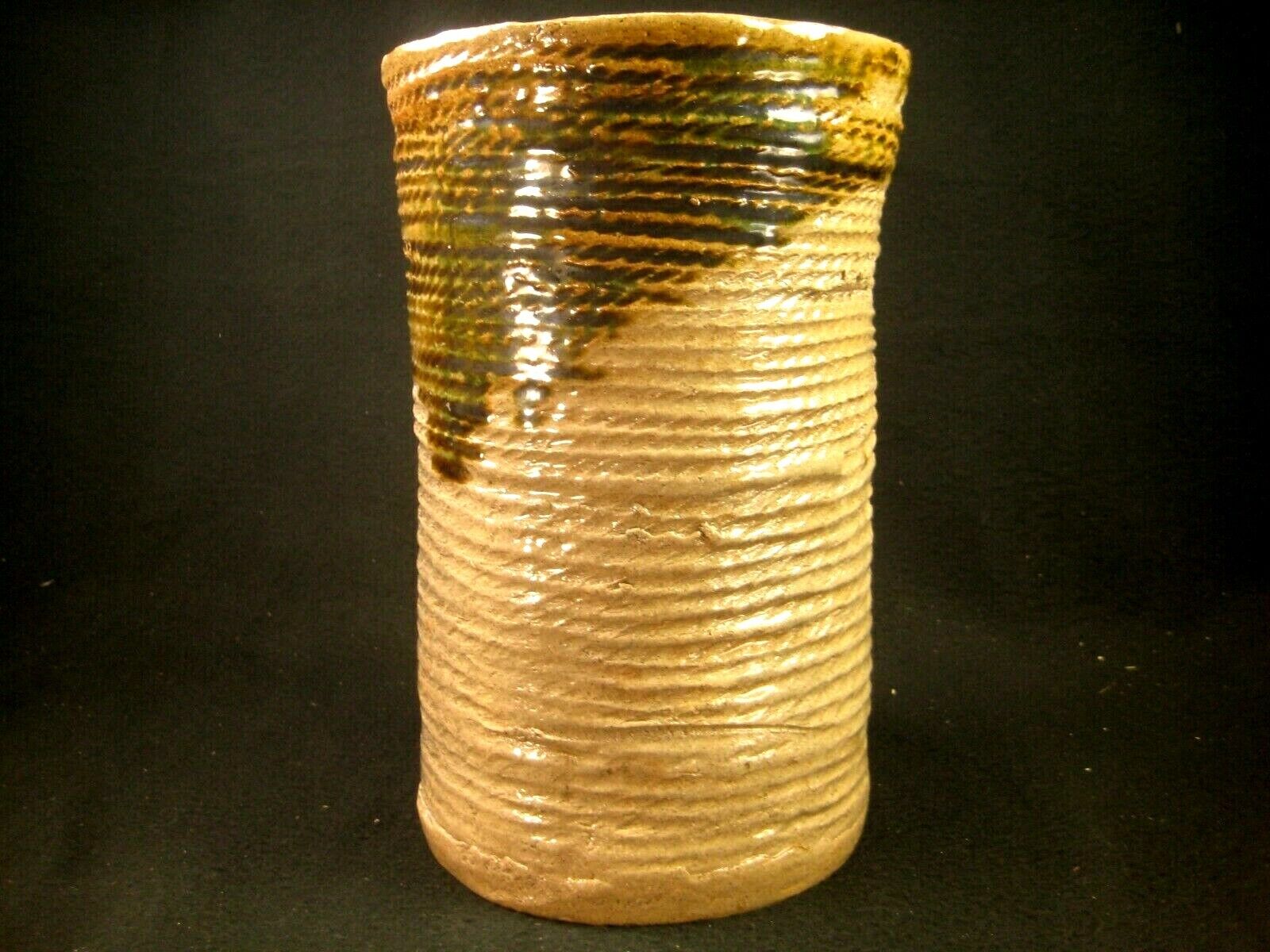 This is a vintage large, pottery flower vase. It is made of a high fire clay for lasting durability. This size vase was popular as a large ikebana flower arranging container to be placed in the tonkonoma area of a Japanese house. The vase is imprinted with a rope texture and decorated with a green crackle glaze on one side, indicative of Oribewear popular for use in the Tea ceremony. This vase is glazed both inside and out. The vase is in good condition. It measures 10" tall and 7" in diameter (25.5 x 17.5 cm) and weighs 7 lbs. A great piece of art!