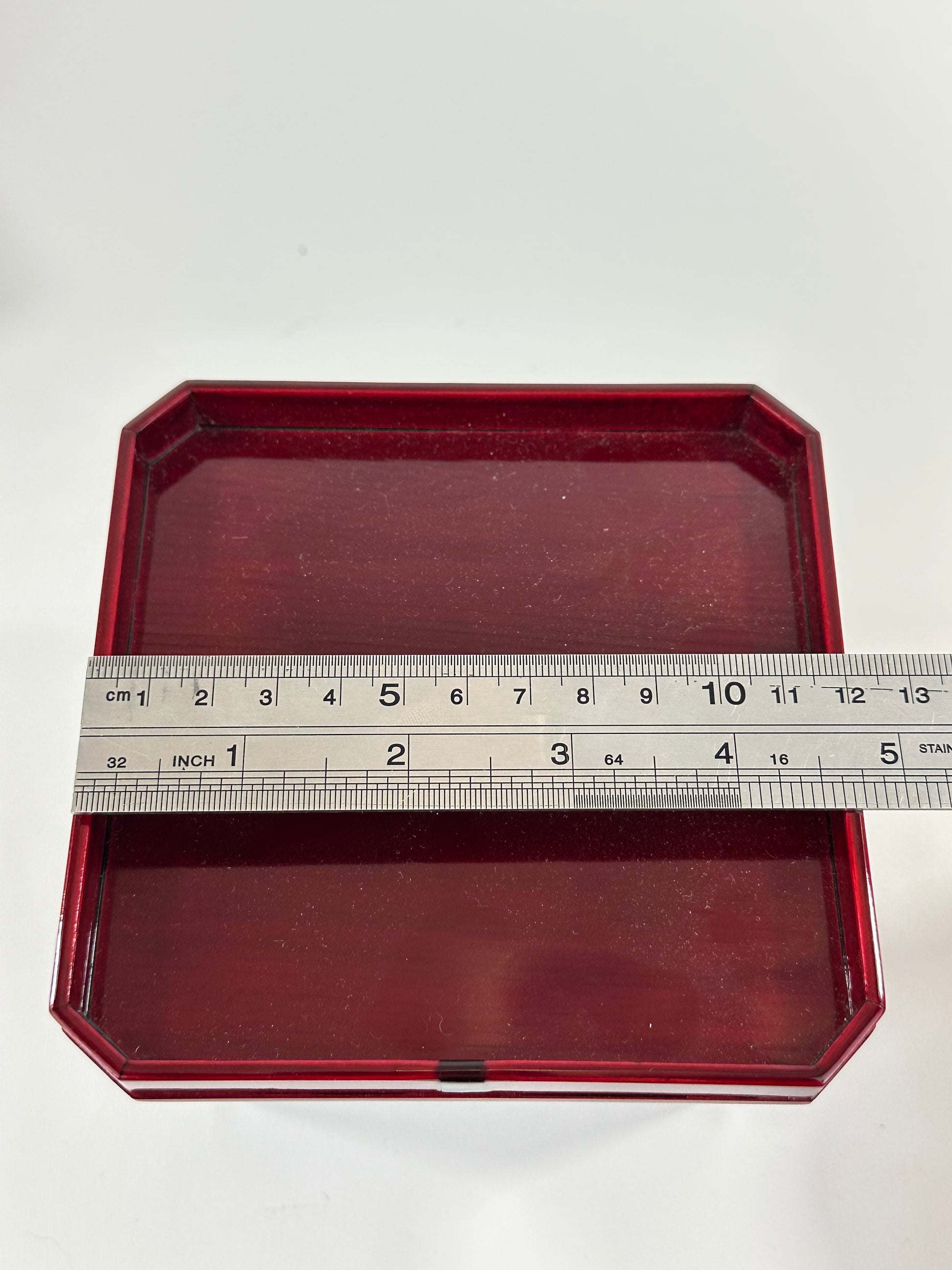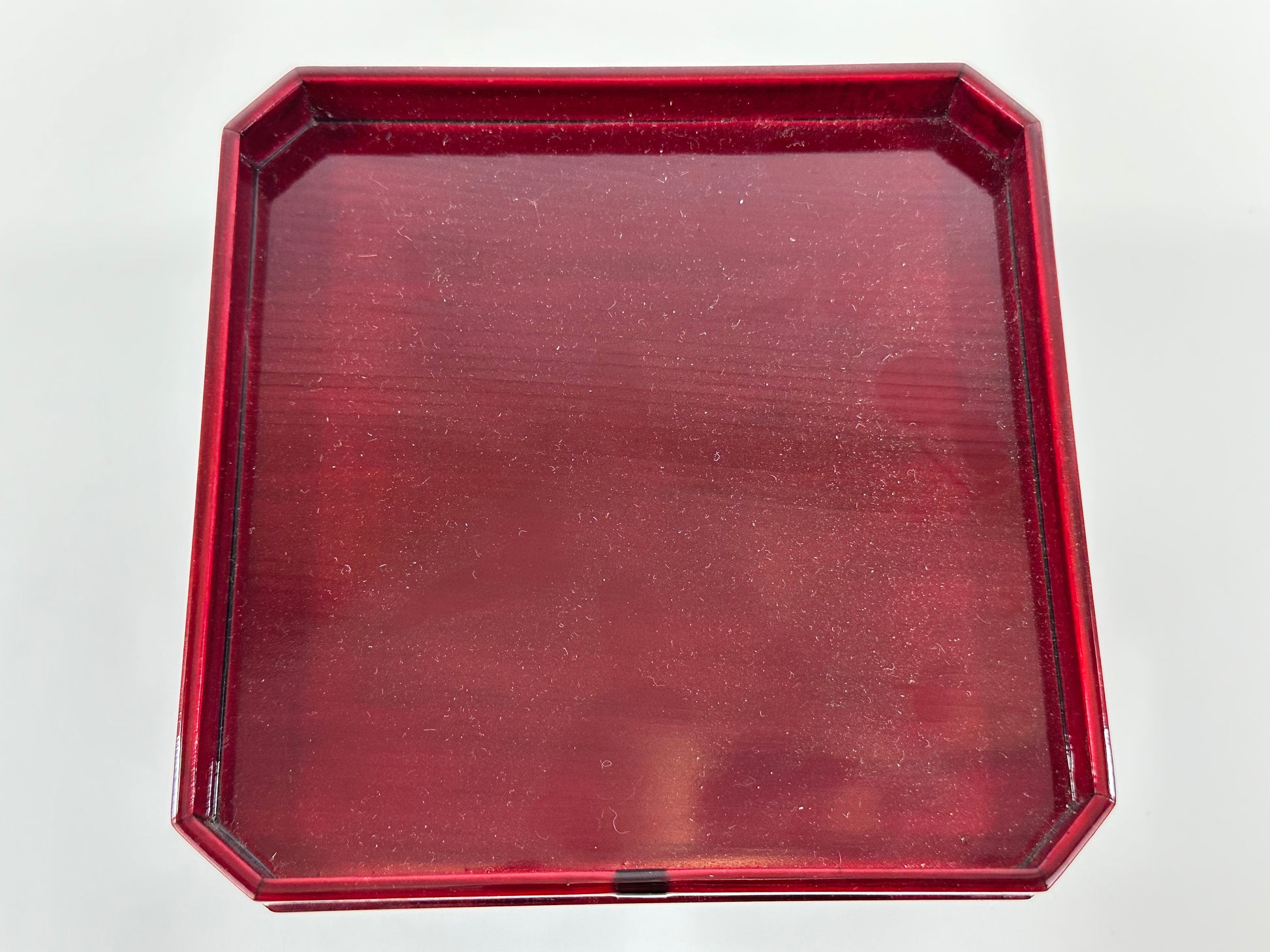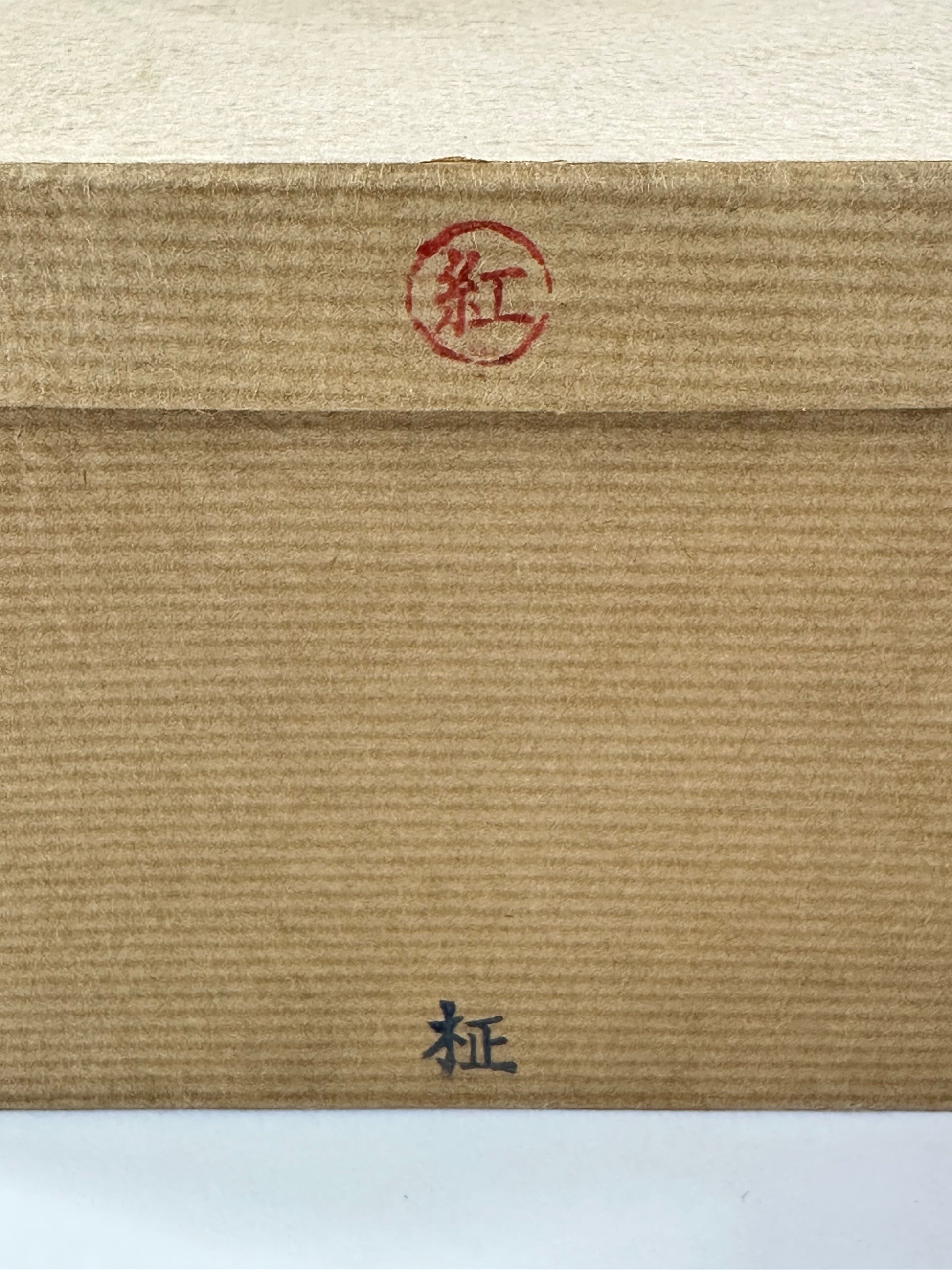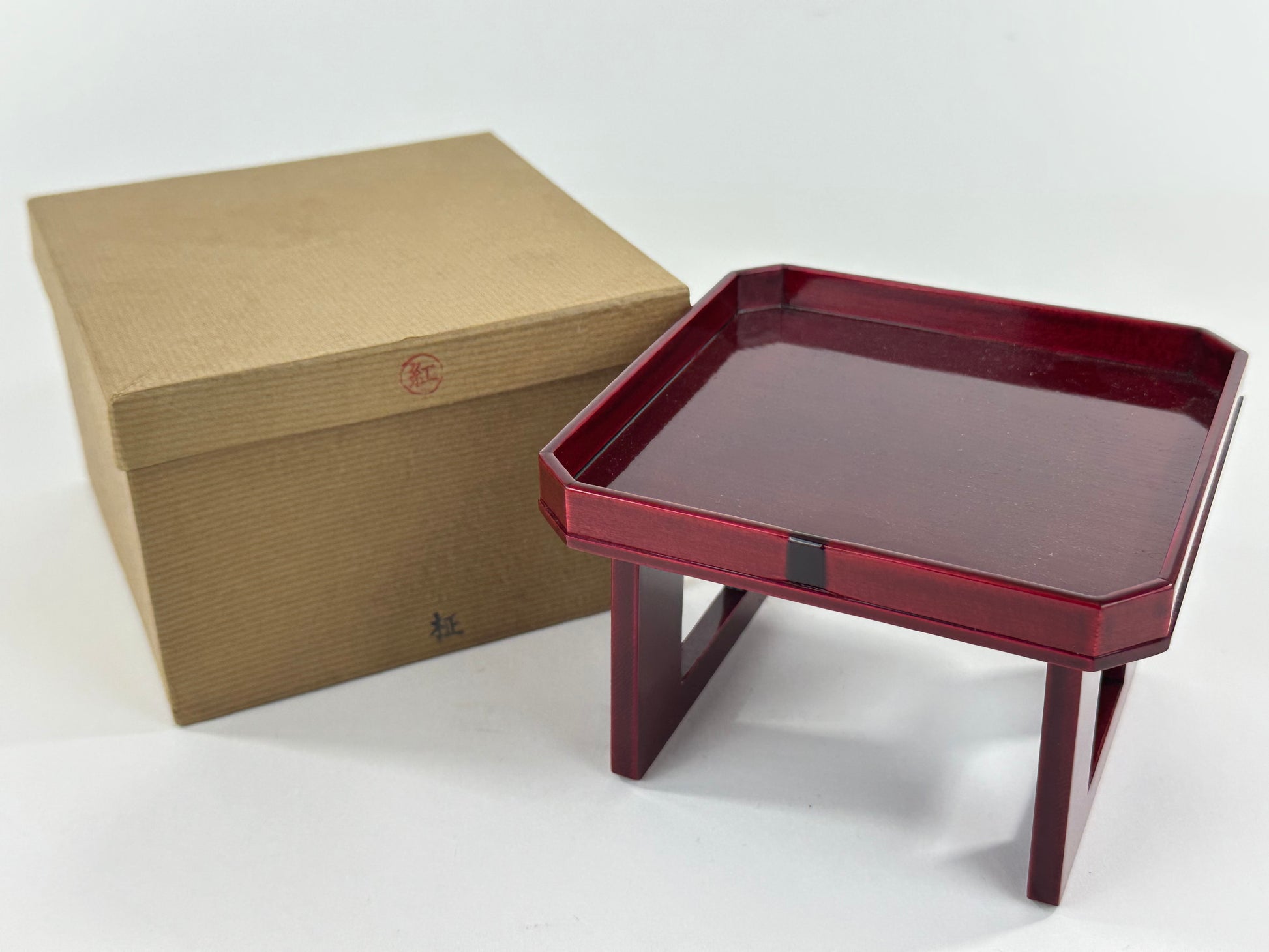 The translucent deep red shunkei lacquer reveals the underlying wood grain and is ideal for presenting tea utensils, incense burners, or small flower arrangements on a tokonoma or low table. The original storage box is included, stamped in red with 紅 (Kurenai - crimson) and stamped in ink 柾 (Masaki), indicating the workshop/maker. Light surface wear, minor rubbing and specks to the lacquer, and handling wear to the box, all consistent with age and careful use.