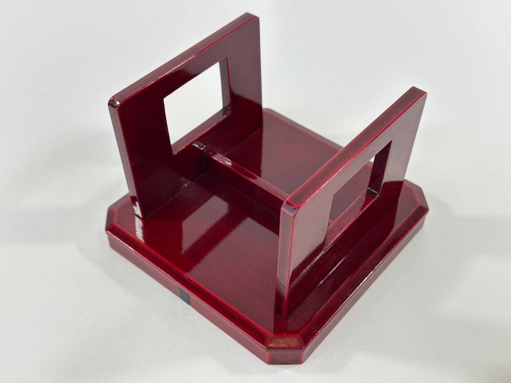 Vintage Japanese Hida Shunkei lacquer display stand with raised tray and chamfered octagonal corners, supported on clean rectangular legs with openwork panels.