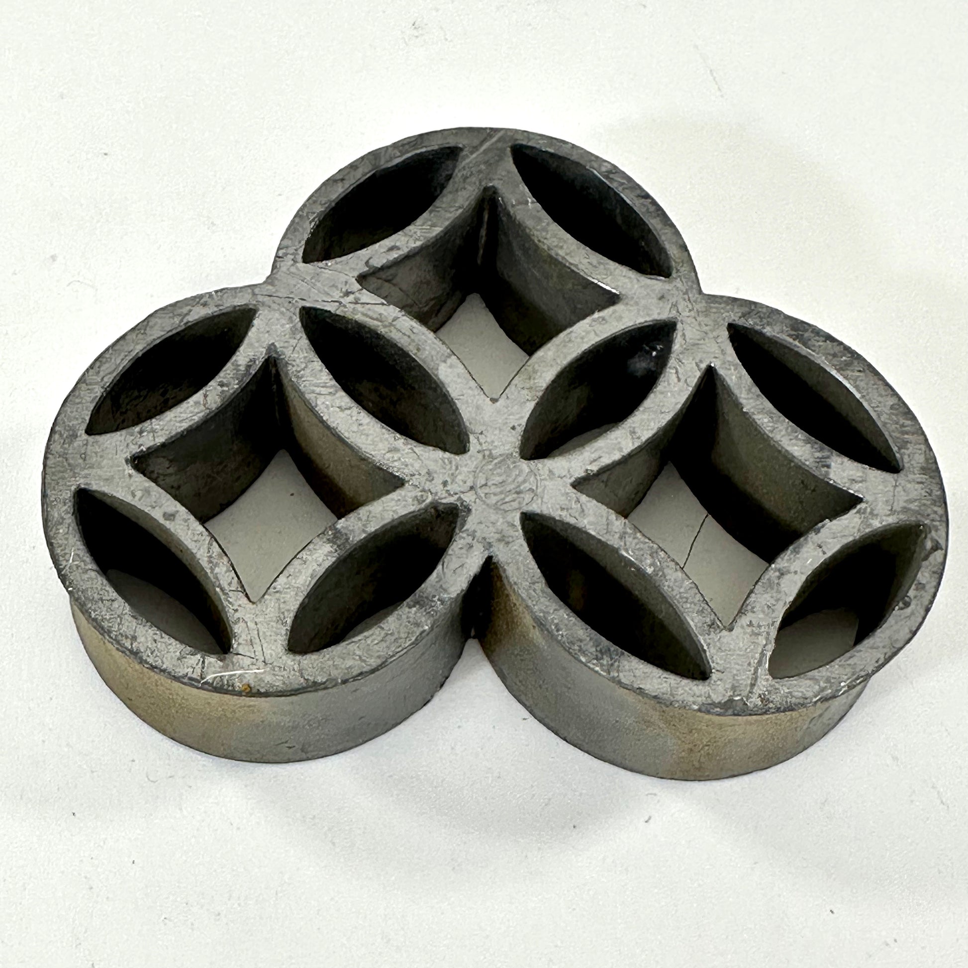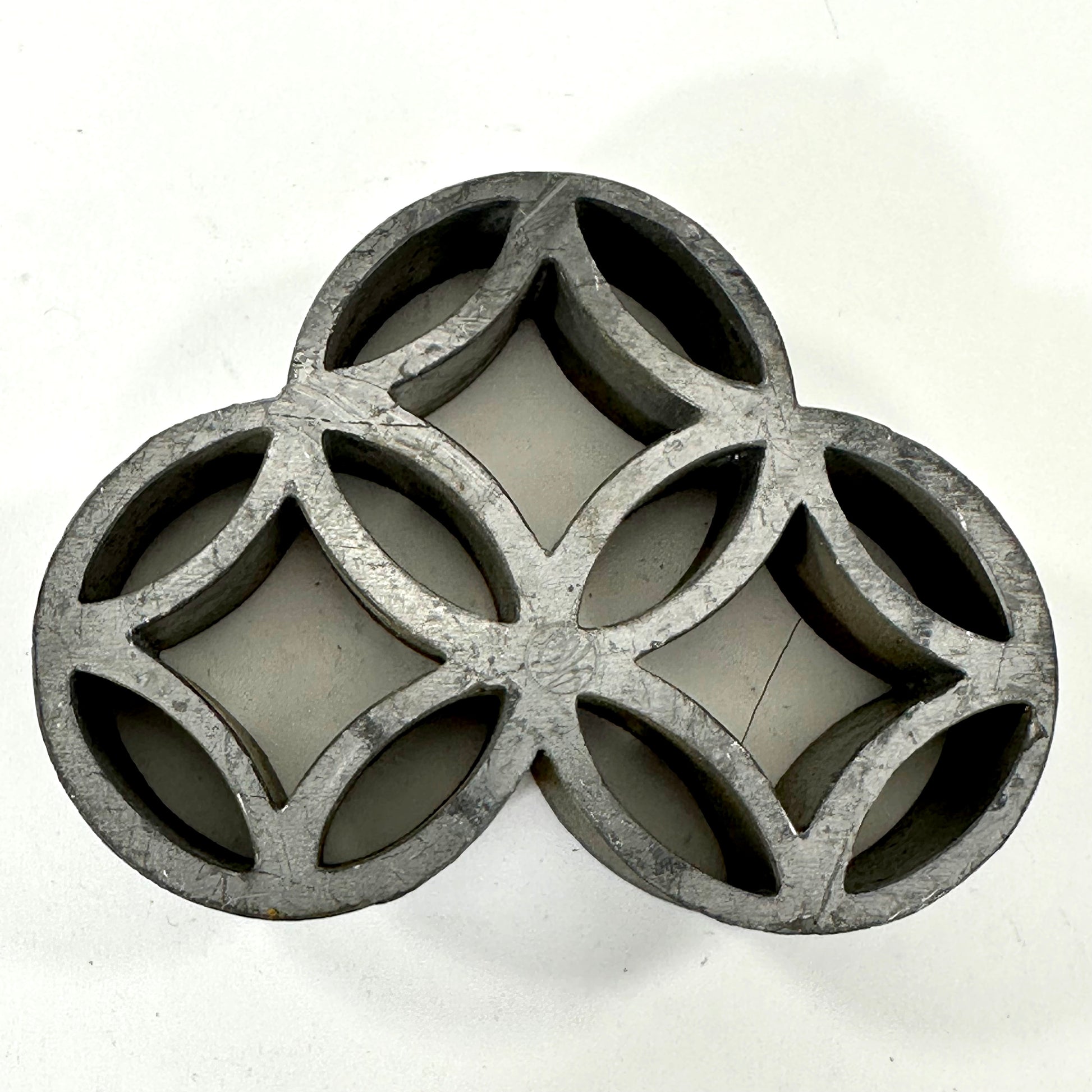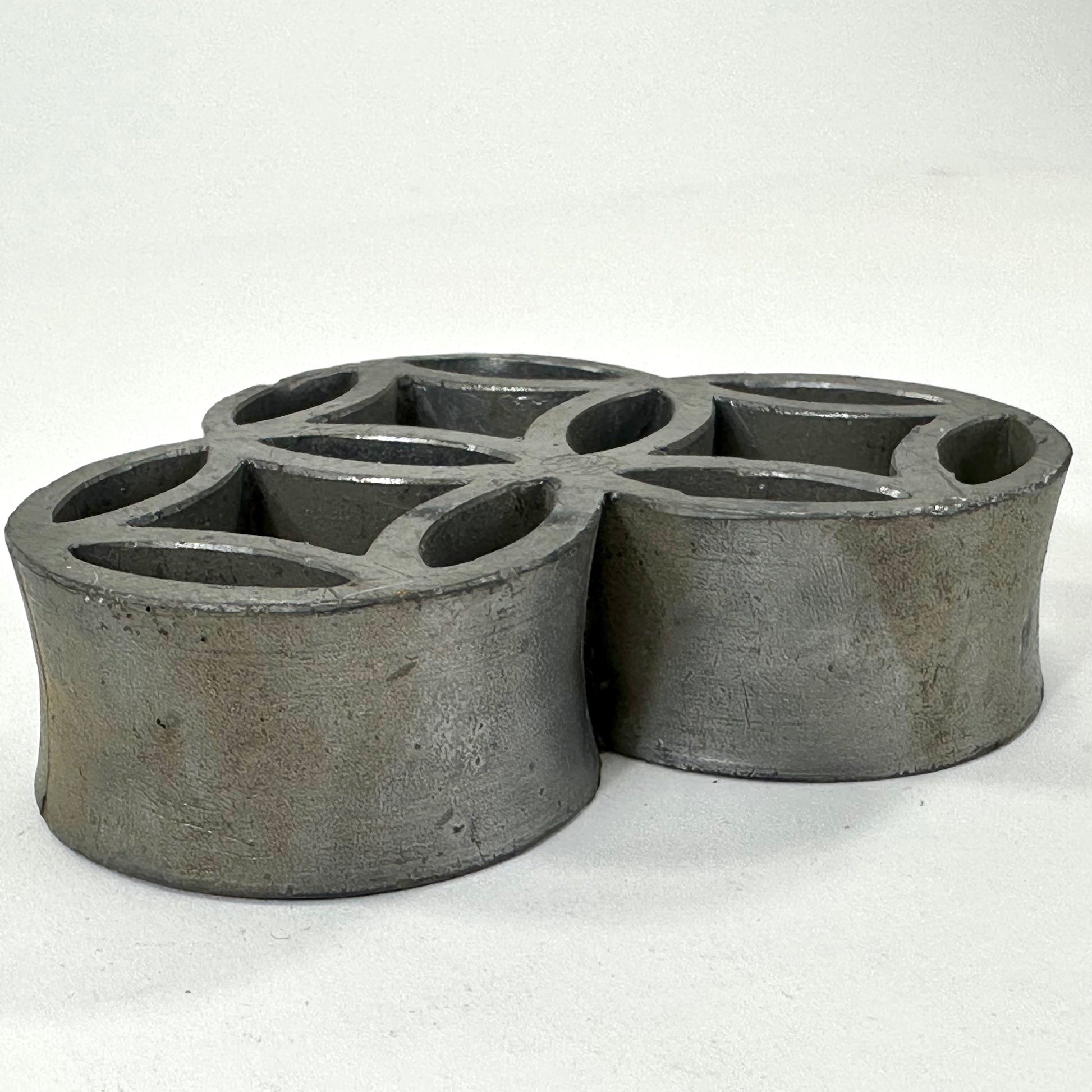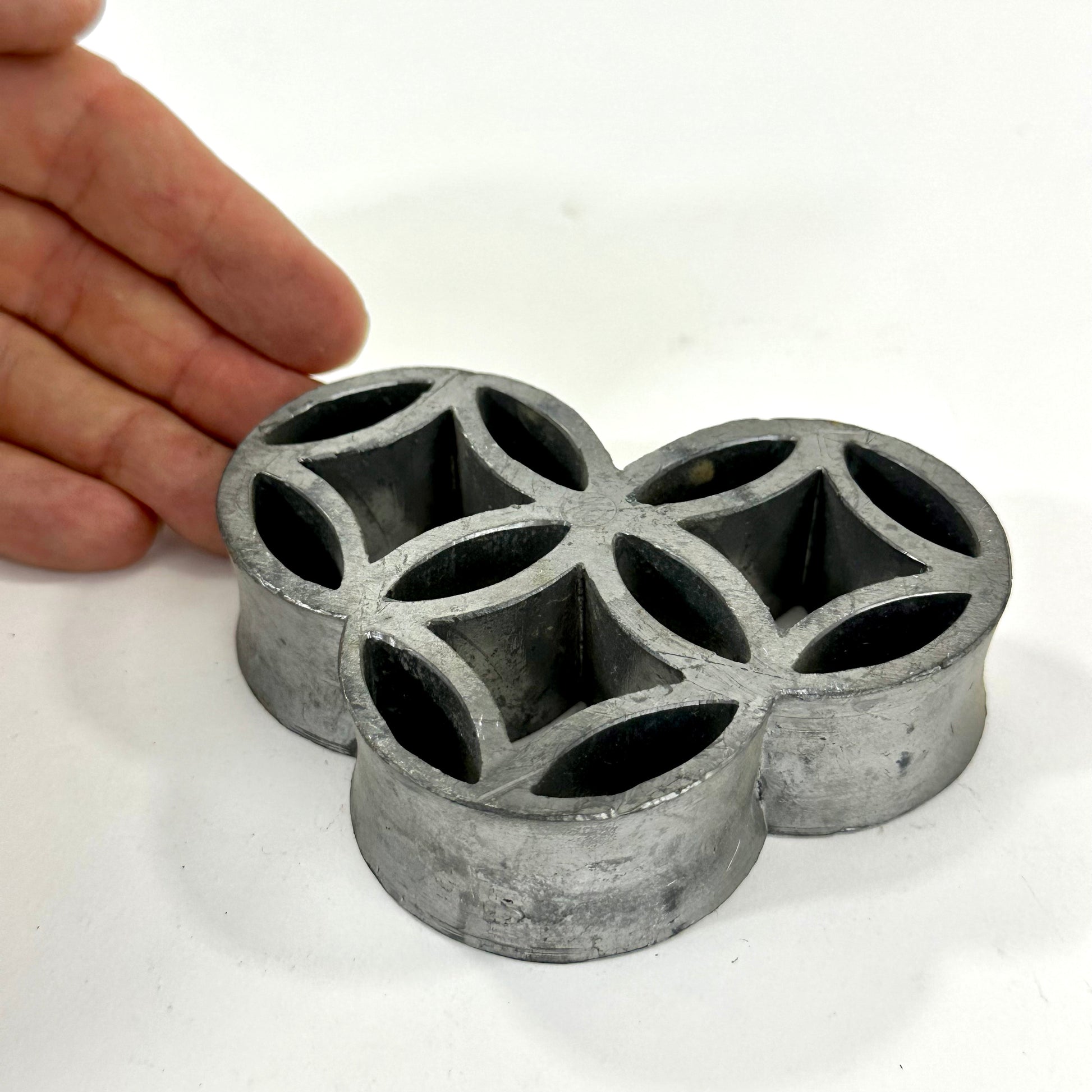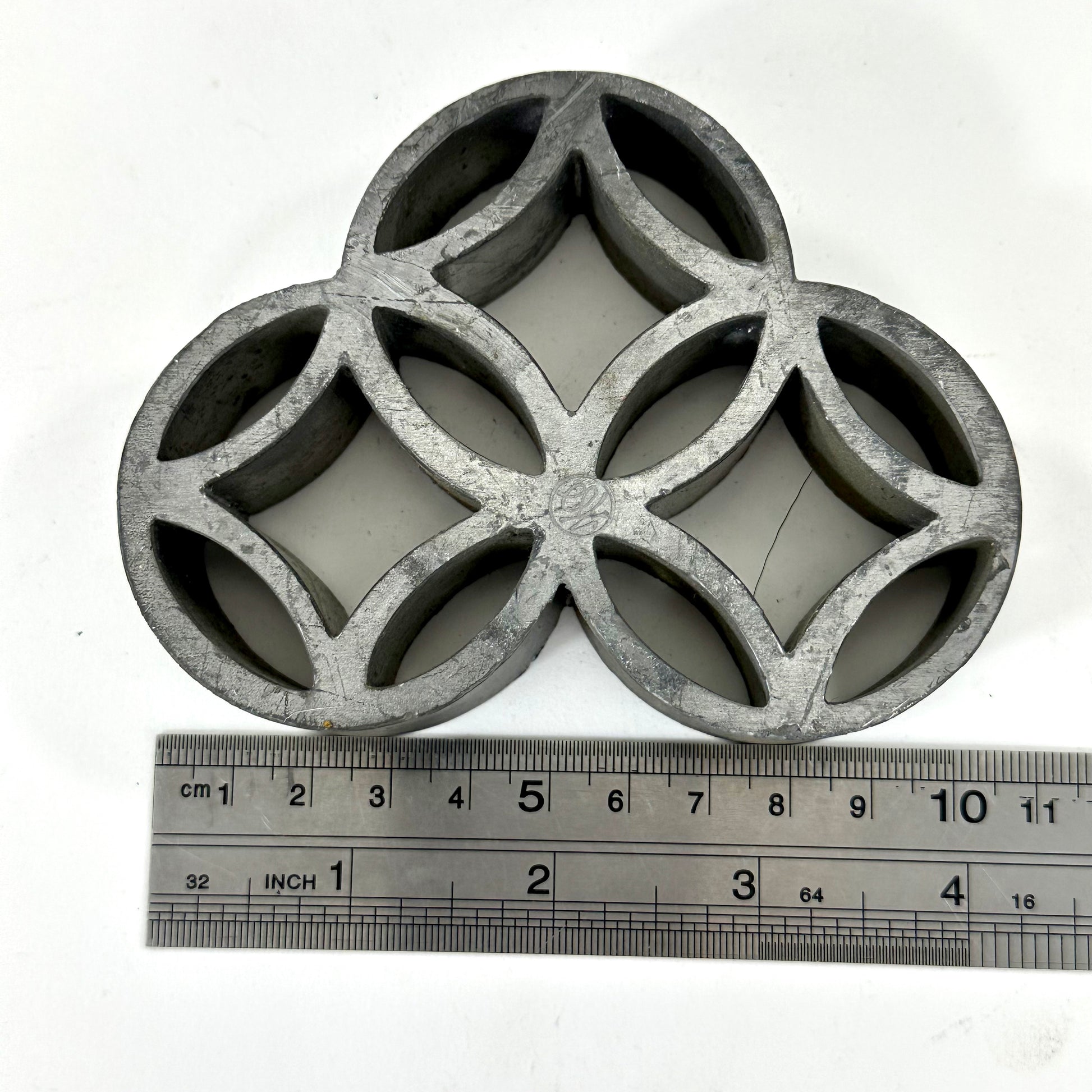 A vintage Japanese kenzan (剣山) used in the art of ikebana (生け花) flower arranging, crafted in solid cast iron and designed in a distinctive ancient-coin inspired pattern. The interlocking circular openings recall traditional Japanese currency motifs such as the kan’ei tsūhō (寛永通宝), long regarded as symbols of prosperity and good fortune.