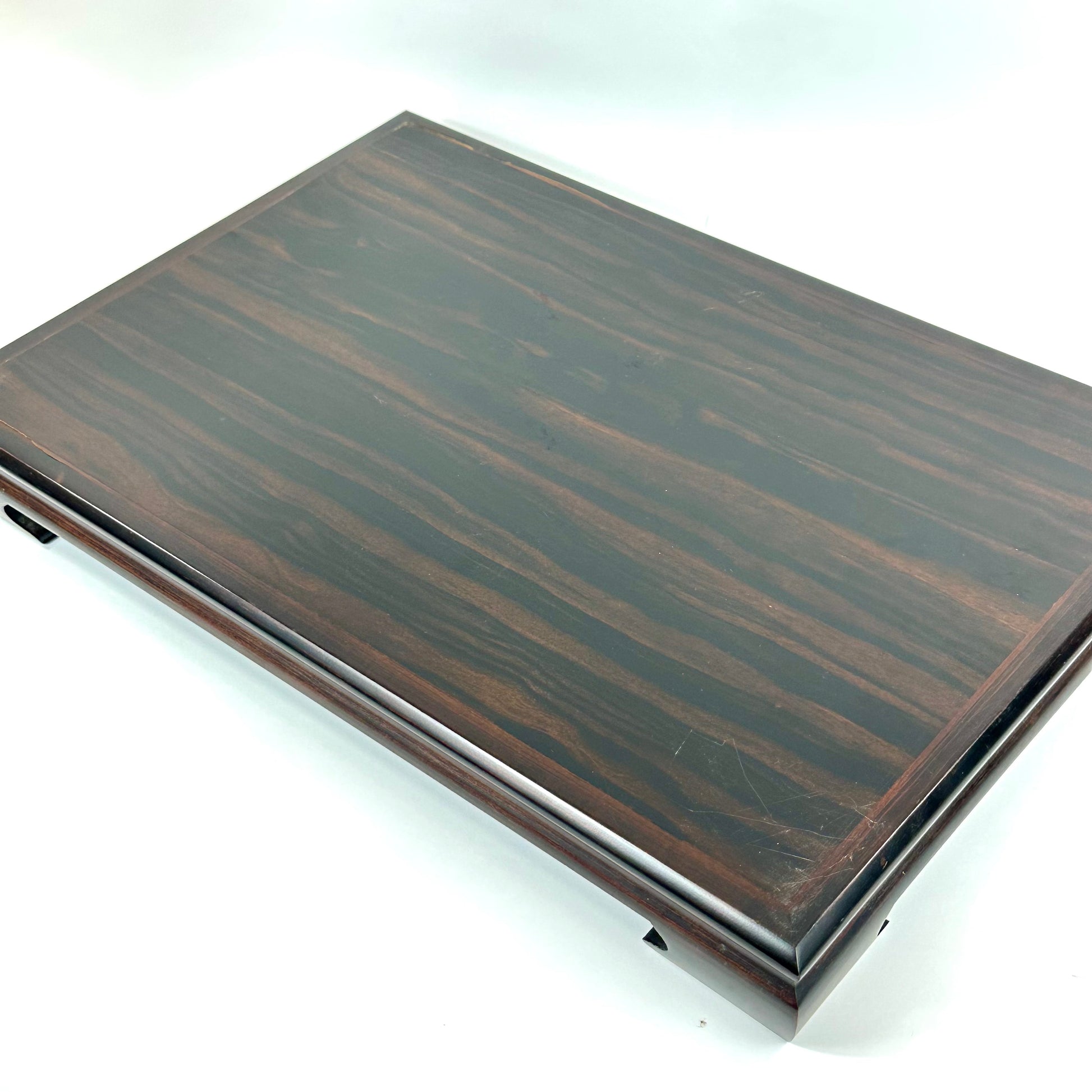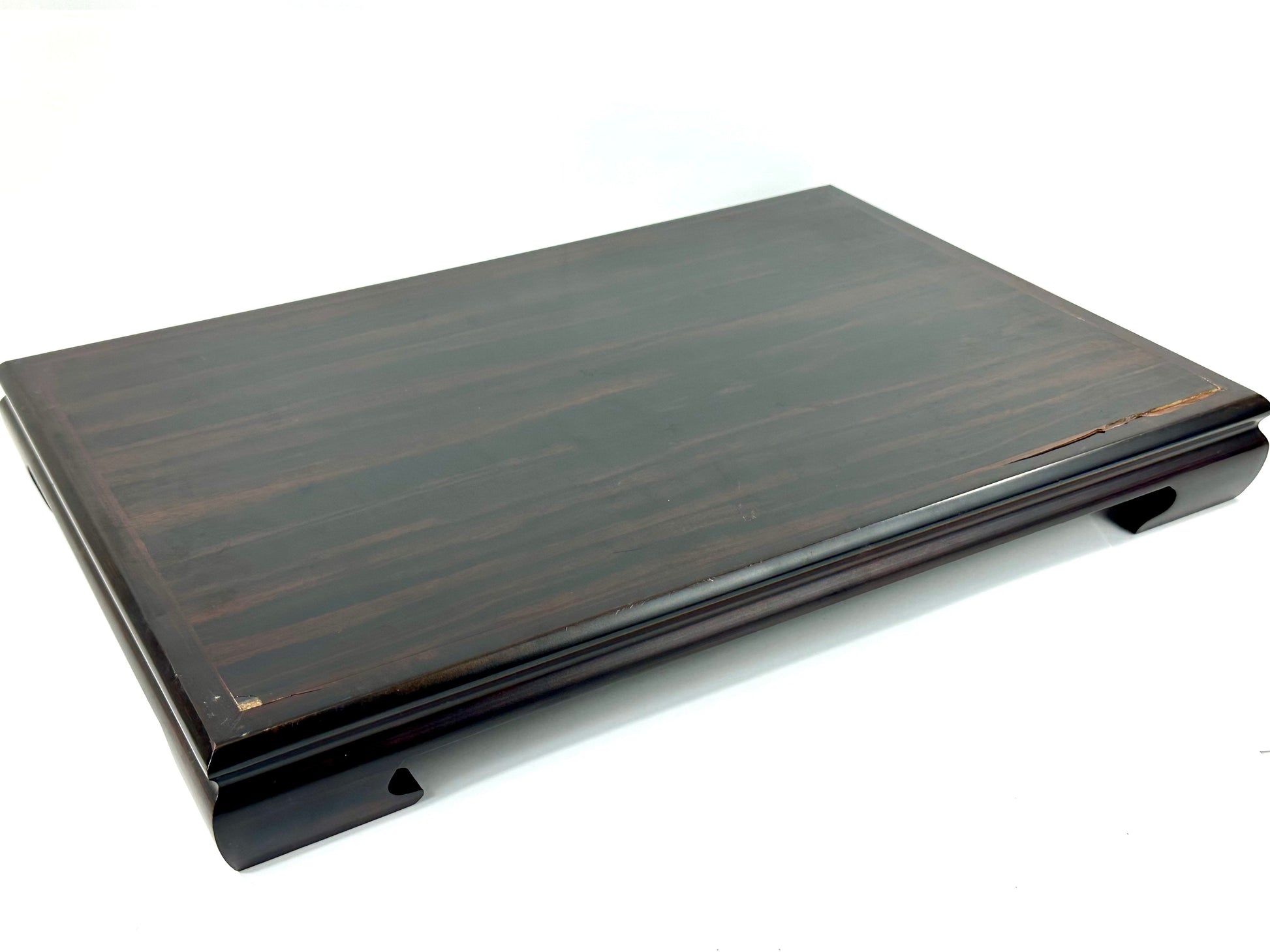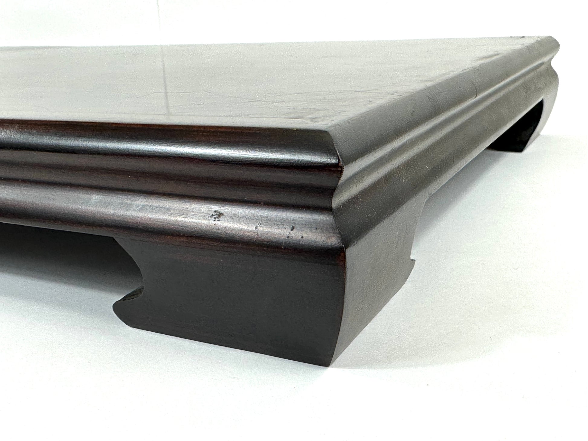 The form is classic and understated, with slightly raised edges and shaped apron feet providing stability and balance. The dark, lustrous wood highlights and frames whatever is placed upon it, whether an ikebana flower arrangement, bonsai tree, or a fine piece of ceramic or lacquerware.