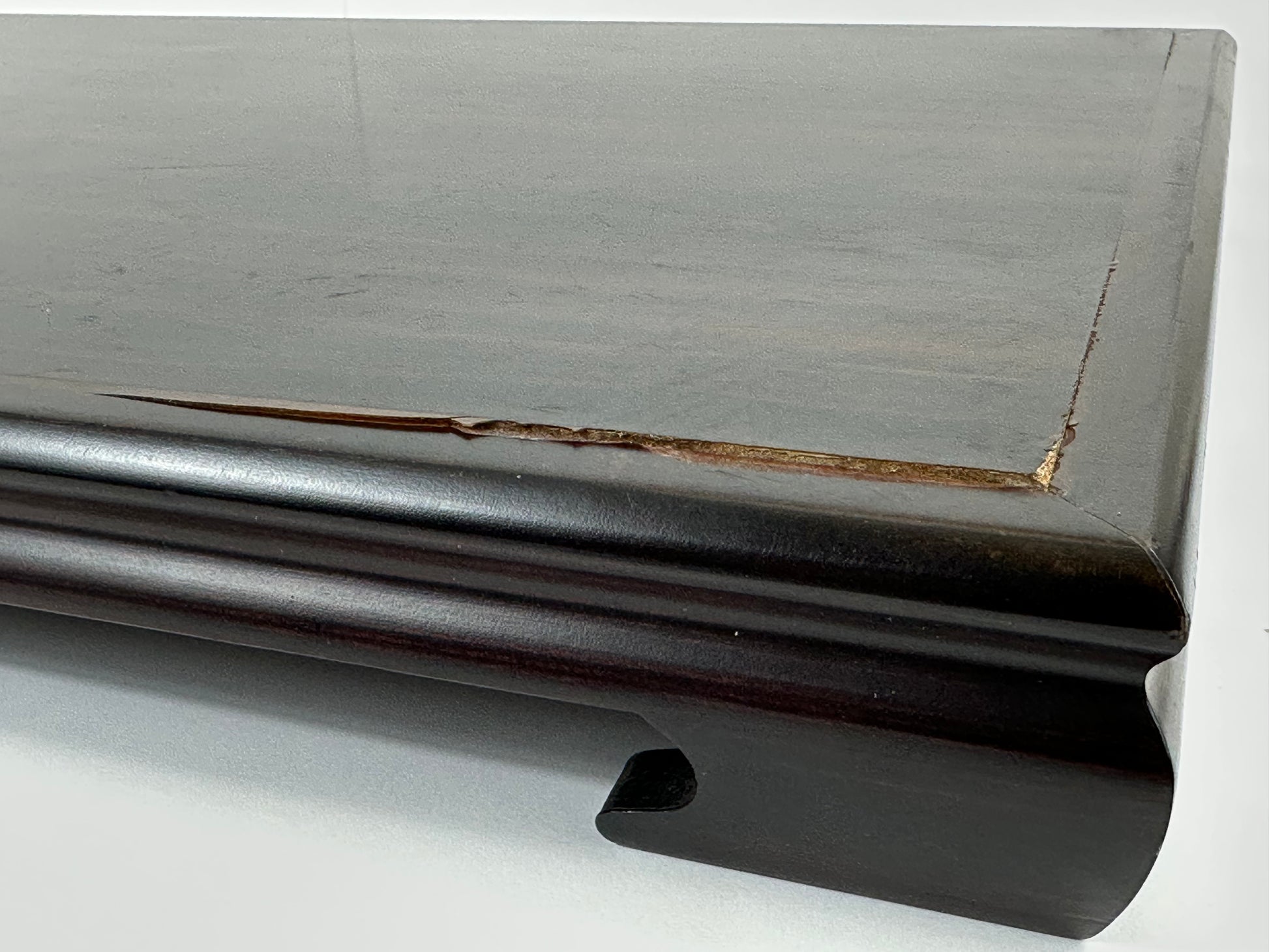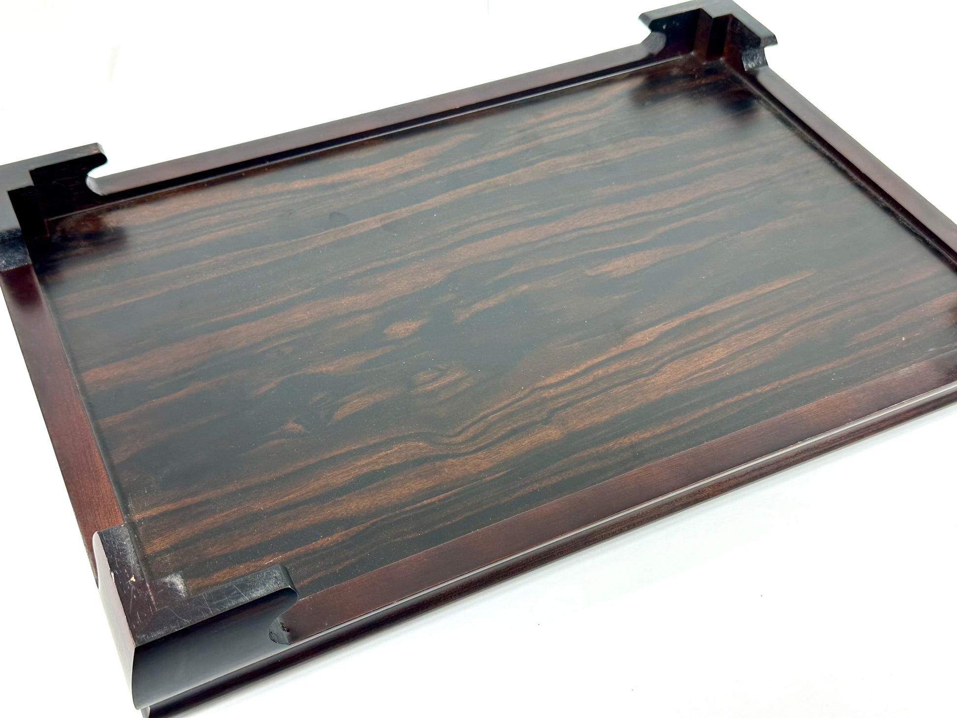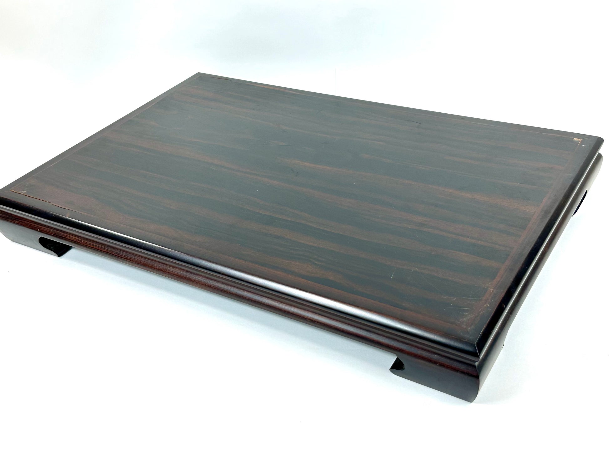 The form is classic and understated, with slightly raised edges and shaped apron feet providing stability and balance. The dark, lustrous wood highlights and frames whatever is placed upon it, whether an ikebana flower arrangement, bonsai tree, or a fine piece of ceramic or lacquerware.