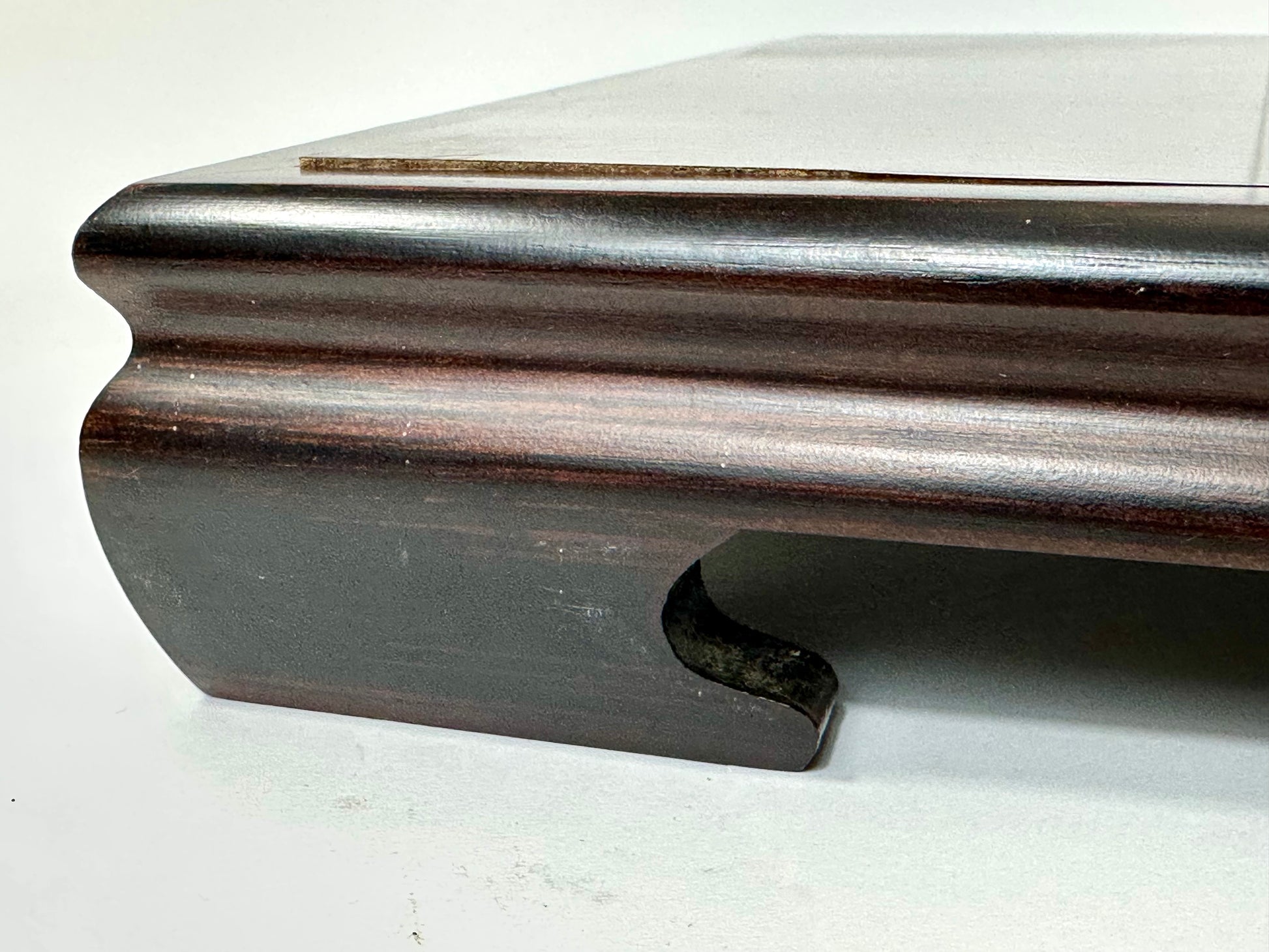 This type of stand (known as daiza or jita) is used in traditional Japanese art display to give objects a sense of importance and presence, while keeping them visually distinct from the surface beneath.