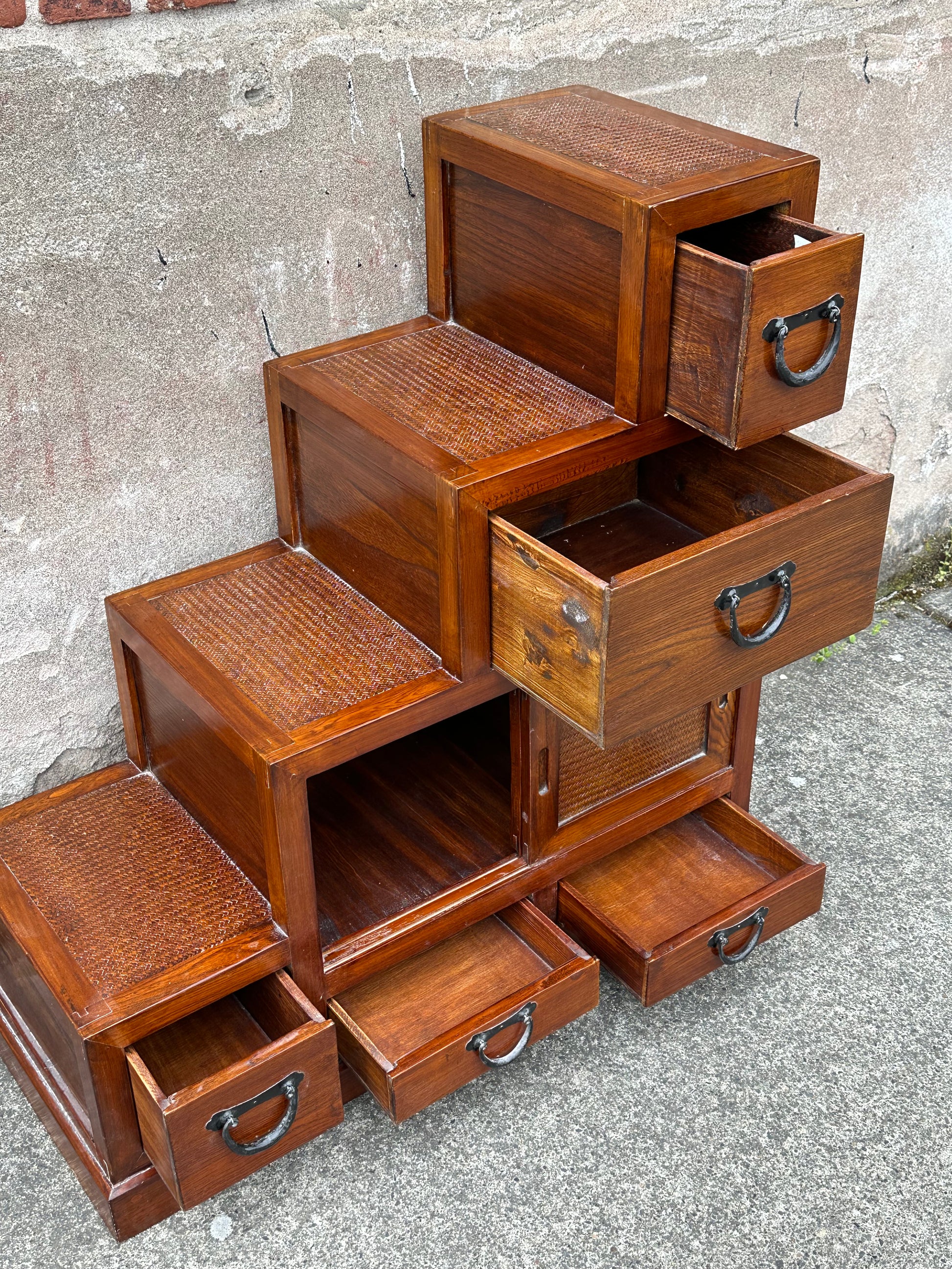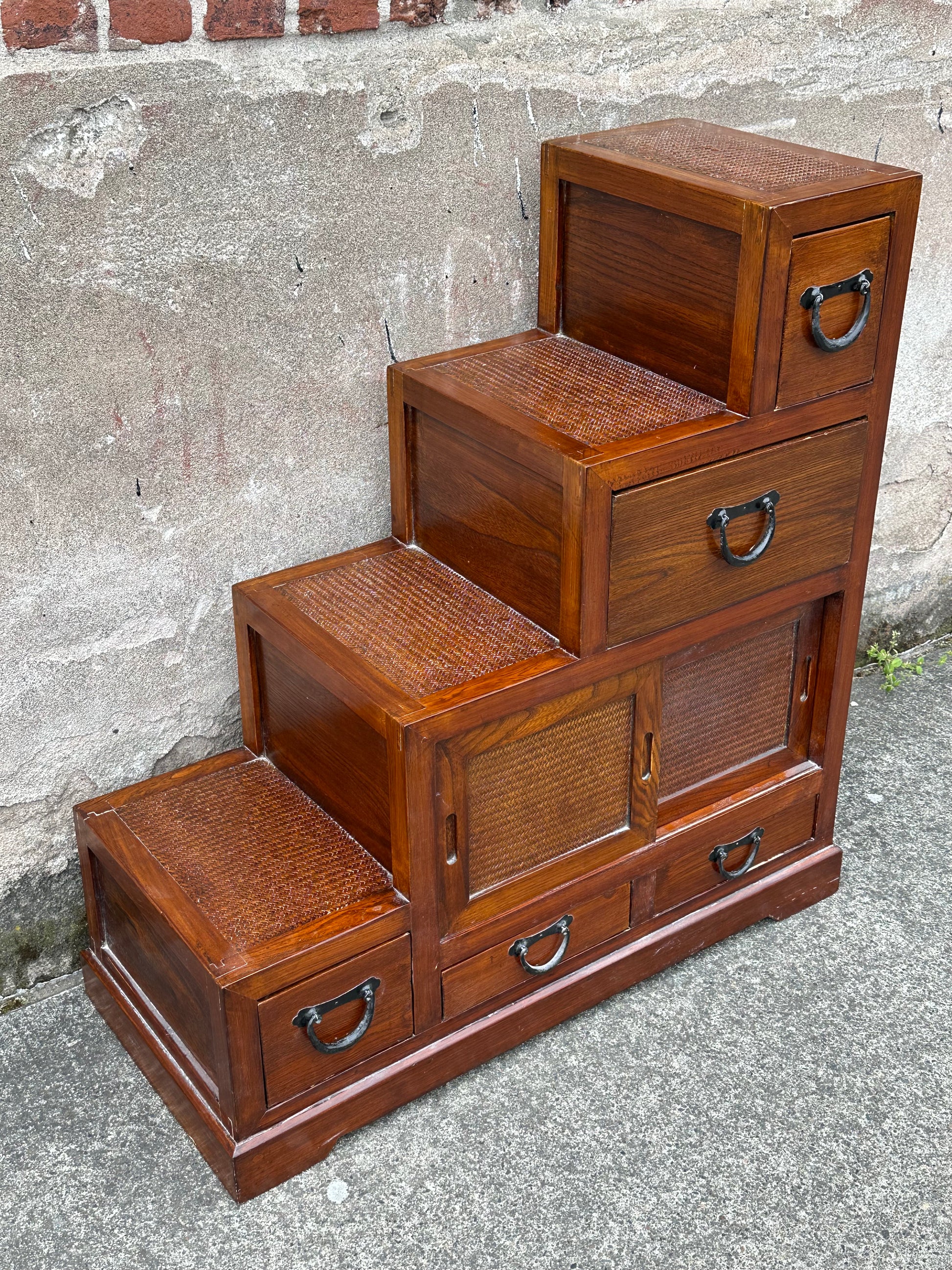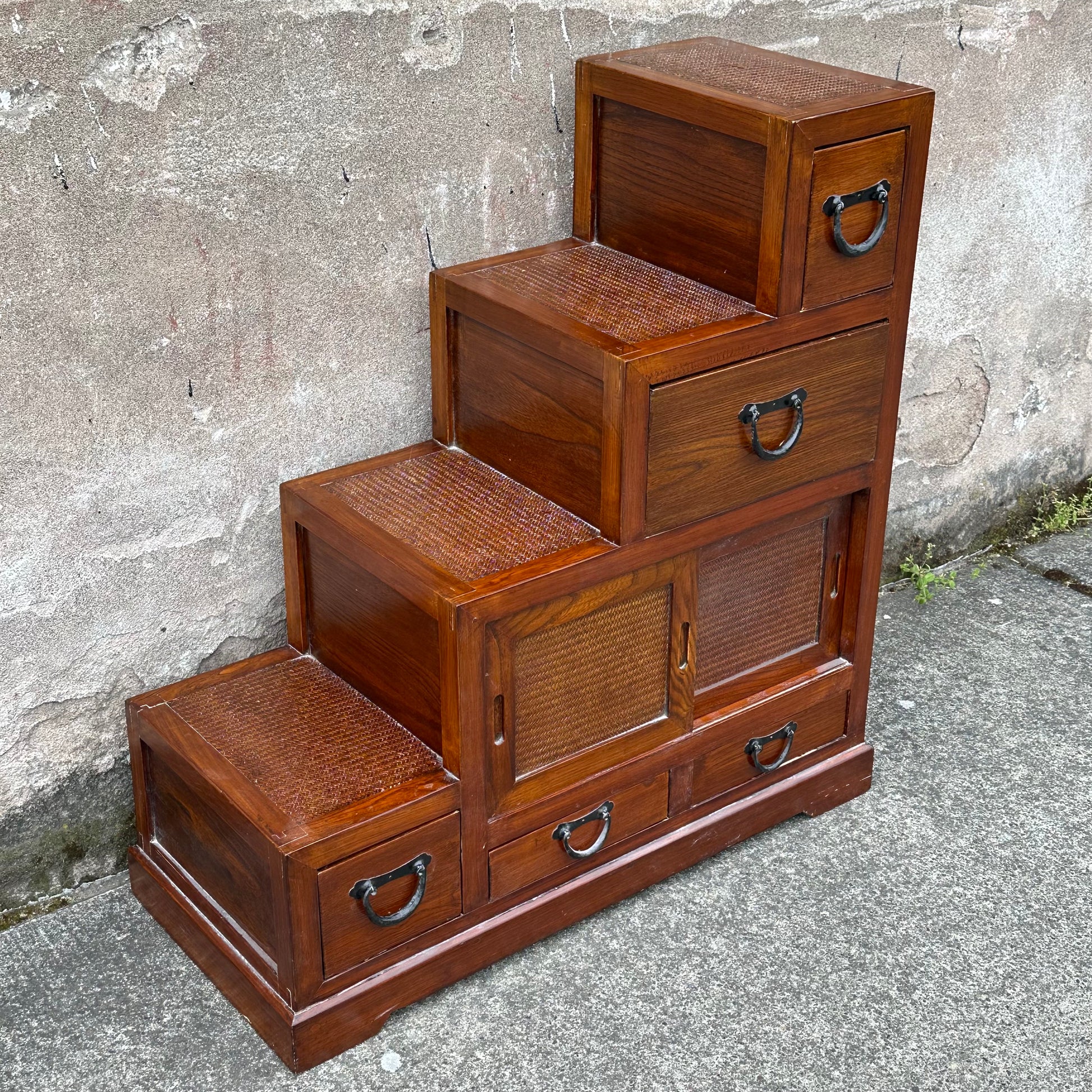 The kaidan dansu originated as a space-saving architectural element in Japanese homes and merchant establishments, serving simultaneously as staircase and storage. Reproductions of this period, while not antique, were often made with genuine craft attention and quality hardwoods, and represent an accessible entry point into the Japanese tansu tradition.