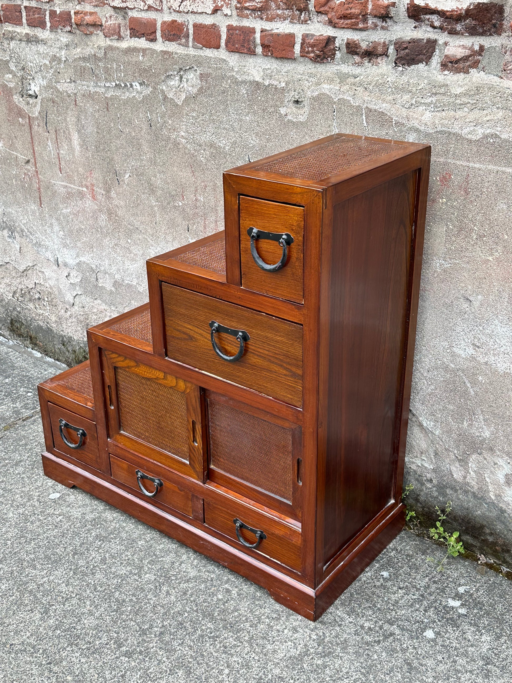 This vintage Japanese kaidan dansu (階段箪笥) is a well-crafted mid-20th century reproduction of the classic step chest form, constructed in keyaki or similar hardwood elm with a warm reddish-brown finish. The stepped silhouette ascends in three tiers, each housing a combination of drawers and compartments accessible from both sides — a double-sided configuration that makes this piece equally functional as a room divider or freestanding display. Sliding doors on the middle tier are inset with woven rattan cane panels, adding a tactile contrast to the smooth hardwood frame.