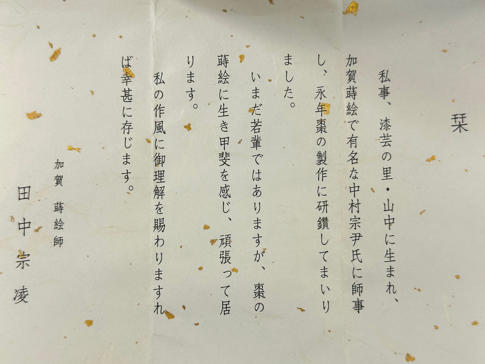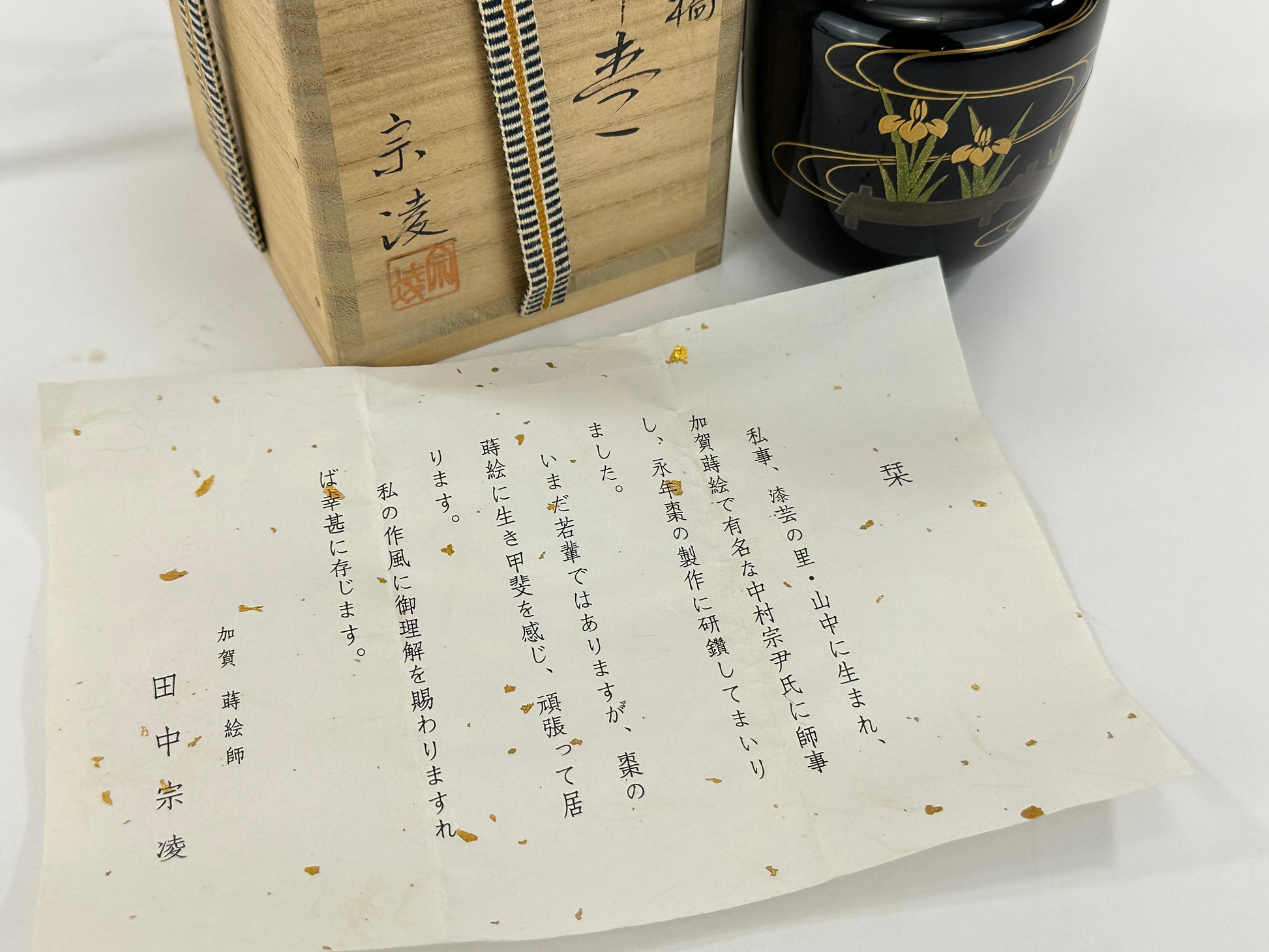 The accompanying tomobako (signed wood storage box) bears the signature and seal of lacquer artist Tanaka Muneyasu (田中宗凌), a traditionally trained craftsman associated with Kaga lacquer heritage. The interior leaflet further identifies the maker and notes apprenticeship under respected lacquer master Nakamura Sōin.