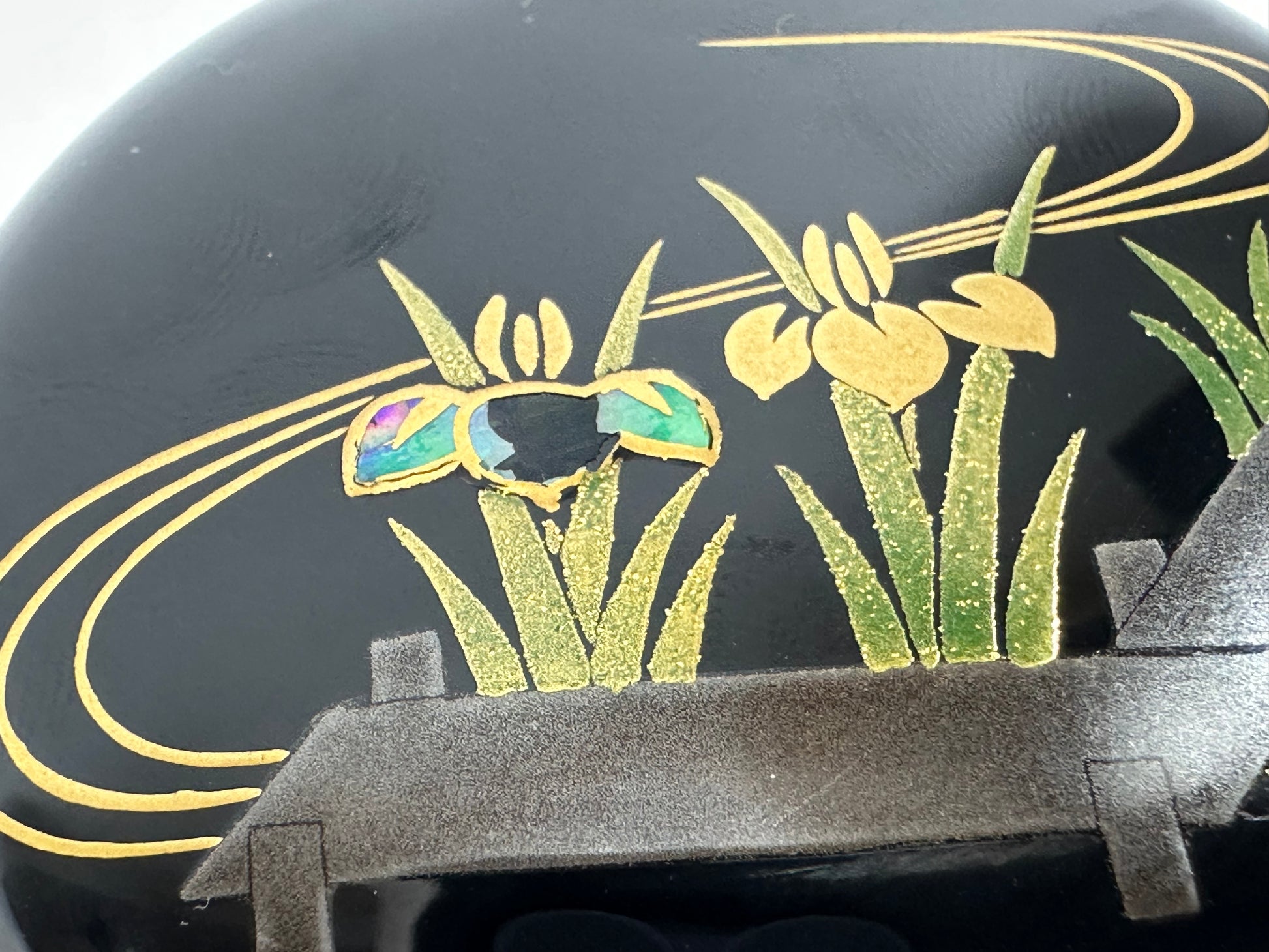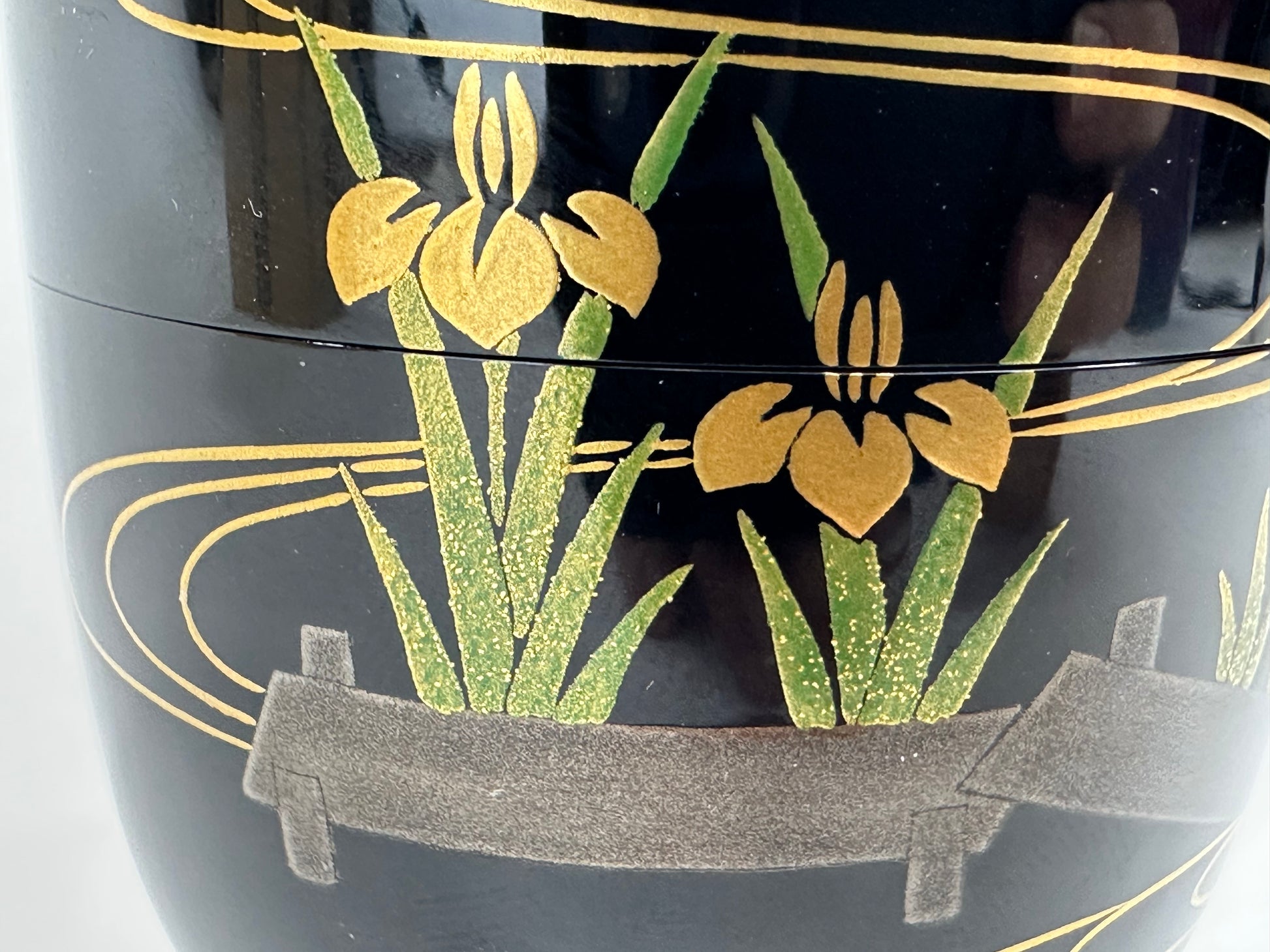 The swirling gold lines evoke flowing water and the movement of wind across a marsh, while the irises (菖蒲 shōbu) express seasonal renewal, courage, and good fortune. The bridge elements reference the legendary Ise Monogatari episode where the zig-zag walkway crosses fields of blooming irises, a theme beloved in lacquerware, screen painting, and textile design.