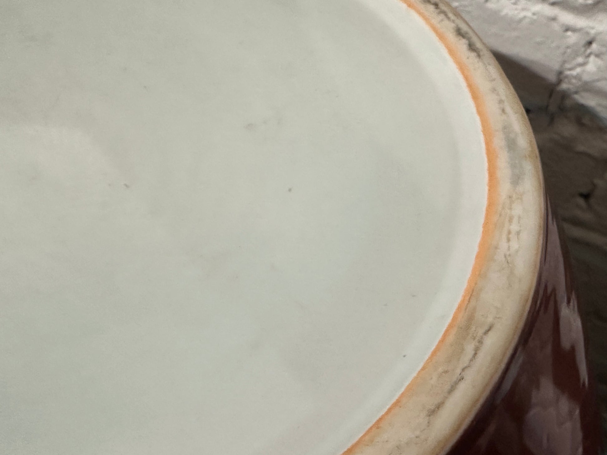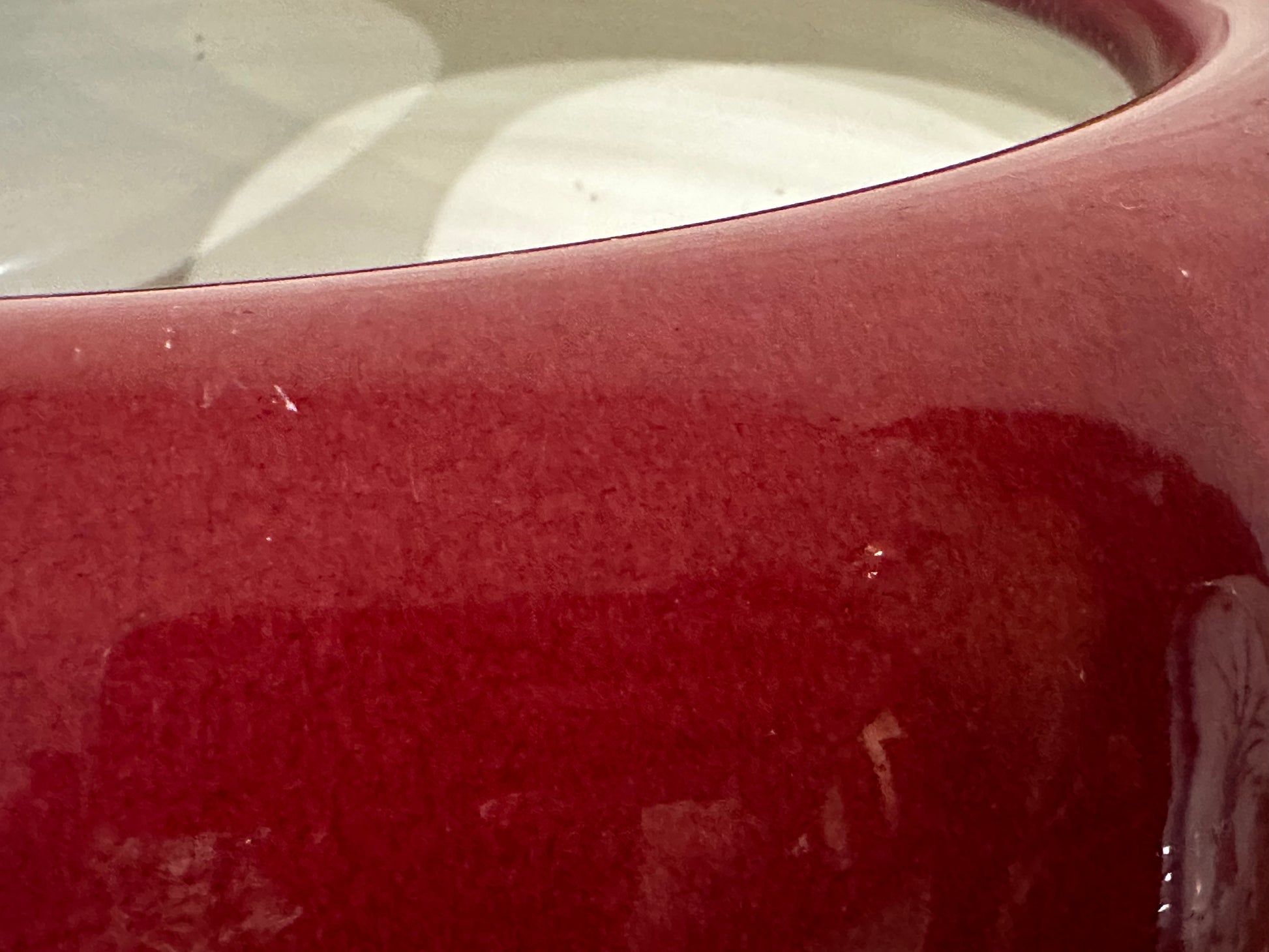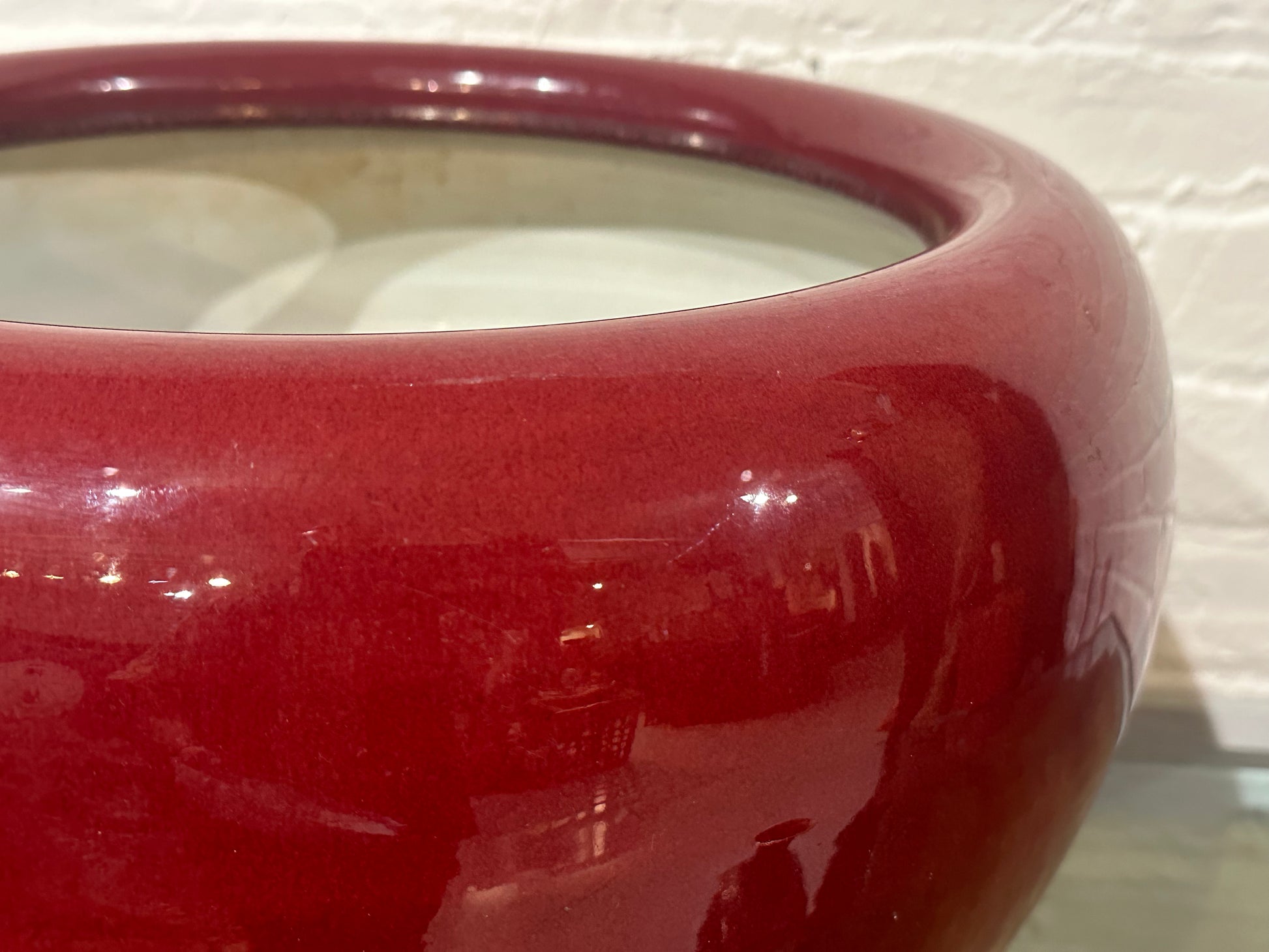 This is a vintage Japanese mid to late Showa era ceramic hibachi with a deep rich red glaze akin to the Chinese ox blood glaze. Traditionally in Japan a hibachi is considered an enclosure for fire, usually hot coals sitting on a bed of ash used to help heat small spaces, lite a pipe or warm water for tea. It is formed with an elegant under turn edge.