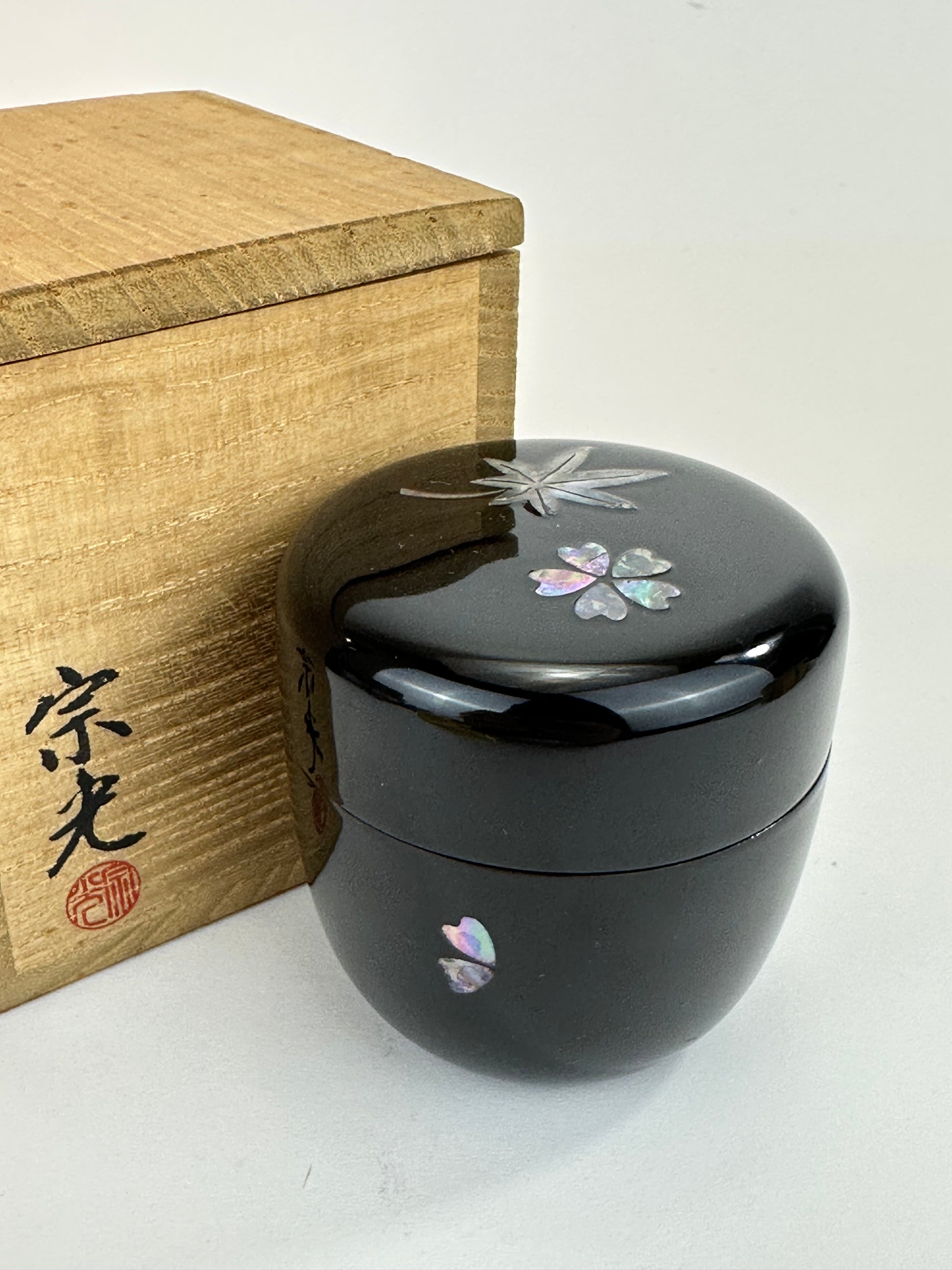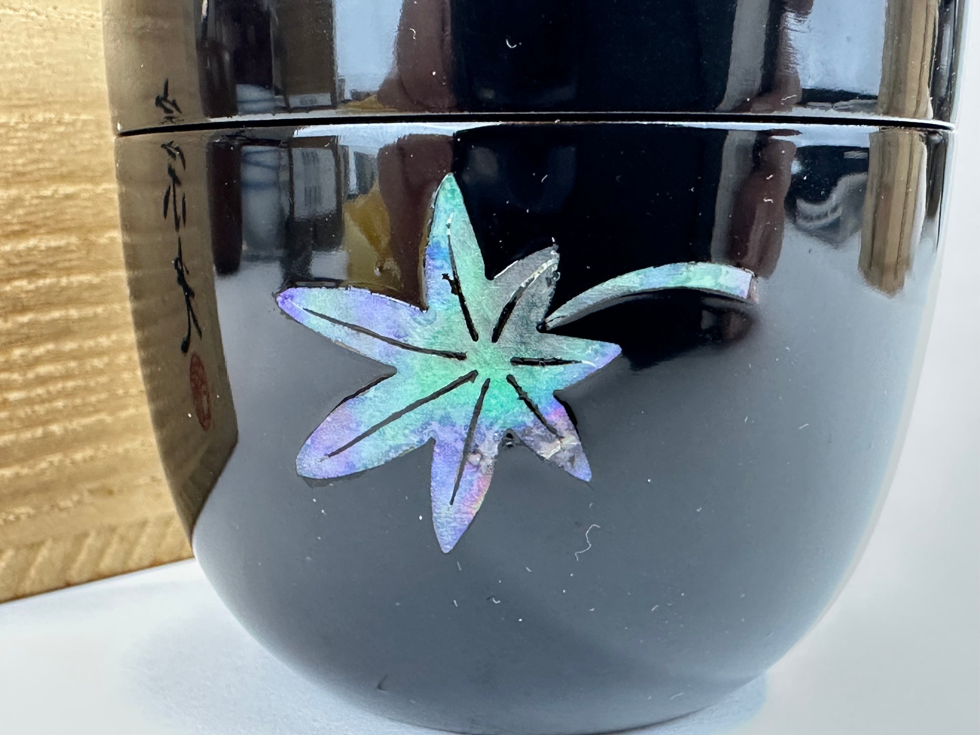 A refined antique Japanese natsume tea caddy finished in deep black lacquer and decorated with delicate raden (mother-of-pearl) inlay. The design features a maple leaf (momiji) and cherry blossom (sakura) motif, a classic seasonal pairing associated with impermanence, beauty, and the passage of time in Japanese aesthetics.