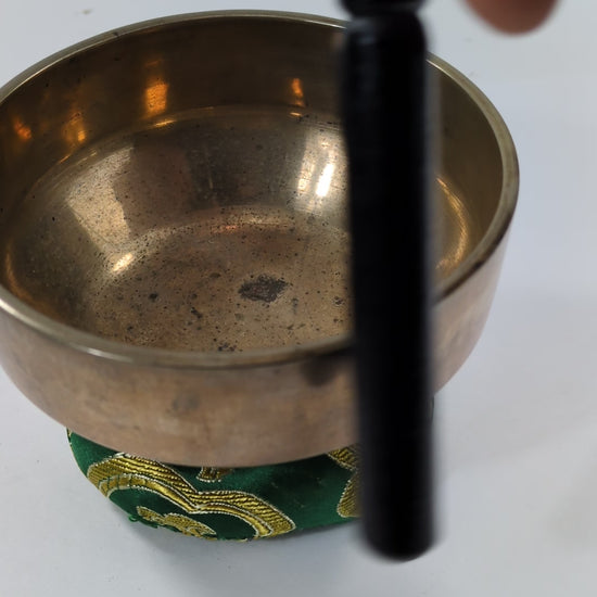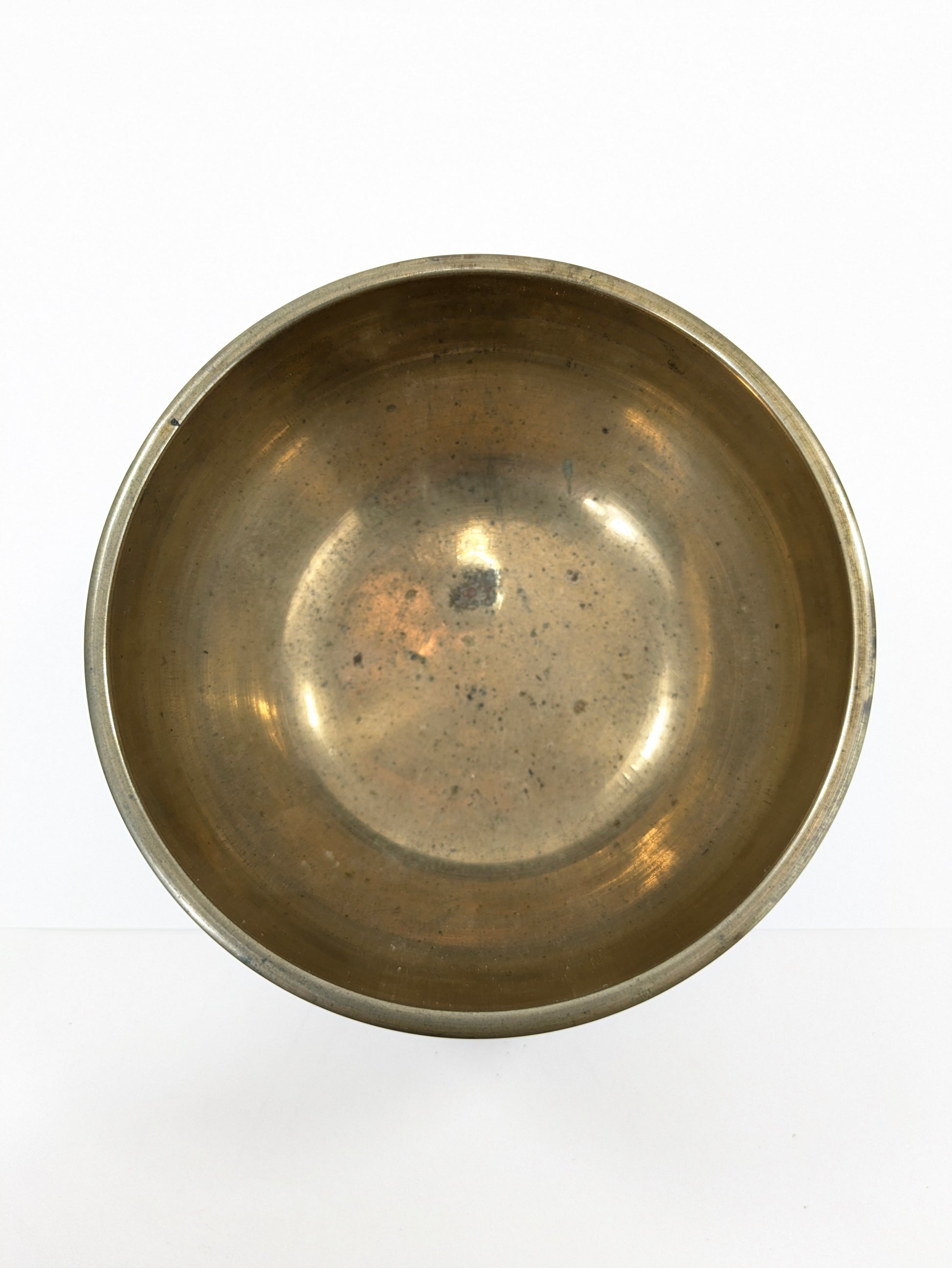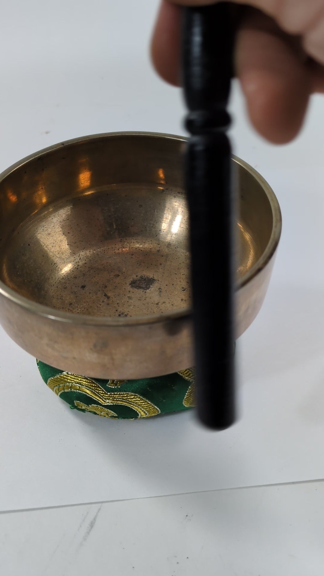 This is a Japanese bronze Orin singing bowl. This style of bowl is favored by Japanese Buddhist sects for its tone. Often used to begin and end meditation sessions or when praying at the family alter. This bowl has a sustained audible ring of over 1 minute