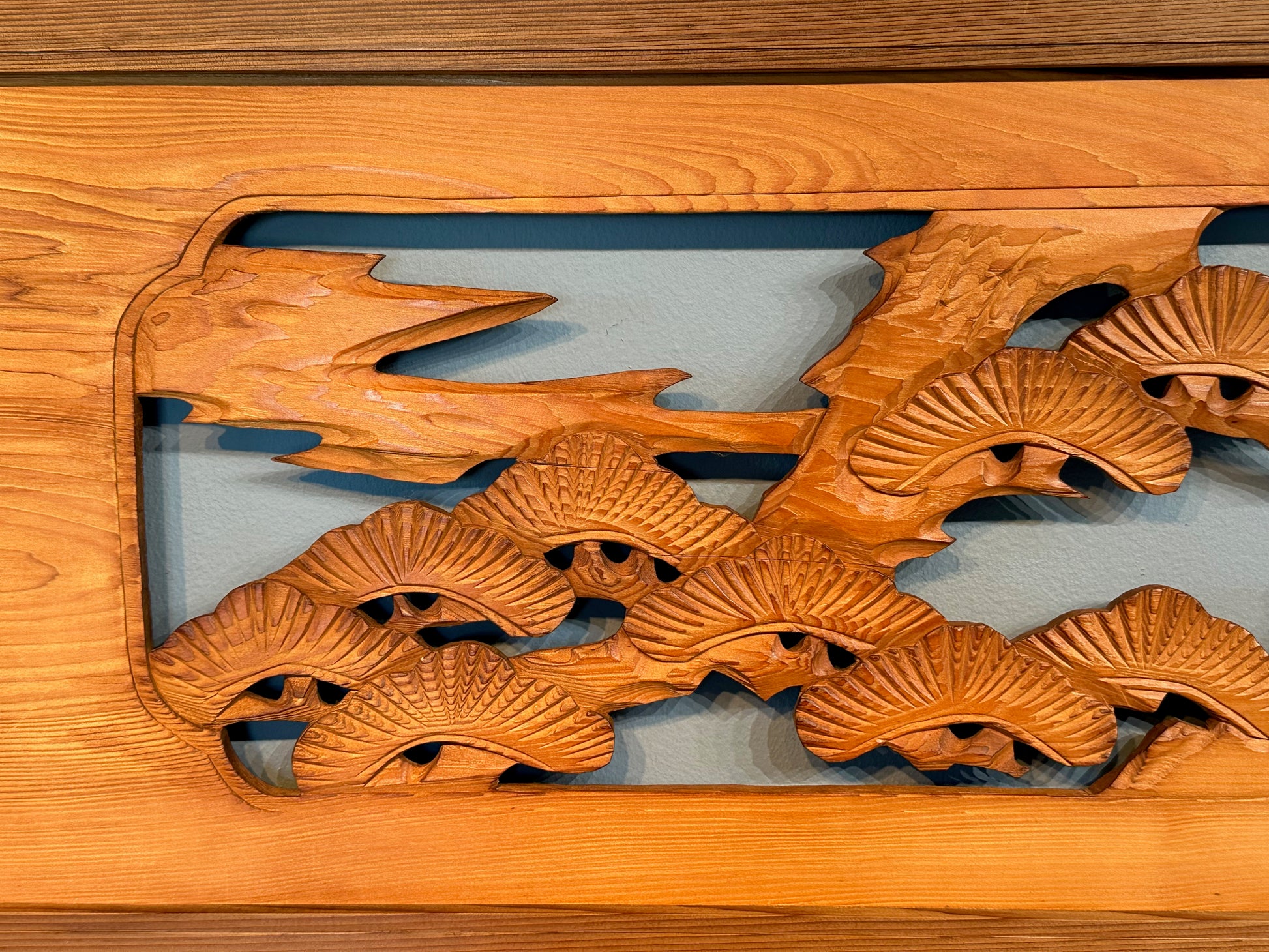 Vintage Japanese Ranma Hawk & Pines Trees Carved Transom Sugi Wood 67"