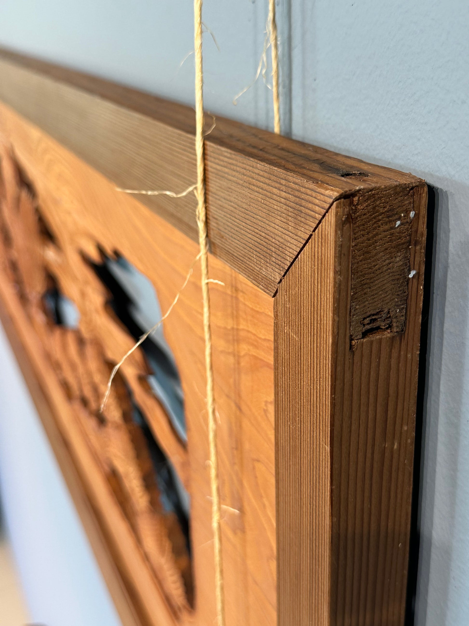 The Japanese Ranma is a decorative and functional carving used above a door way to allow airflow and light to pass though. They are exquisitely hand carved from sugi - Japanese cedar. A typical ranma may be from 1/2" thick to 1 1/2" thick. These two are unusual in that the single pieces of wood carving extends beyond the boundaries of the edges in all directions in amazing detail.