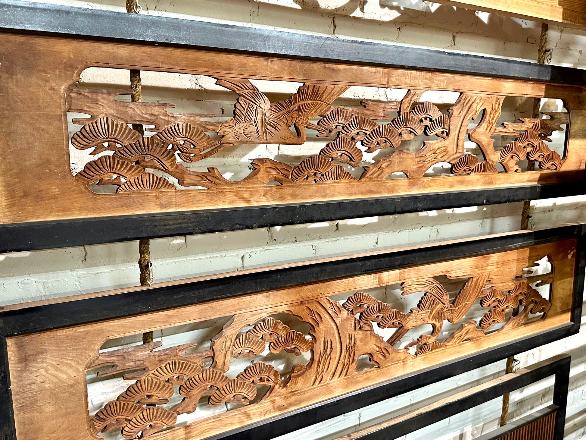 The Japanese Ranma is a decorative and functional carving used above a door way to allow airflow and light to pass though. They are exquisitely hand carved from sugi - Japanese cedar. A typical ranma may be from 1/2" thick to 1 1/2" thick. These two are unusual in that the single pieces of wood carving extends beyond the boundaries of the edges in all directions in amazing detail.