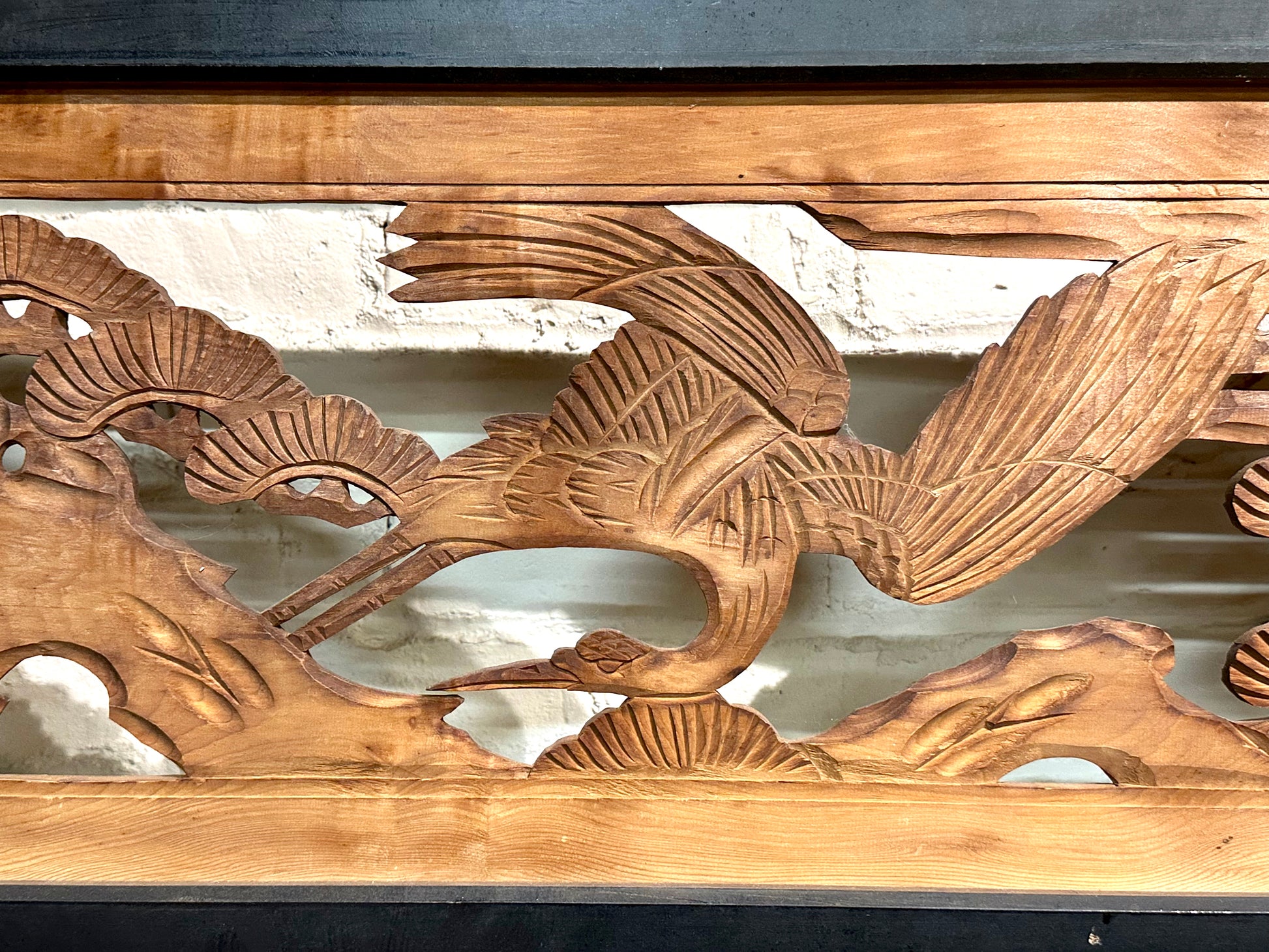 Vintage Japanese Ranma PAIR Cranes & Pines Carved Transom Screen Sugi Wood 67"