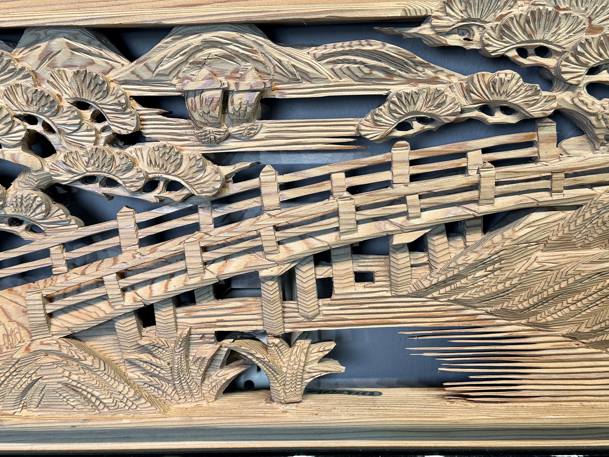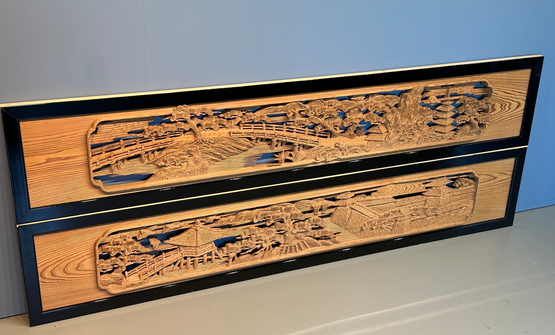 The Japanese Ranma is a decorative and functional carving used above a door way to allow airflow and light to pass though. They are exquisitely hand carved from sugi - Japanese cedar. A typical ranma may be from 1/2" thick to 1 1/2" thick. These two are unusual in that the single pieces of wood carving extends beyond the boundaries of the edges in all directions in amazing detail.