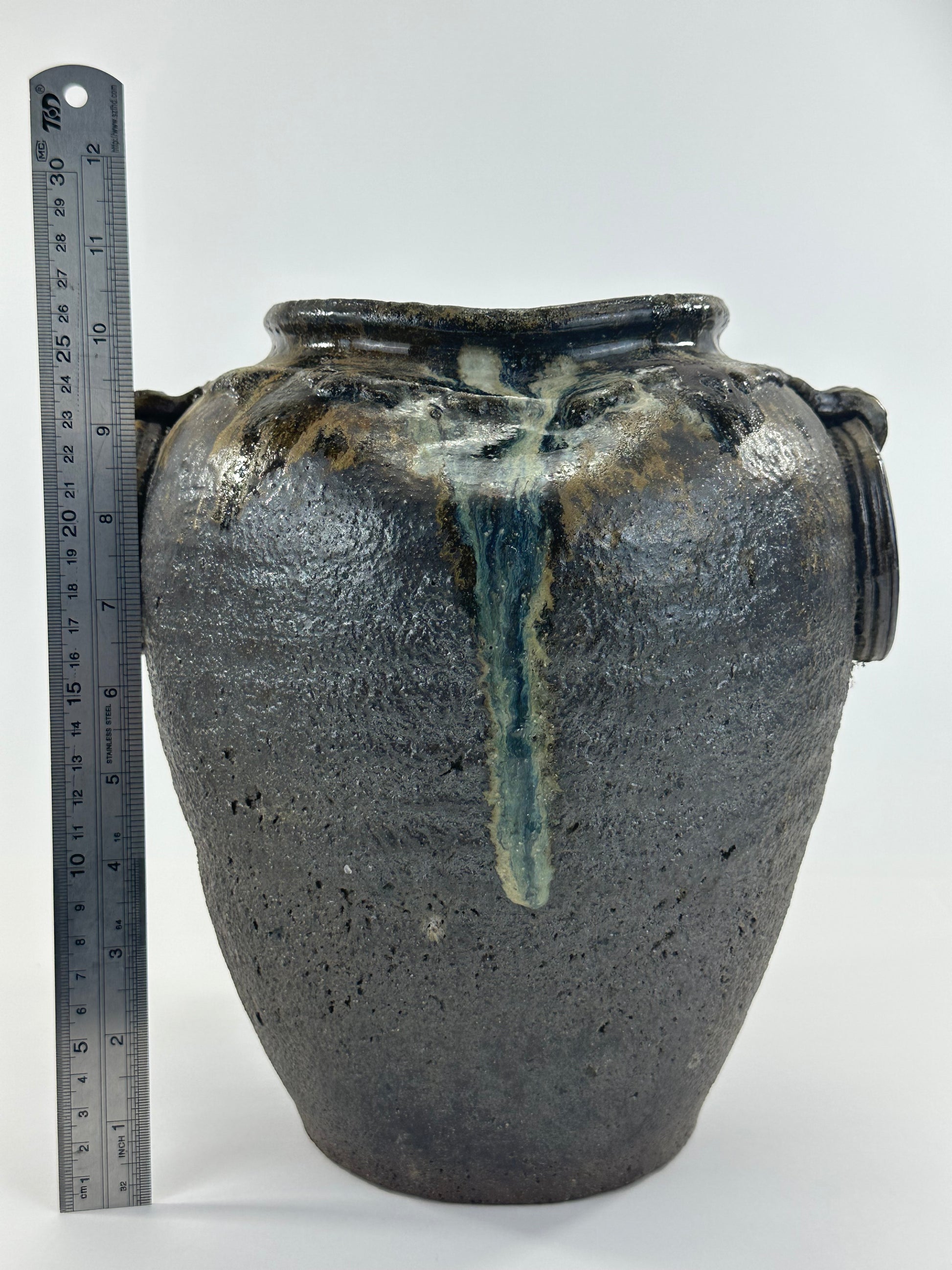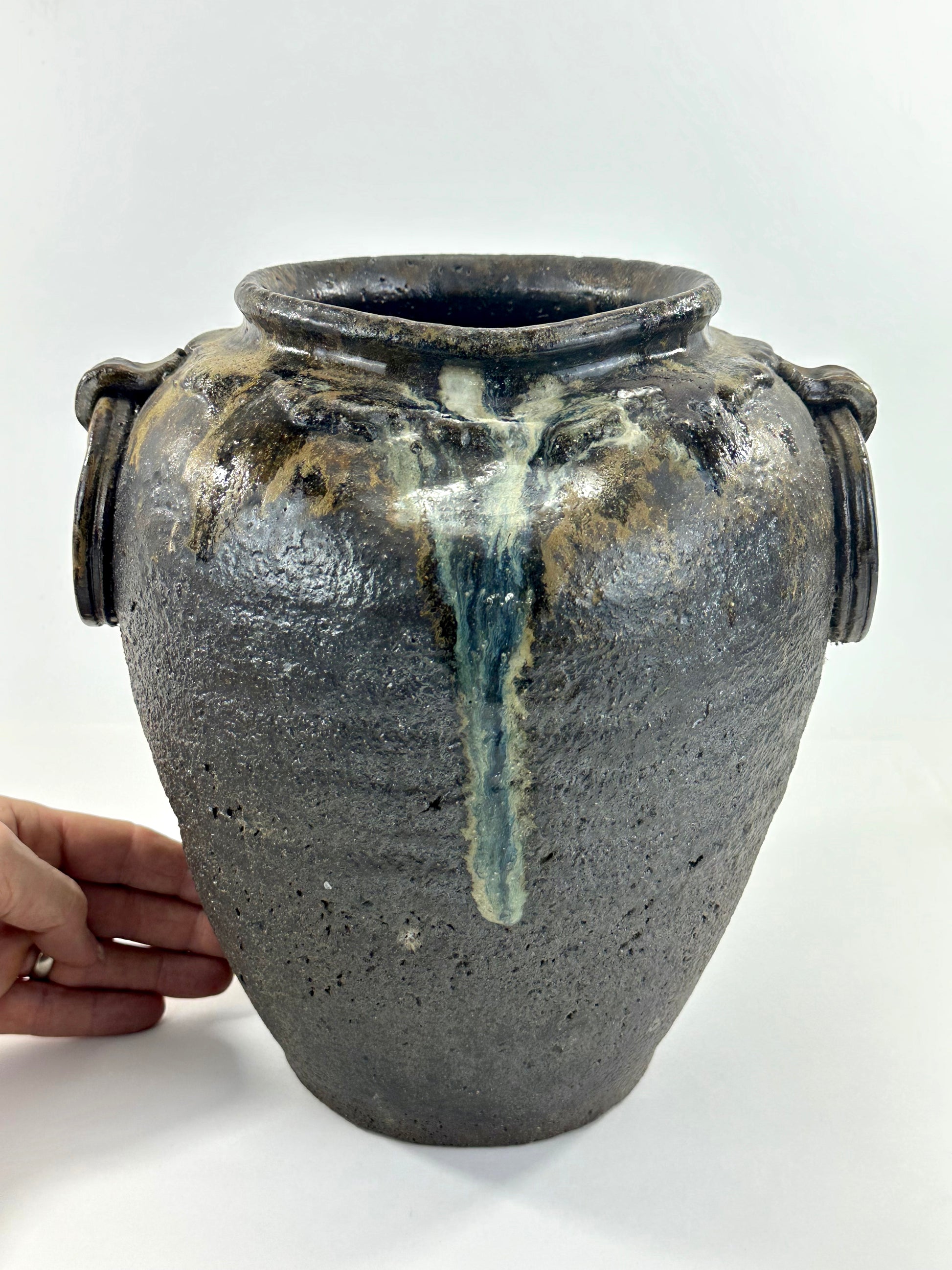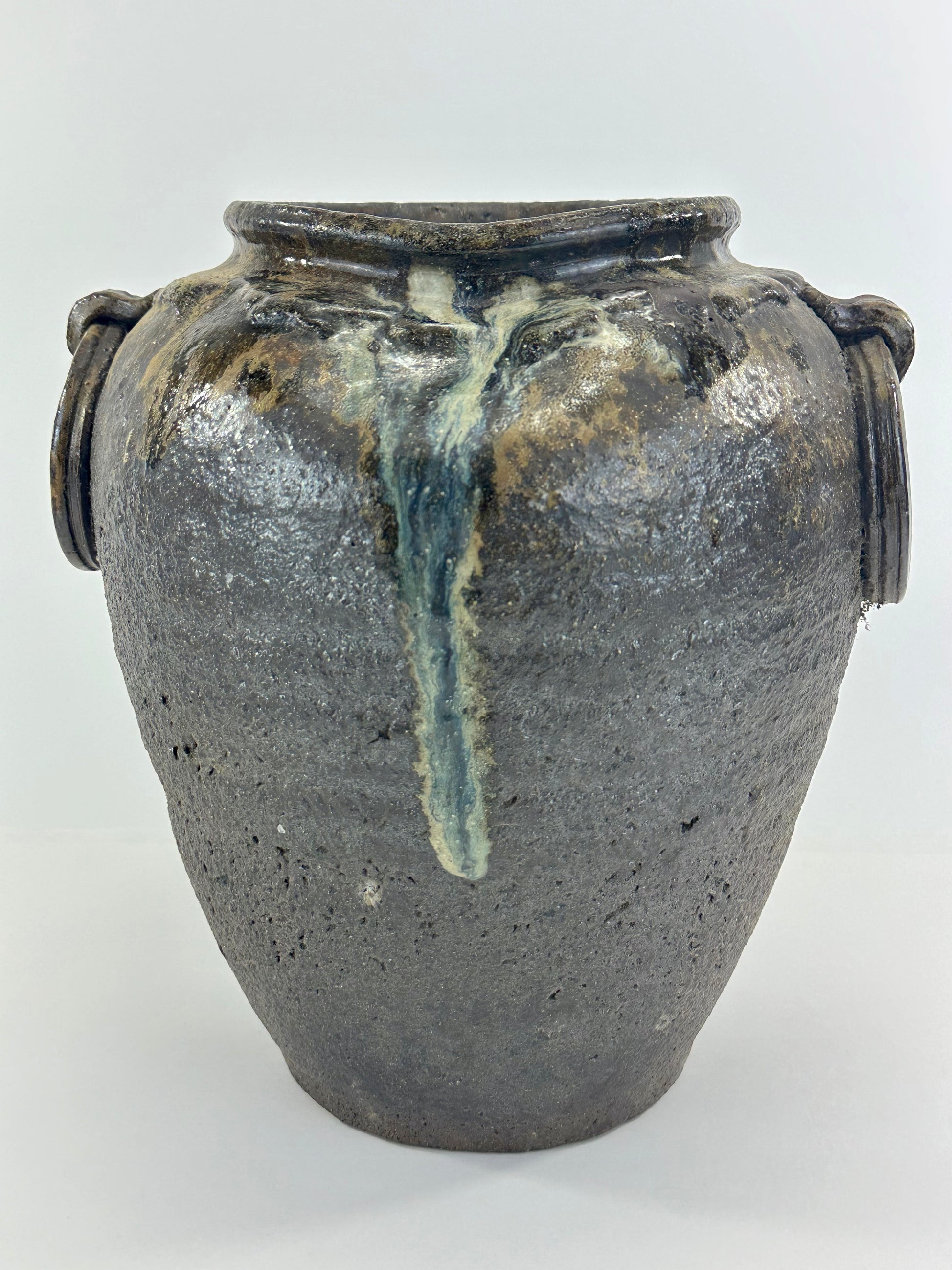 A robust hand-thrown Japanese stoneware vessel with a thick, rustic surface, natural firing texture, and dramatic ivory-blue ash glaze drips cascading from the shoulder toward the base. The exterior surface shows an earthy charcoal tone with feldspathic ash deposits and pitted stoneware body, giving the piece a strong wabi-sabi presence. Two applied side ring handles add a traditional utilitarian form element, suggesting a historic jar style adapted for storage or display.