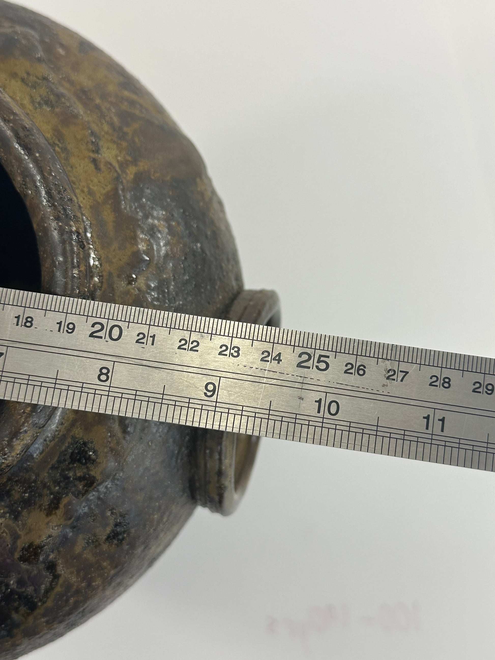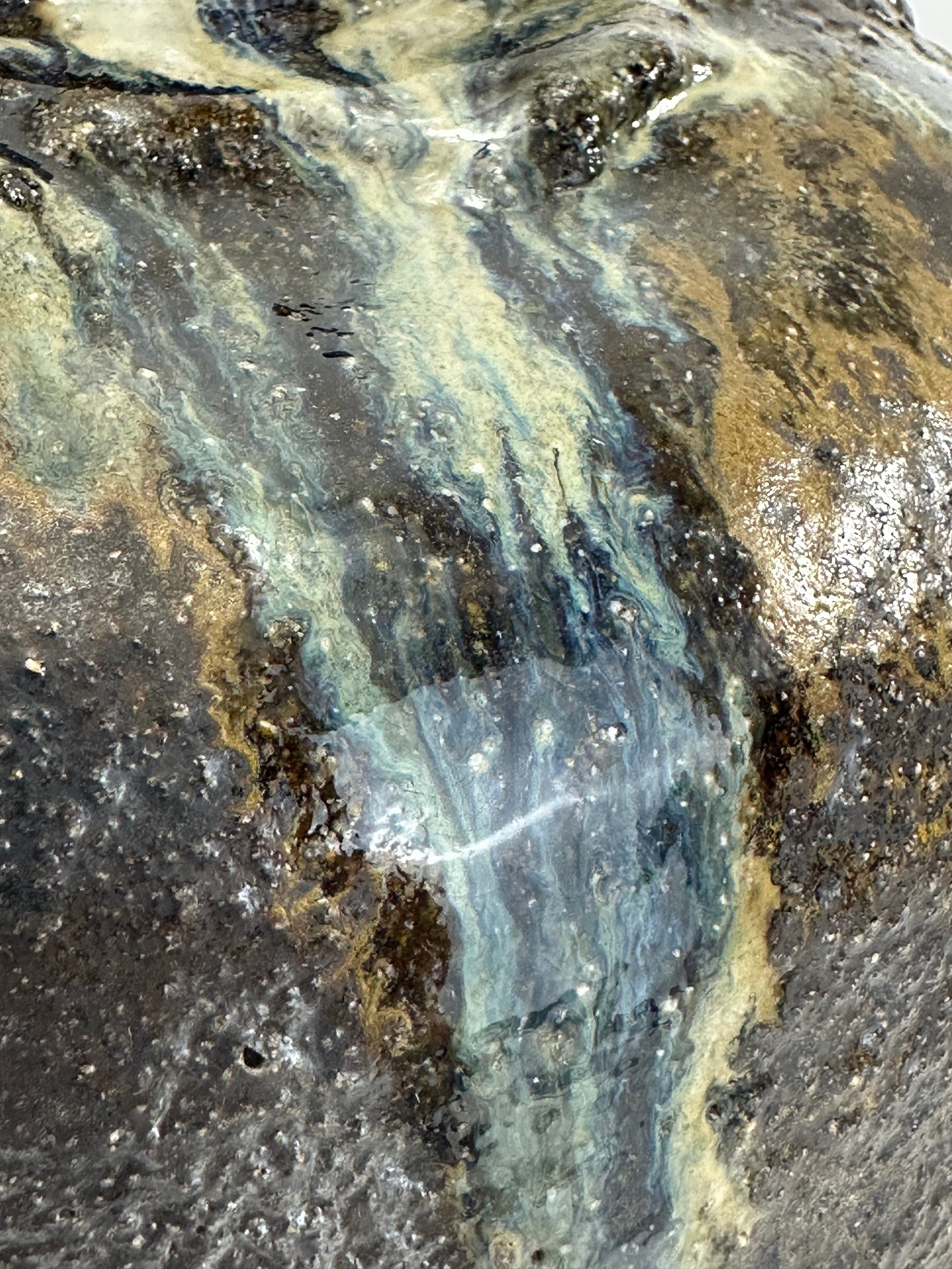 Surface irregularities, firing inclusions, glaze runs, and textural areas are intentional characteristics of the kiln process and contribute to the authenticity and visual depth of the piece.