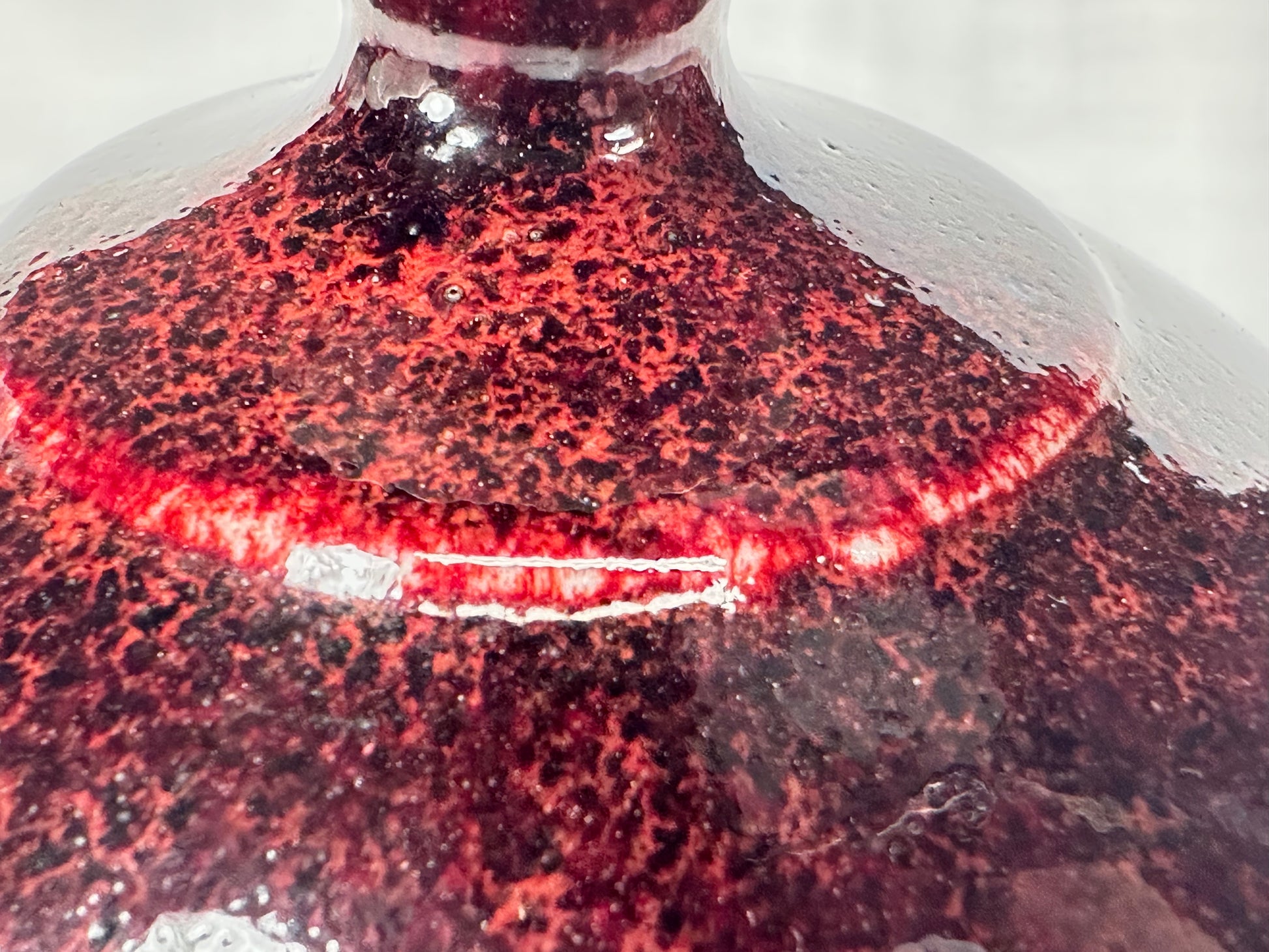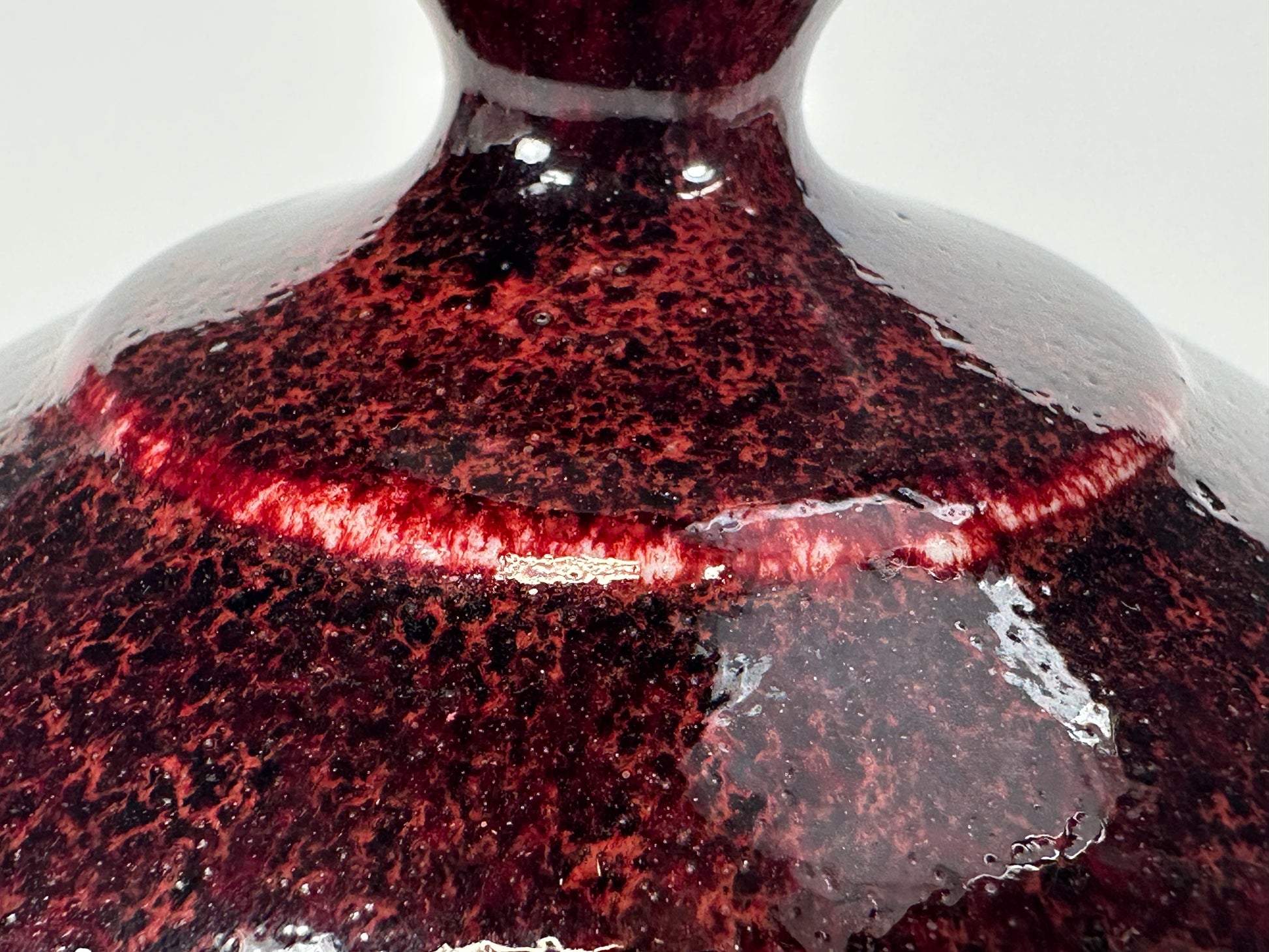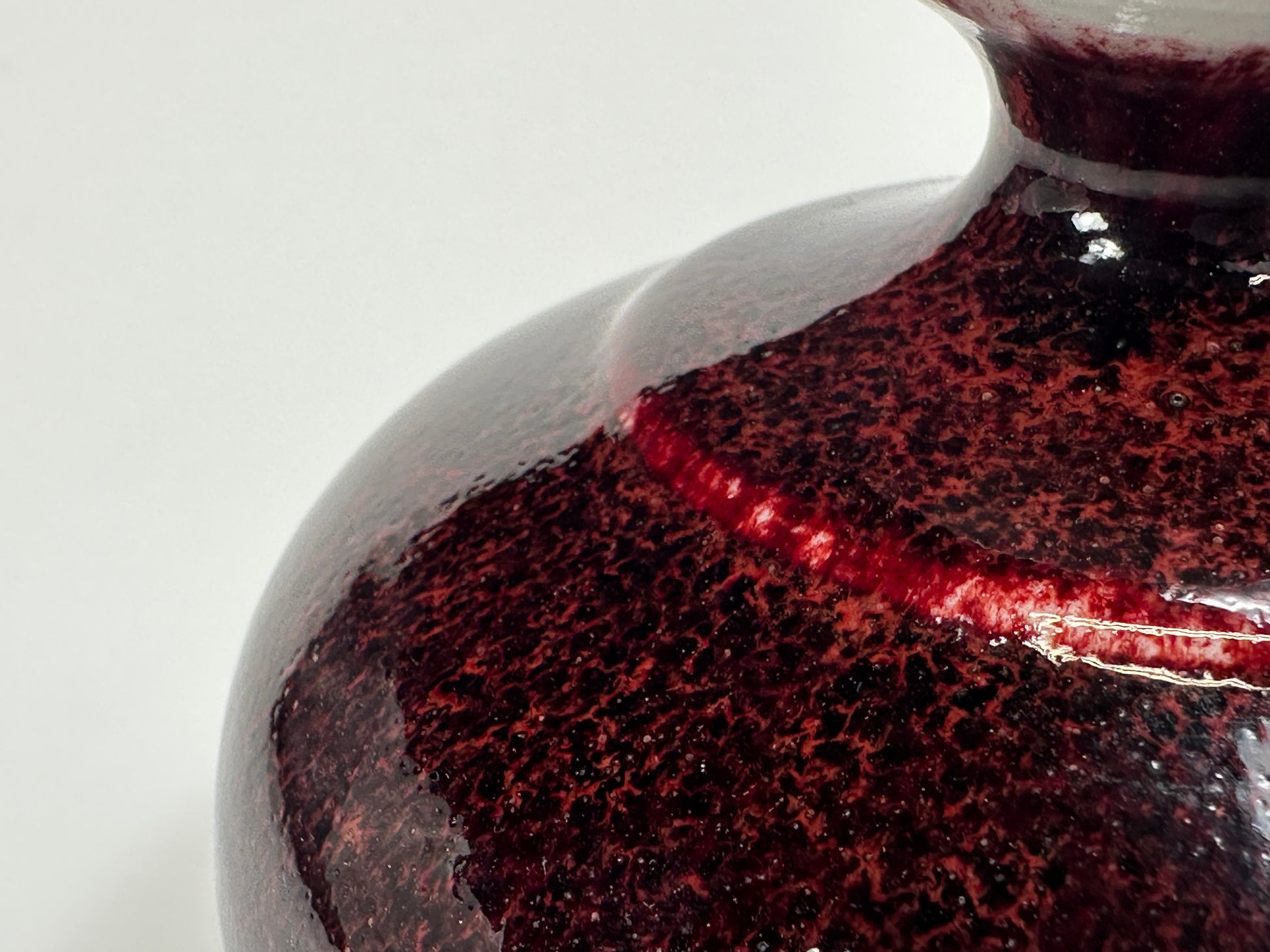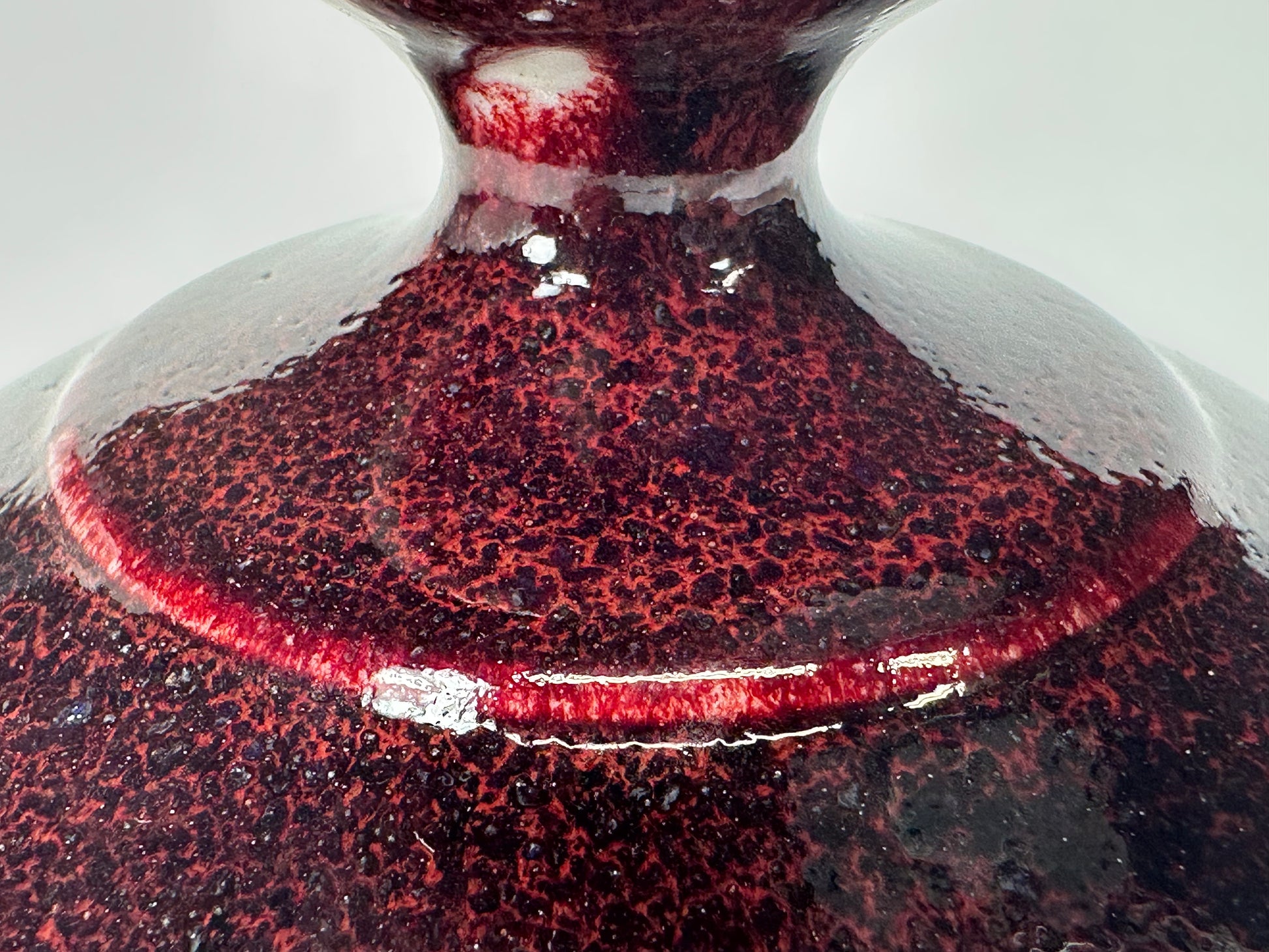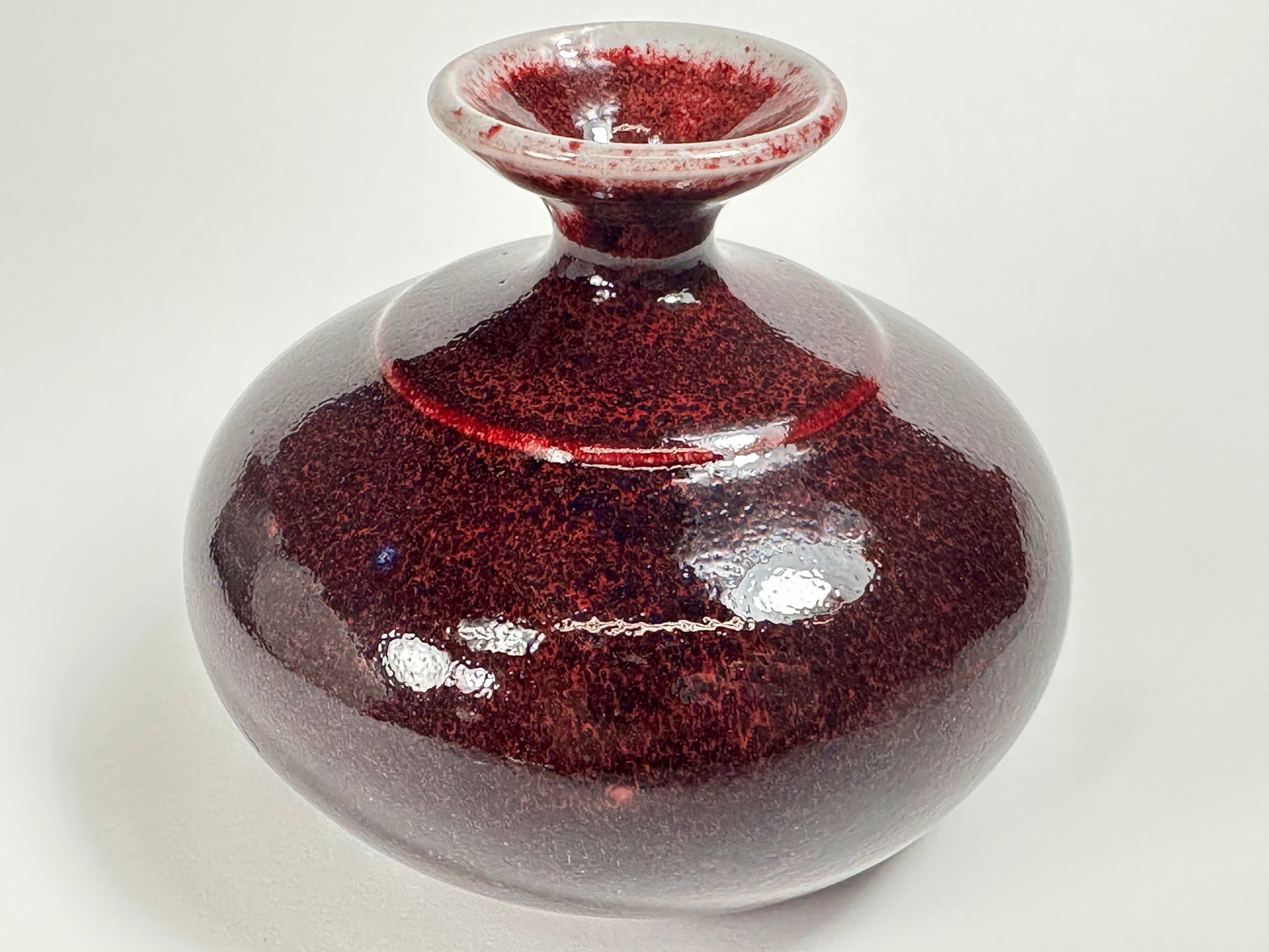 The surface character recalls flambé or yōhen kiln effects, where copper compounds and firing atmosphere produce variegated reds, wine hues, and glaze pooling. This controlled unpredictability is admired in Japanese studio ware for its painterly surface and its close visual dialogue with traditional Chinese copper-red aesthetics. The small scale and elegant proportion make the vase ideal for single-stem ikebana or contemplative interior display.
