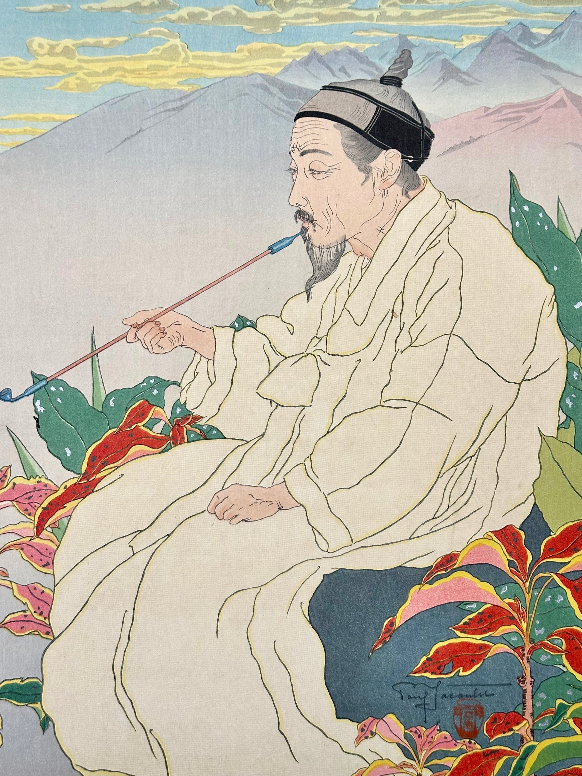 This finely printed work by Paul Jacoulet depicts a seated scholar smoking a long kiseru pipe, set against the mountains of Hokkan-zan (北漢山) near Seoul. The figure is rendered with Jacoulet’s characteristic sensitivity to line and color, combining delicate facial modeling with broad, modern color fields and carefully balanced negative space.