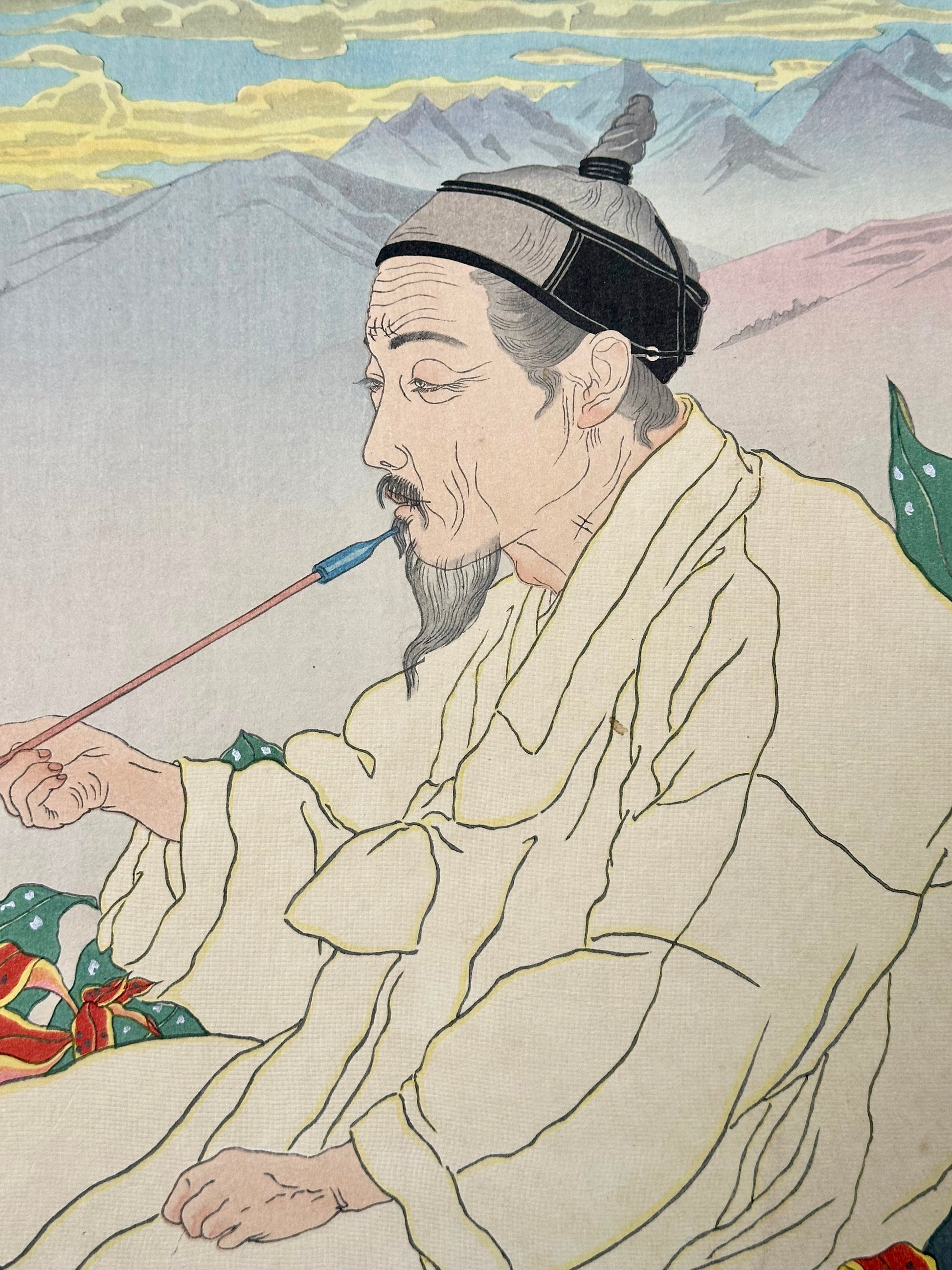 Vintage Japanese woodblock print depicting a scholar smoking a kiseru at Hokkan-zan (北漢山)